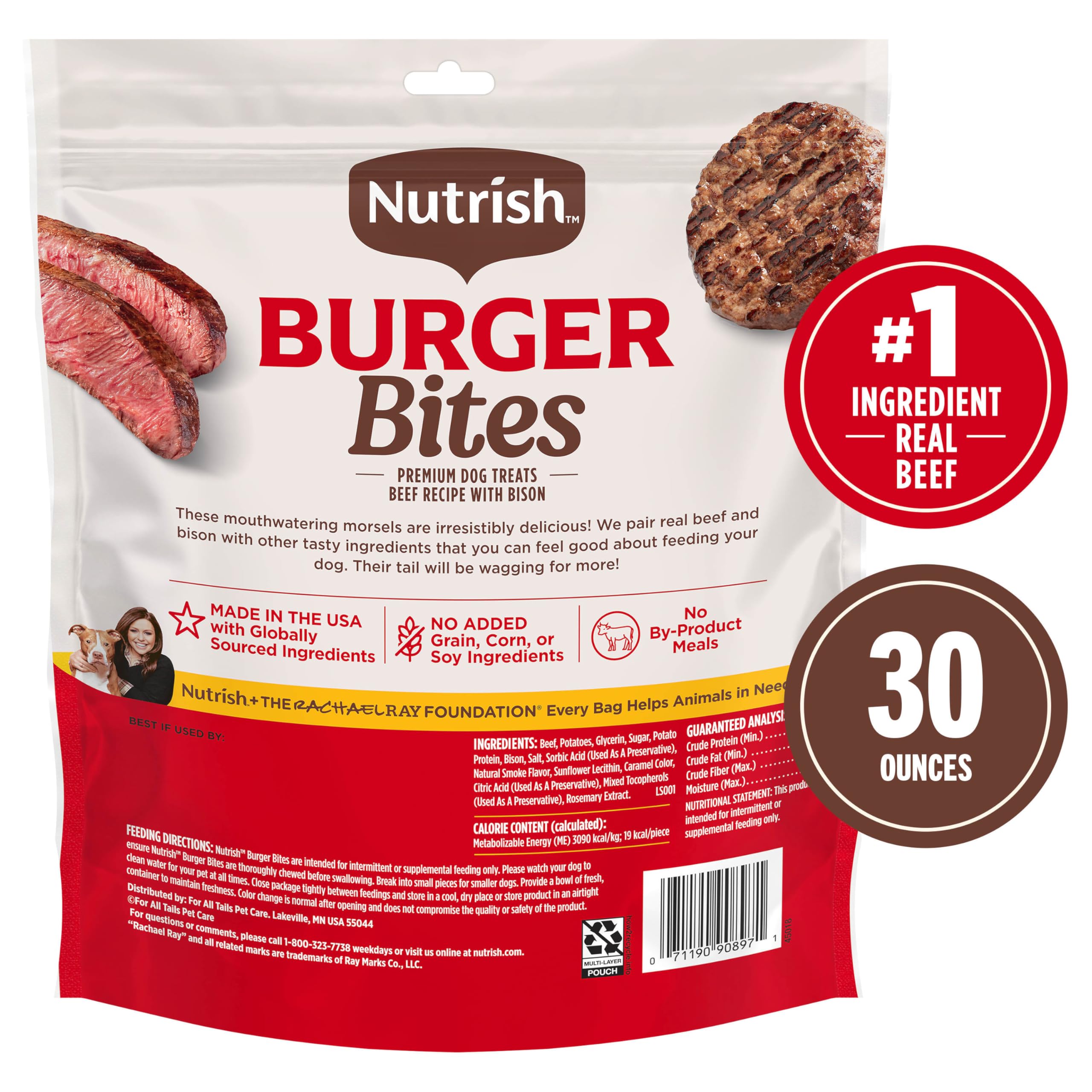 Product Description Your pup deserves pet treats that are as tasty as they are wholesome—like Nutrish Burger Bites Beef Recipe with Bison, great for all dog sizes, life stages and breeds. These soft dog treats are made with real beef as the #1 ingredient and packed with savory flavor that’ll have your dog’s tail wagging. Perfect as training treats for dogs of all sizes, life stages and breeds, everyday treating or just as dog snacks, they’re made in the USA with globally sourced ingredients and contain no added corn or soy ingredients and no by-product meals. Plus, the resealable bag helps keep every treat fresh. Pick up some grain free dog treats today and a portion of your purchase will help animals in need through The Rachael Ray Foundation. Manufacturer Contact Information Post Consumer Brands, 20802 Kensington Blvd, Lakeville, MN 55044