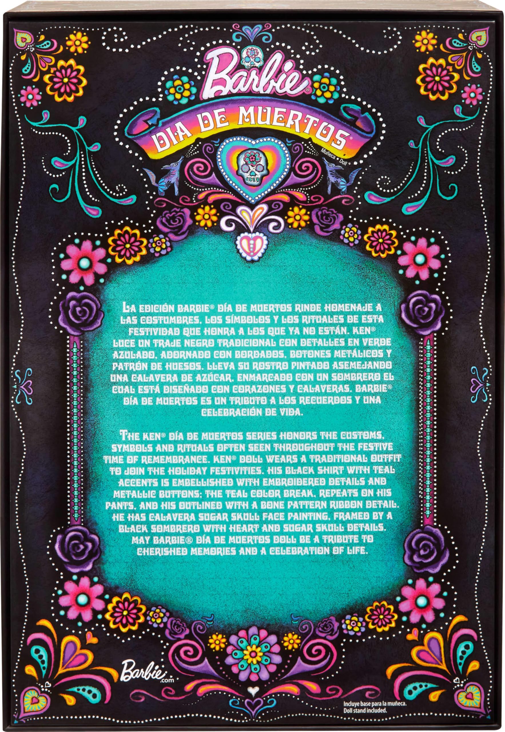 The Barbie Día De Muertos series honors the customs, symbols and rituals often seen throughout this festive time of remembrance. Ken doll cuts a striking figure in a satiny black shirt and pants with sky-blue color blocking and premium details. A glossy sombrero, detailed belt and calavera face paint enhance his distinguished look. May the 2024 Día De Muertos Ken doll become a treasured keepsake and holiday tradition! Includes doll stand and Certificate of Authenticity. Doll cannot stand alone. Colors and decorations may vary.