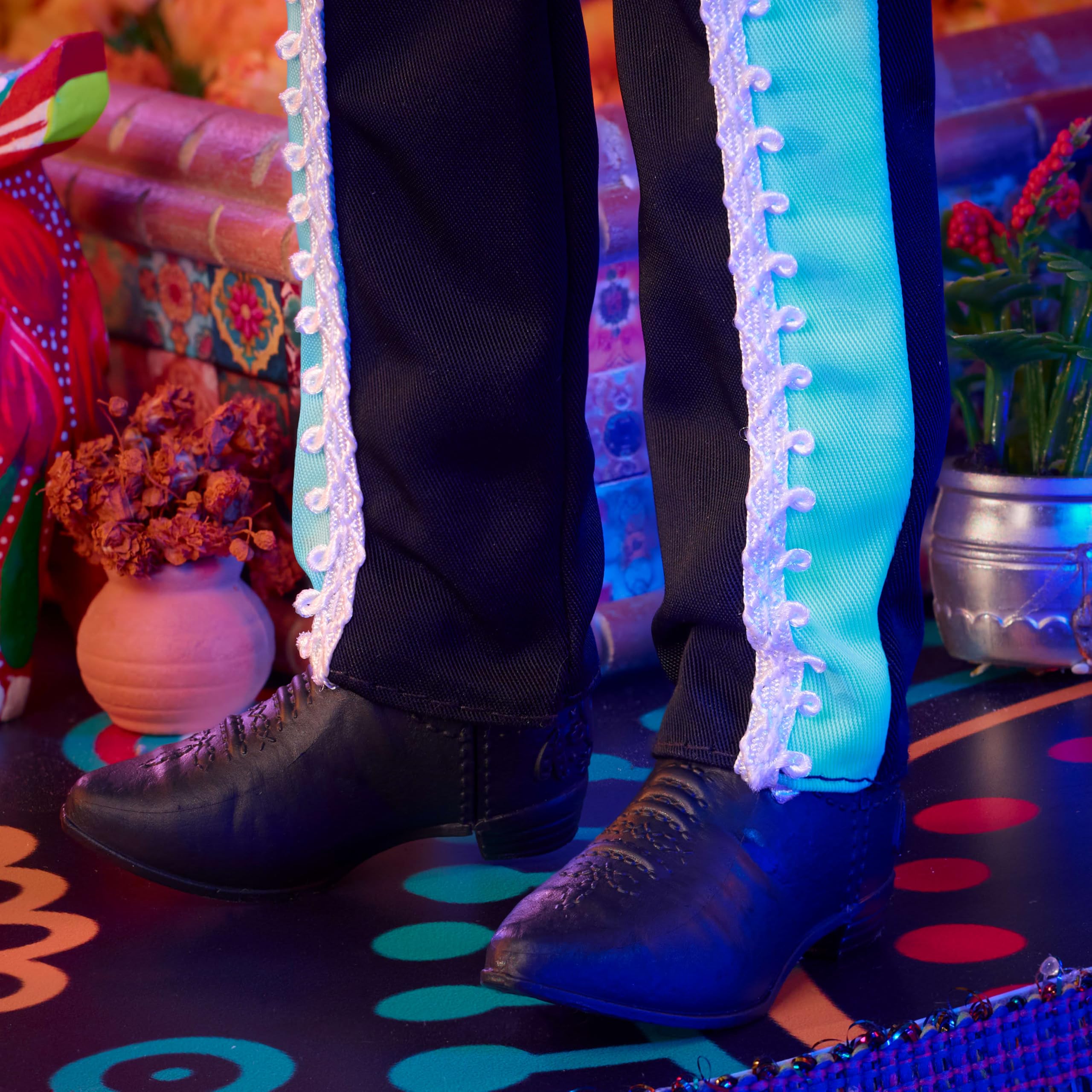 A glossy black sombrero accentuates his blue-toned calavera face paint, while a sugar skull belt and matching shoes complement his festive look.
