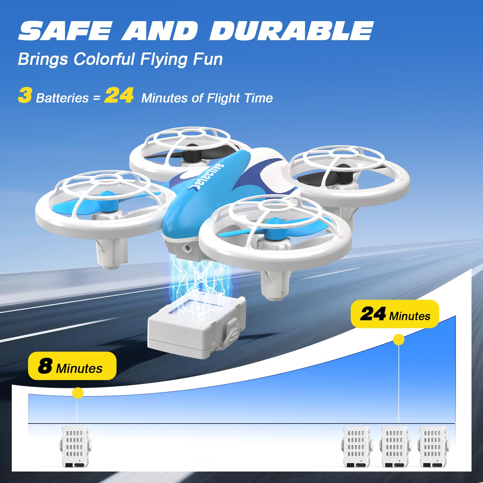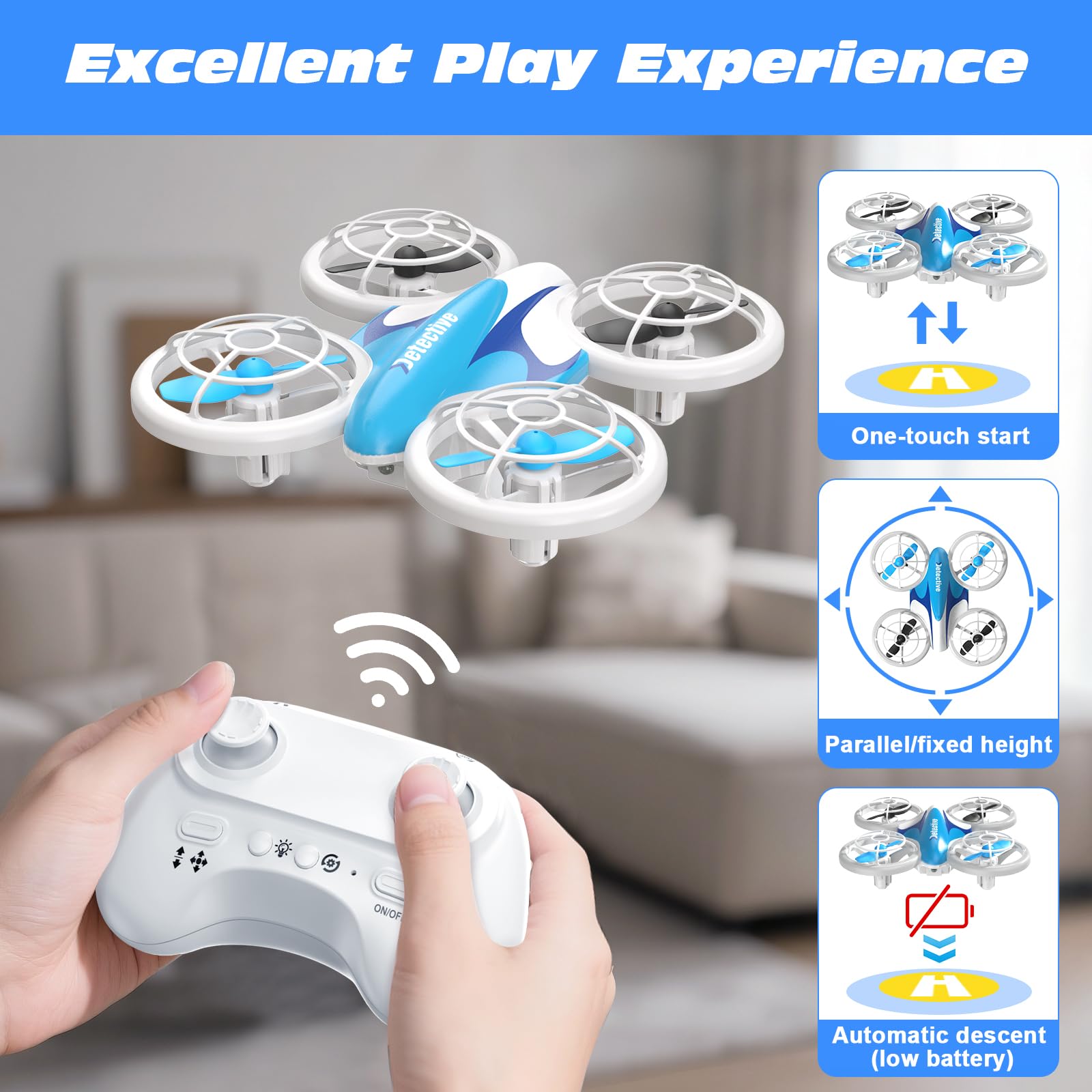 【Beginner-Friendly & Safe】 Equipped with one-key take-off/landing, altitude hold, and headless mode, this kids drone makes flying simple for beginners. Full propeller protection and low-battery auto landing ensure safe and worry-free flights indoors or outdoors.