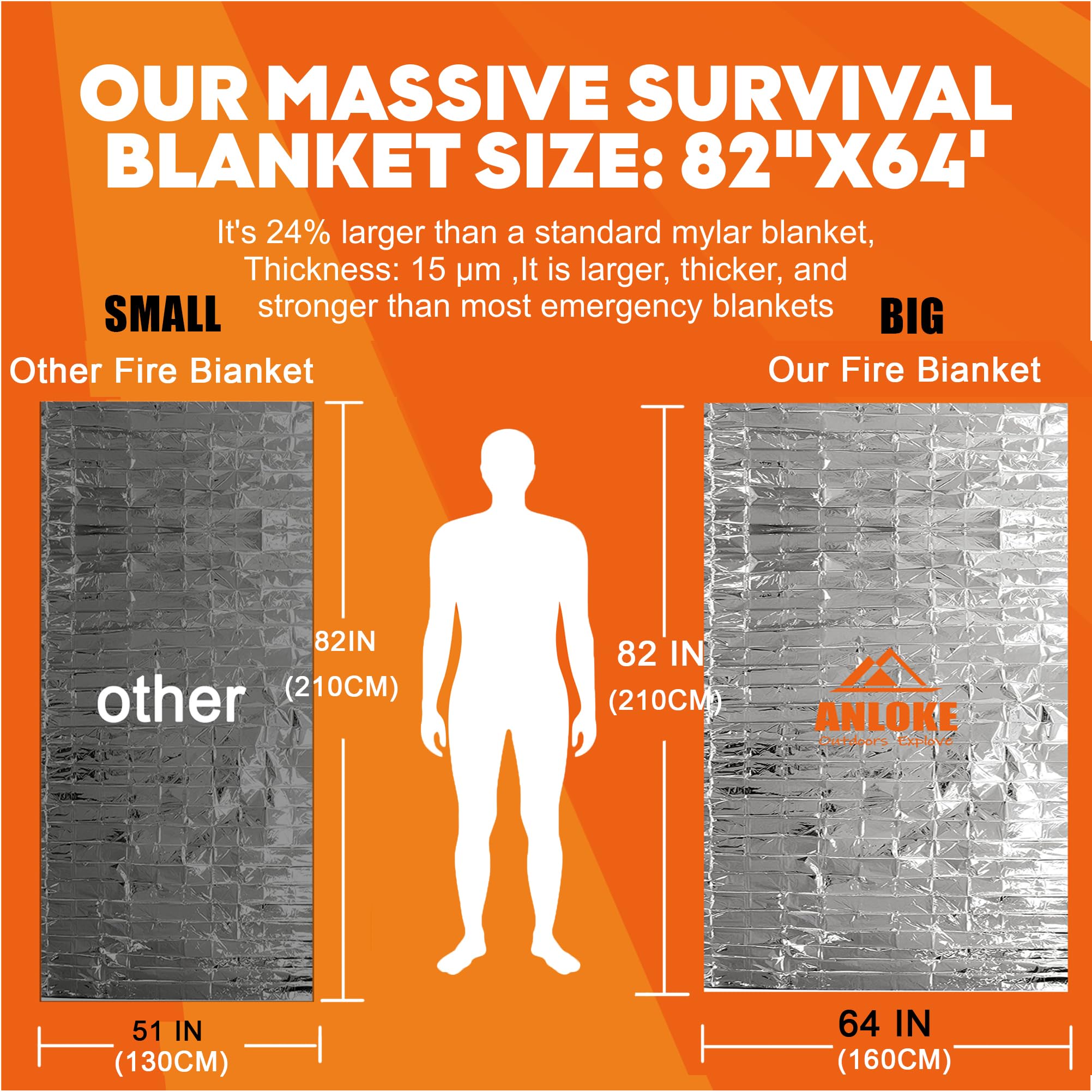 ★UPGRADED DESIGN★--Our massive Survival Blanket size: 82"x64'',It's 24% larger than a standard mylar blanket, Thickness: 15 μm ,It is larger, thicker, and stronger than most emergency blankets ,Can covers the body better and conserving body heat