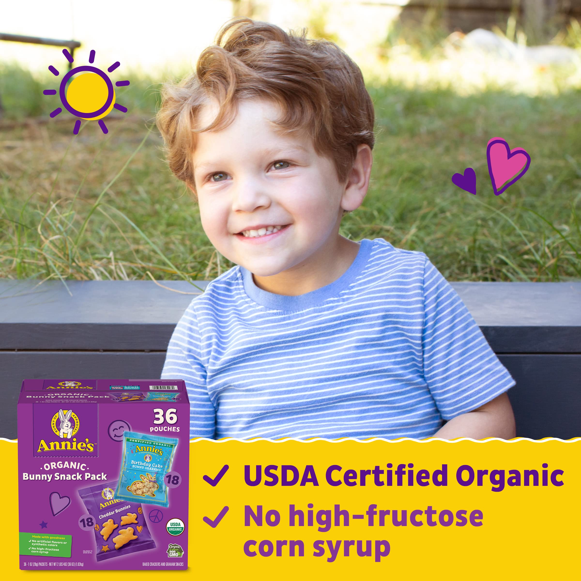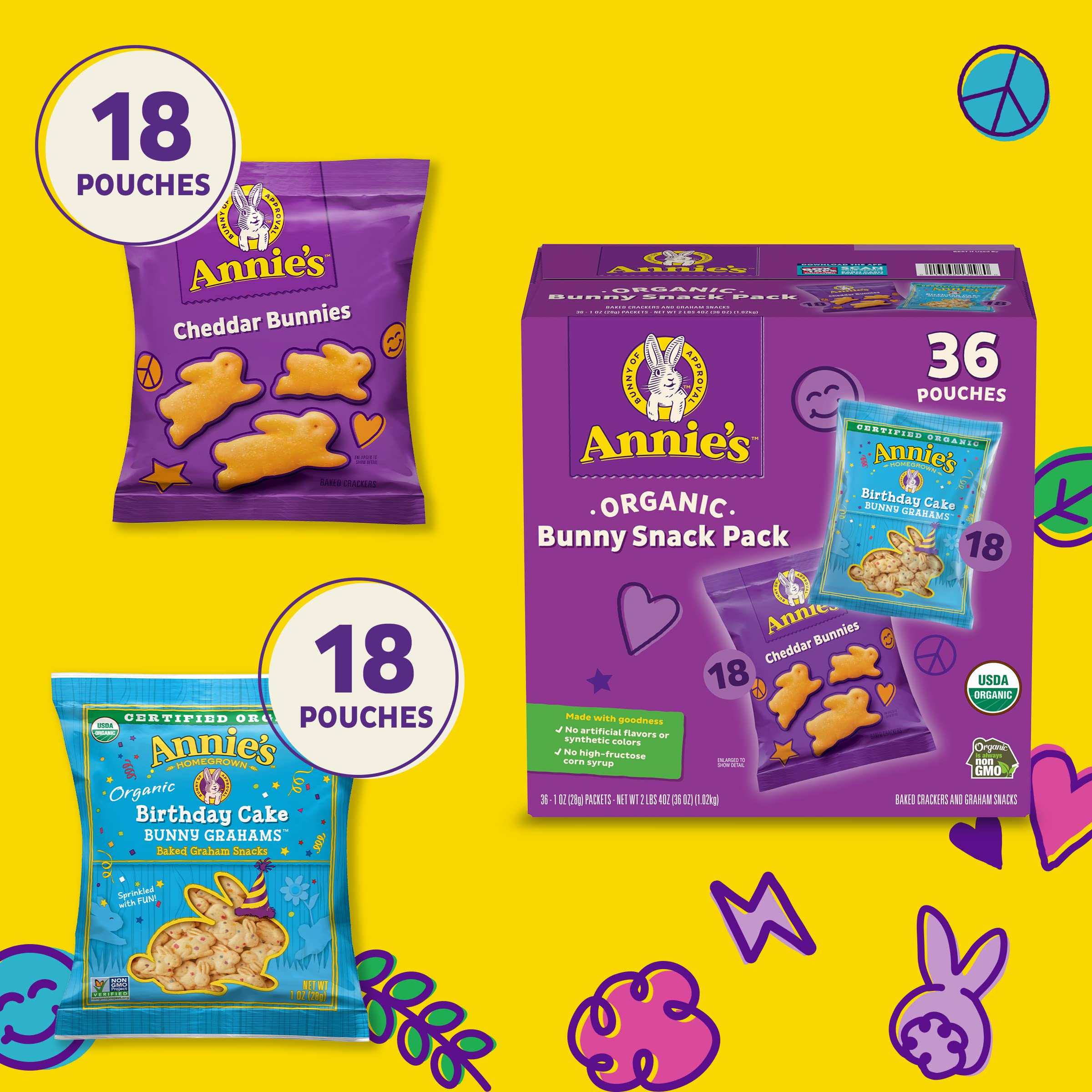 CONTAINS: One 36 oz Annie's Organic Bunny Snack Pack with Original Cheddar Bunnies and Birthday Cake Bunny Grahams; 36 pouches total