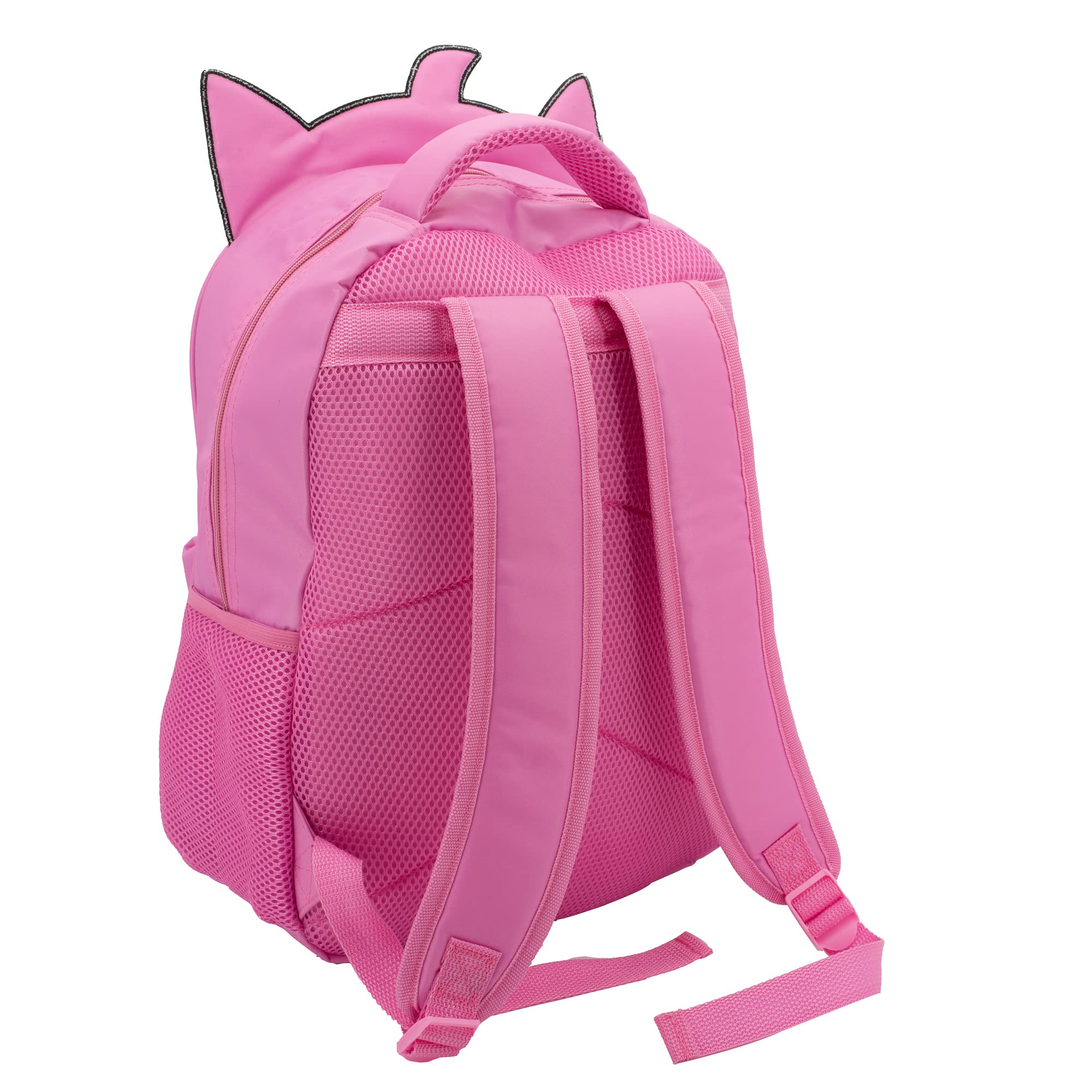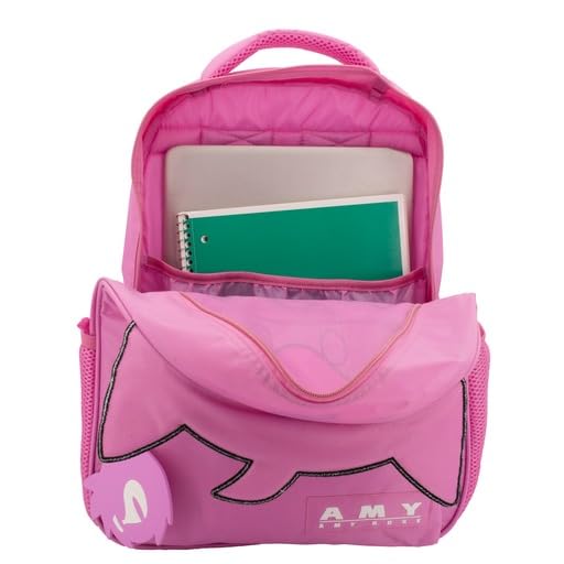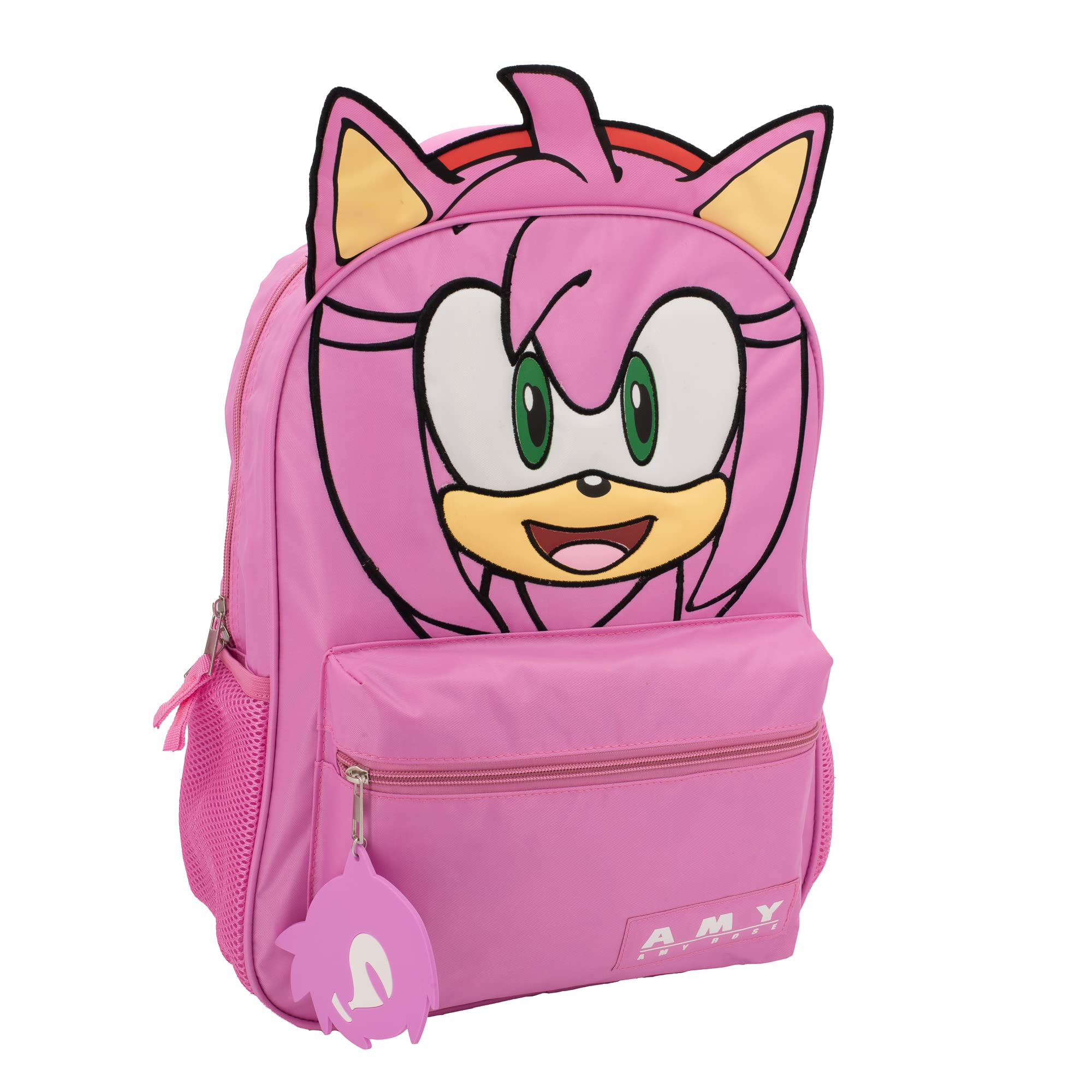AMY ROSE BACKPACK: This fun novelty backpack is perfect for any gaming fan. It features a big face Amy Rose The Hedgehog on the front panel with 3D quills & ears, inkjet print & embroidered details. It includes a 3D rubber molded Sonic zipper pull on the front pocket.