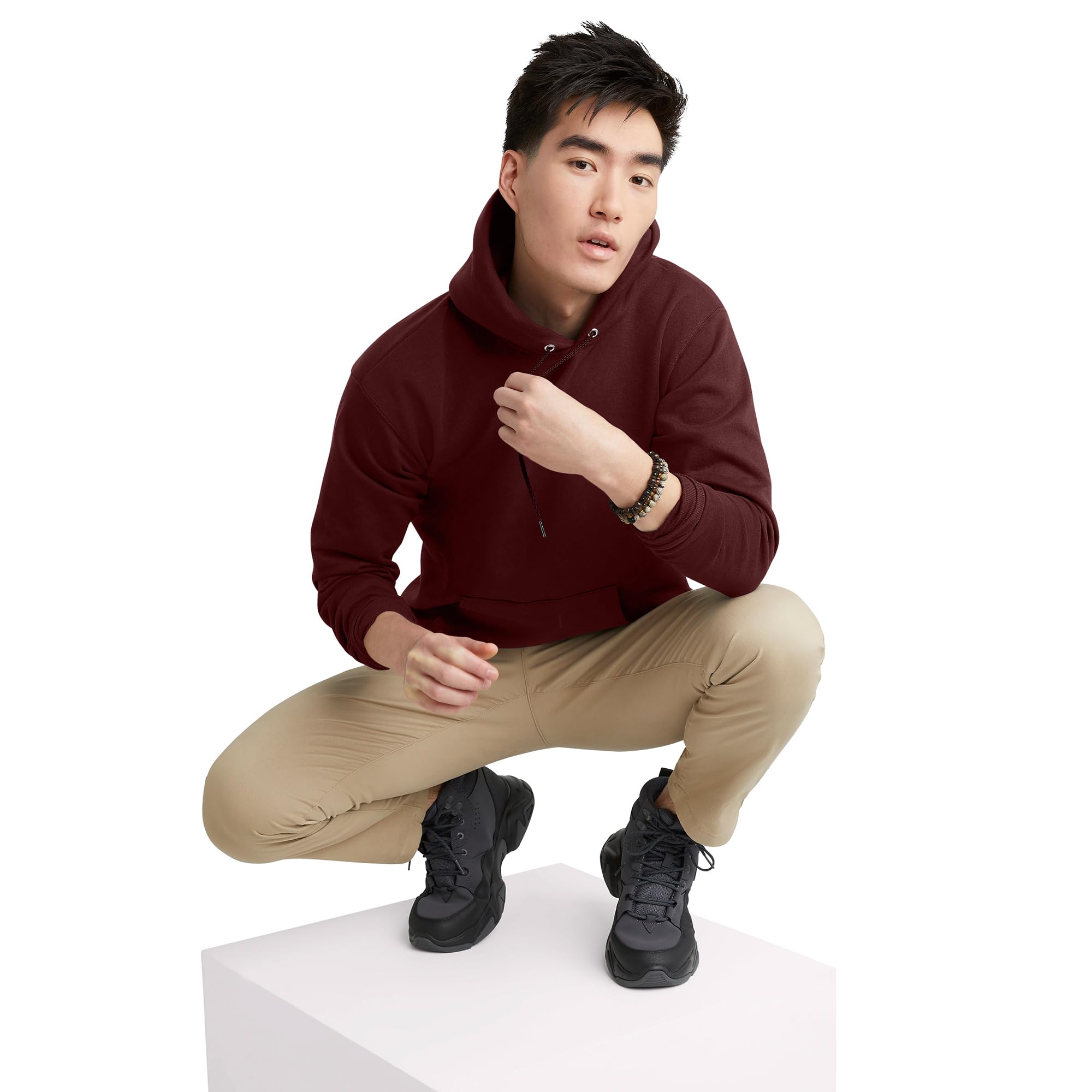 Description Why fuss with a zipper just pull this medium weight 7.8-oz fleece hoodie over your head and get going. You'll want to wear these comfortable sweats every chance you get. After all, they come in plush, midweight cotton-blend fleece that’s low-pill, super-soft, and made with up to 5% polyester from recycled plastic bottles.