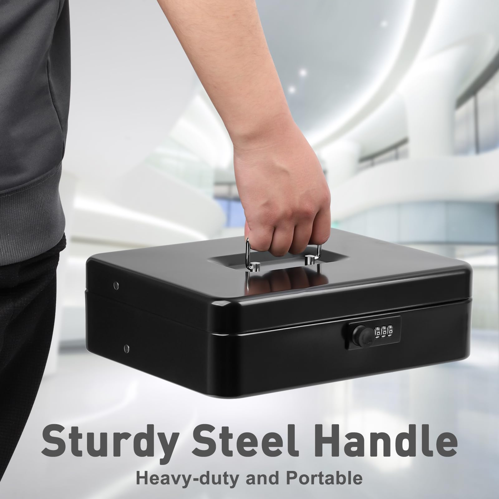 COMBINATON LOCK: Cash box has a advanced 3-number combination lock to keep valuables safe. Easy to use: The key is easy to operate,can open it no problem with one hand.A widened handle makes for easy storage and transport.