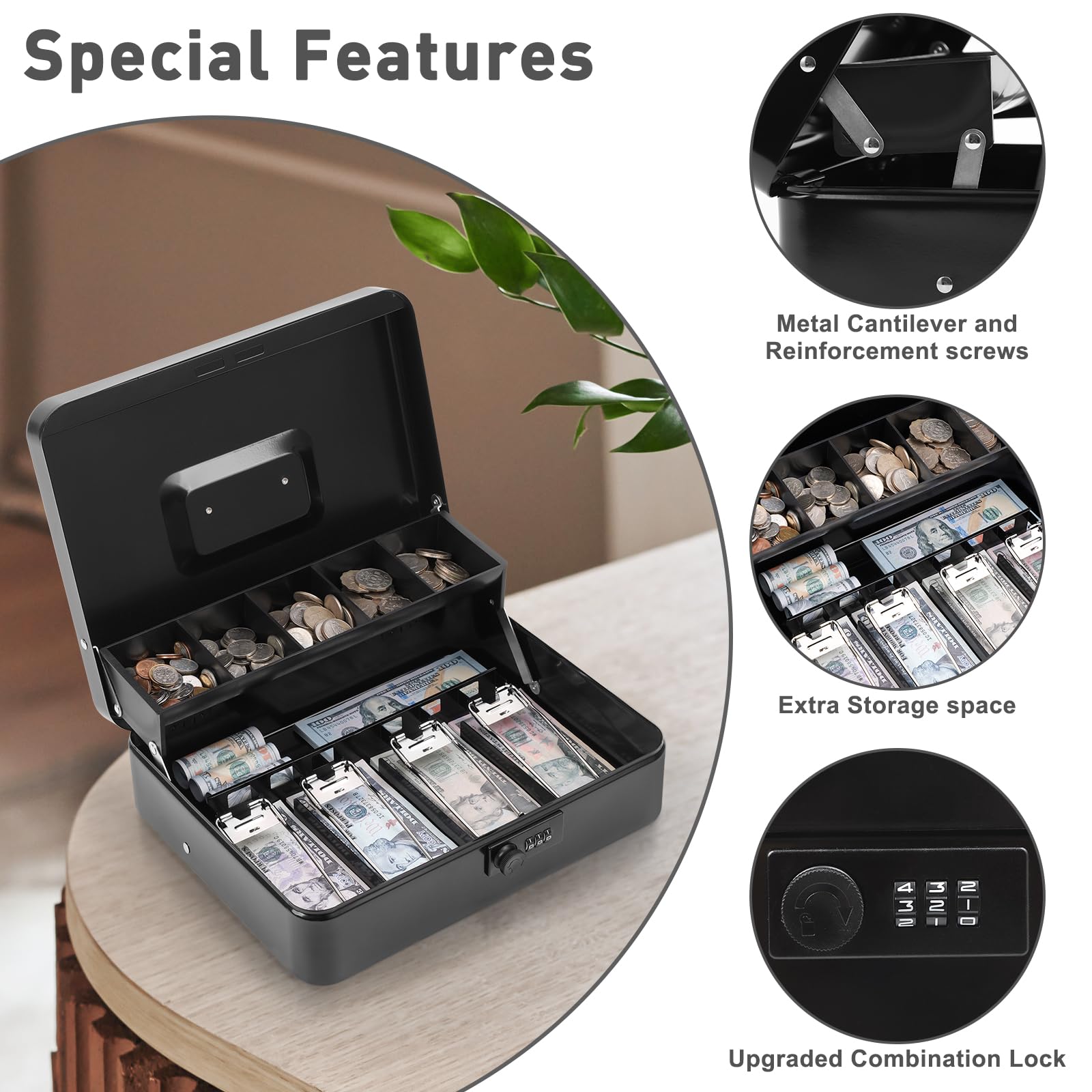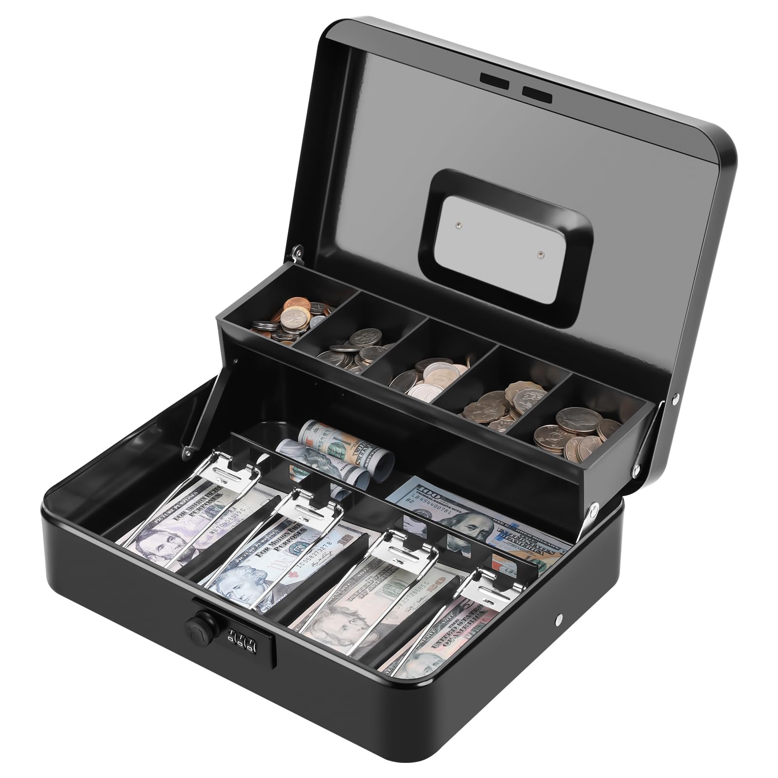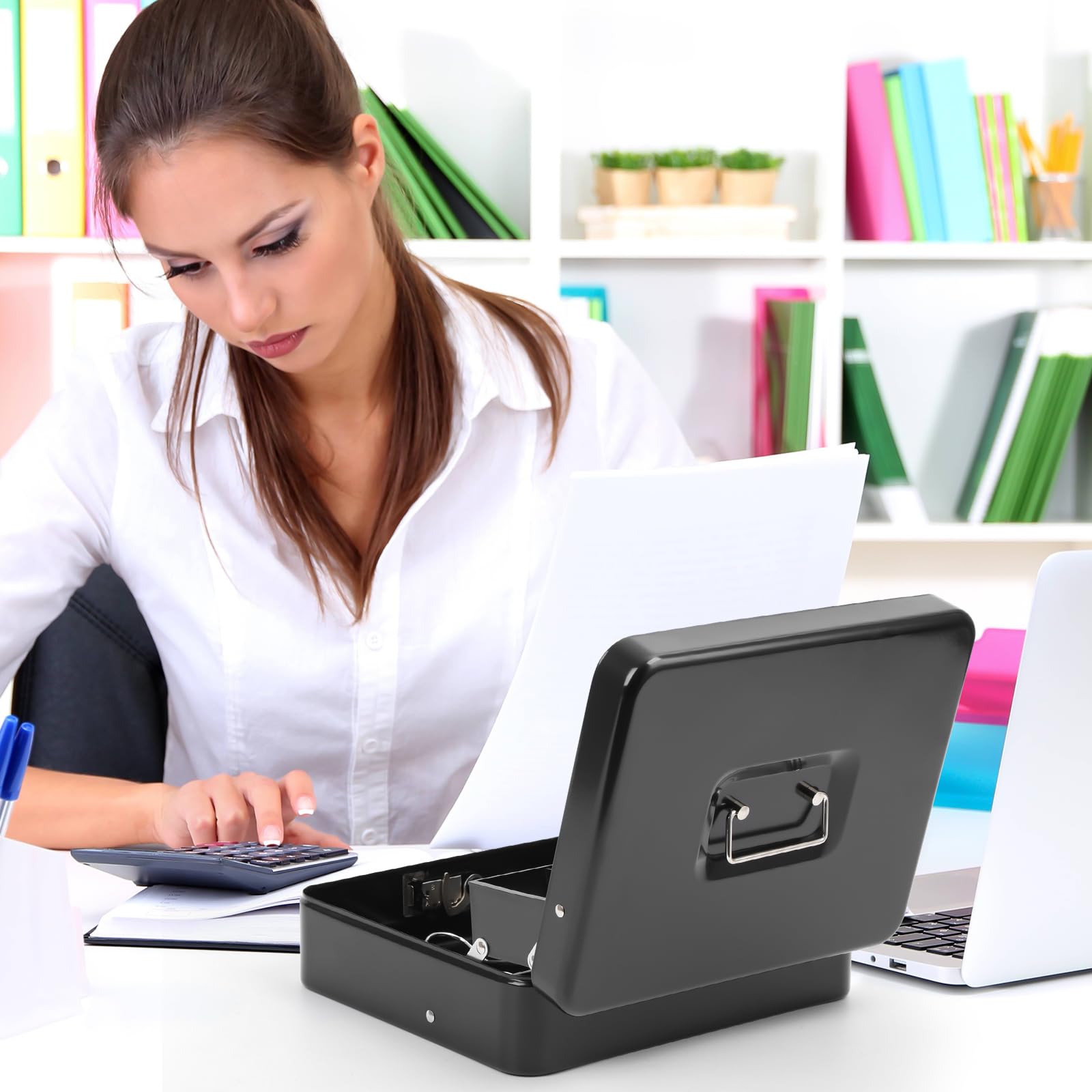 PETTY CASH BOX: This lock box is constructed of durable steel which is solidly built and won't simply burst open if dropped.For indoor and outdoor use. Such as School, Supermarket, Storage Lockers, Cabinets, Family, Yard Sale and so on. Suitable to store bills, coins, checks and receipts.