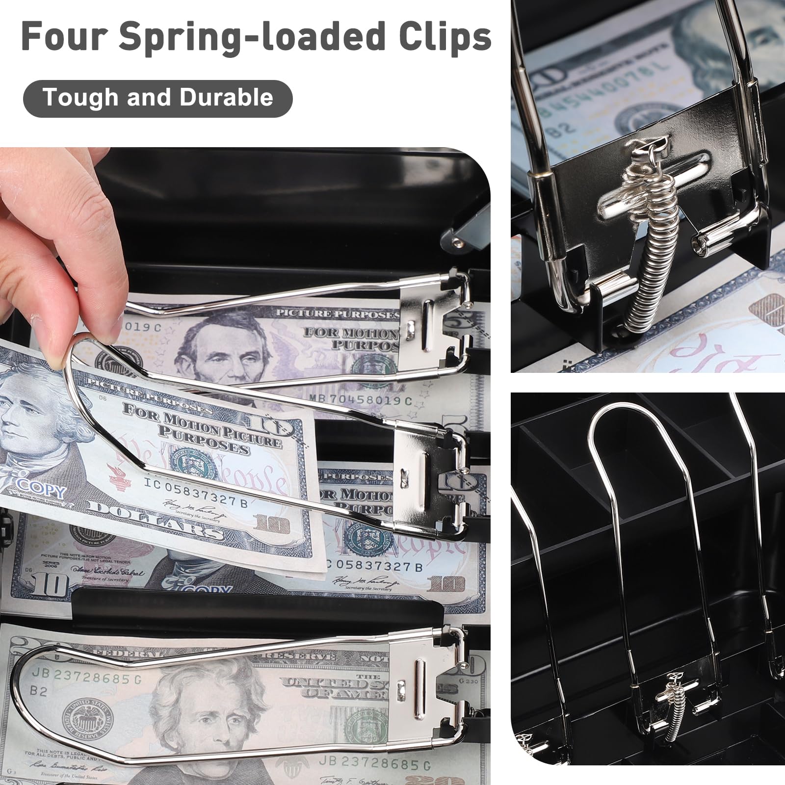 SPRING CLIPS: Four strong spring clips at the bottom of cash box help to organize paper bills and checks in their place anywhere even in a windy outdoor environment.