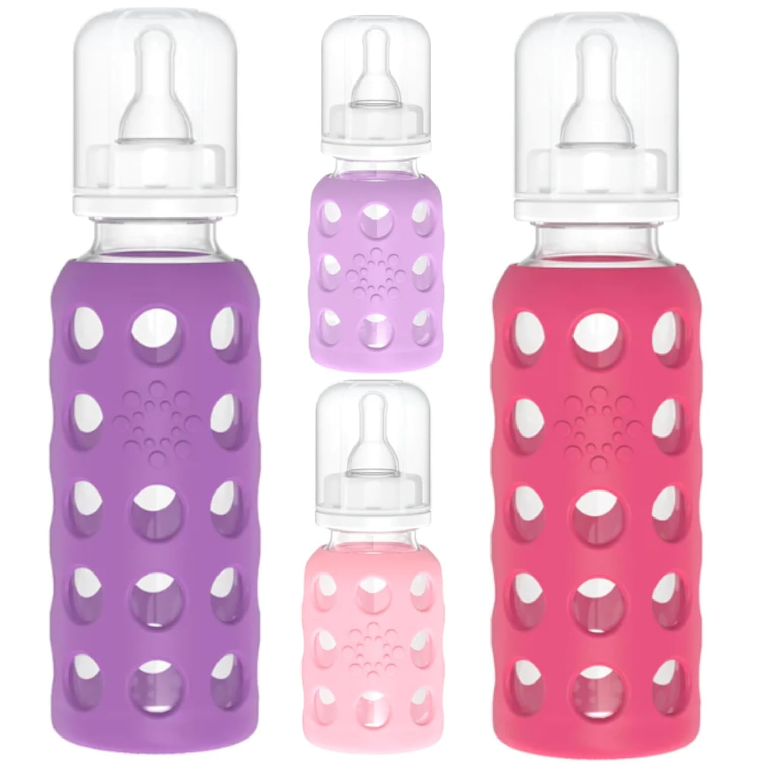 The perfect starter bottle for baby. The Lifefactory 4oz glass baby bottle comes with a silicone sleeve, polypropylene cap, ring, and stopper, and a Stage 1 (0-3 months) silicone nipple. These are wonderfully easy to clean: the bottle stays inside the silicone sleeve, and go right in the dishwasher. As baby grows the Lifefactory 9 oz glass baby bottle is the next step up. With a variety of nipple sizes and sippy caps our bottle adapts to your baby's changing needs. The 9 oz. bottle comes with a silicone sleeve, polypropylene cap, ring, stopper, and a Stage 2 (3-6 months) silicone nipple. You'll appreciate the grippy surface of the colorful silicone sleeve, and you'll love the fact that you're using a glass bottle that is manufactured with high quality materials.