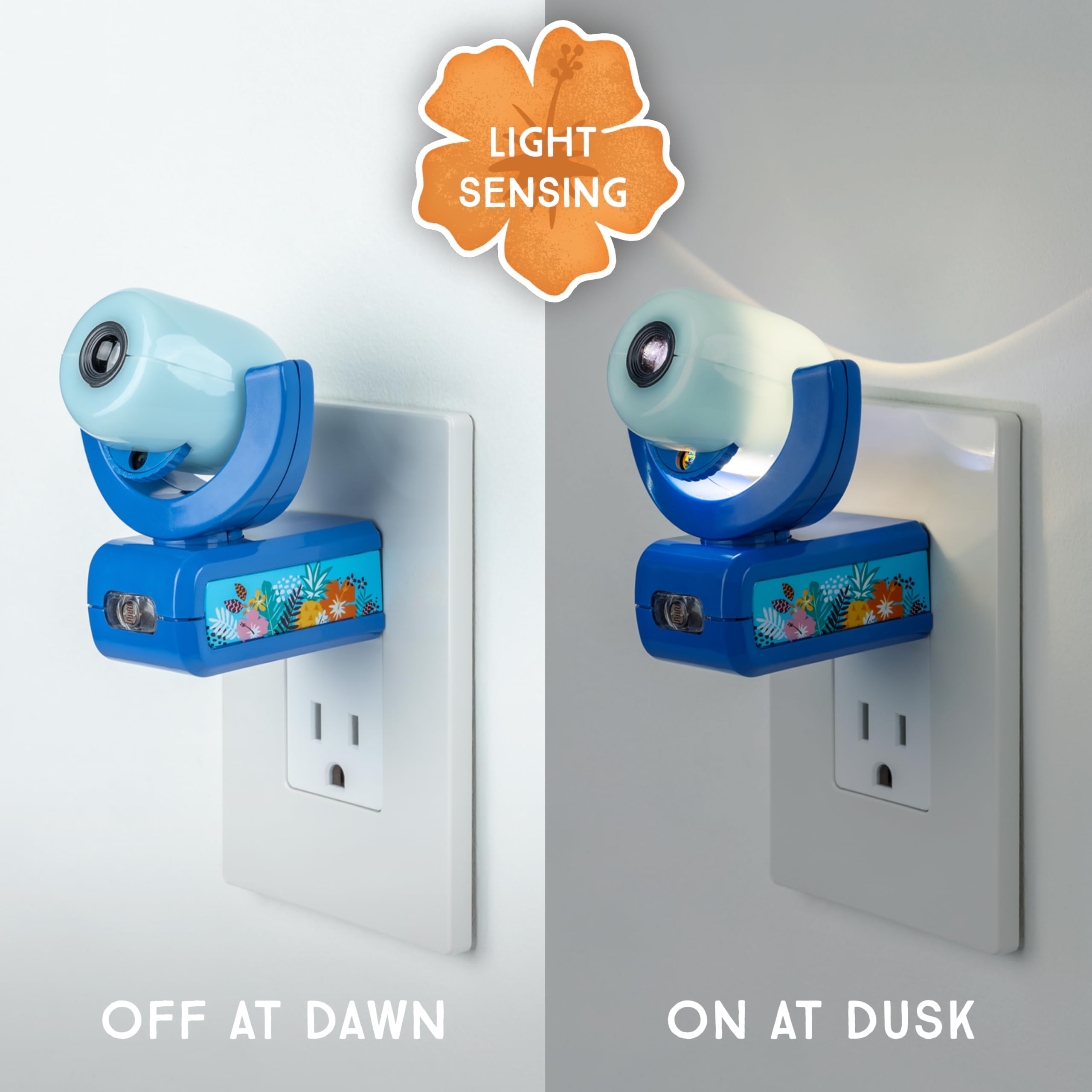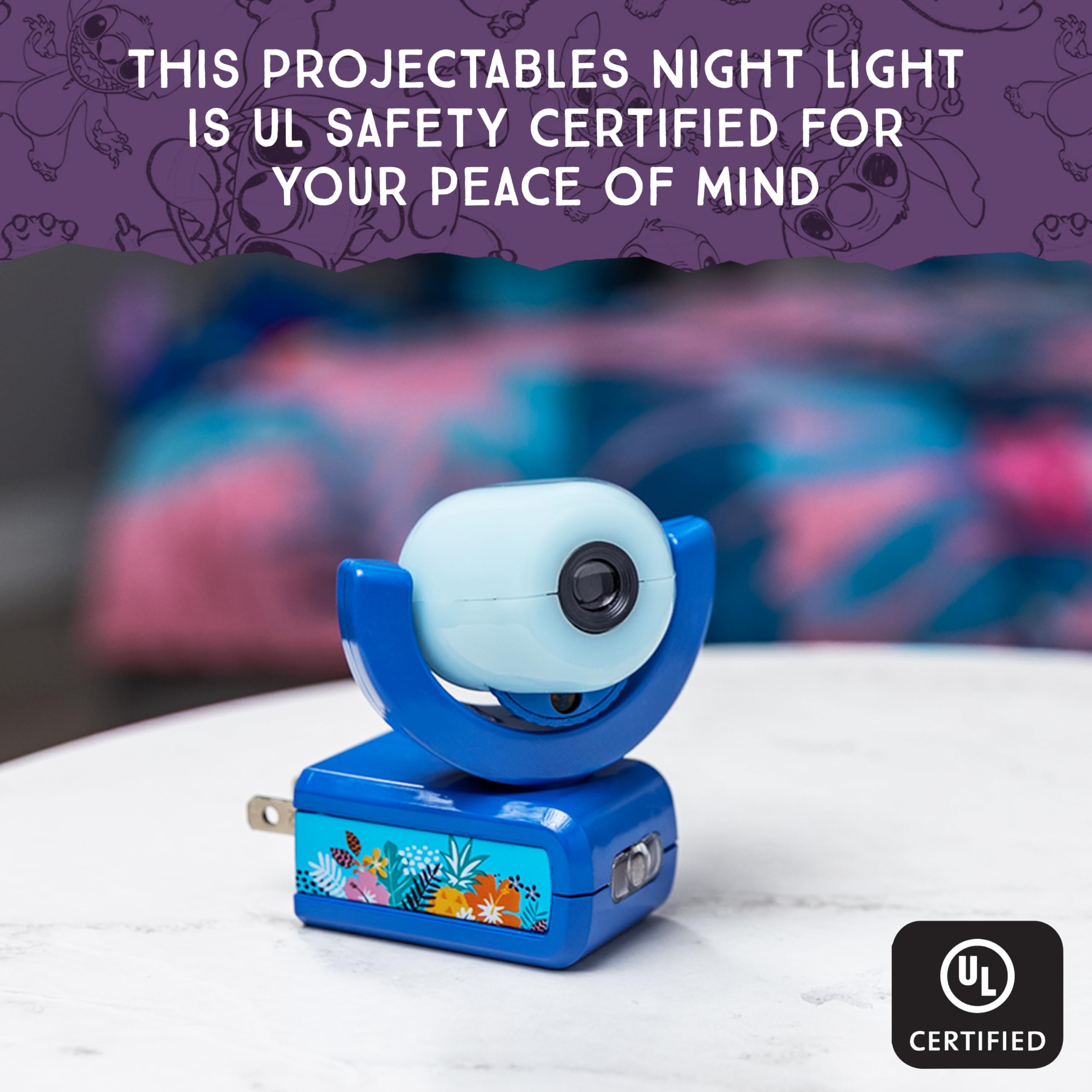 Light the night with Disney’s Stitch Projectables LED Night Light! Featuring six colorful images projected onto your ceiling, wall or floor, the delightful artwork is perfect for any Disney fan. Using the built-in scroll wheel on the base, choose images featuring mischievous yet lovable Stitch and his sweetheart, Angel, from Disney’s Lilo and Stitch: The Series. The base also emits its own night light glow — ideal for helping kids fall asleep and guiding your way during evening routines. Light-sensing technology automatically turns on the plug-in night light when the room gets dark — ON at dusk, OFF at dawn. Point the projection where you’d like by reversing the night light in the outlet or by rotating the base 180° vertically and 300° horizontally. Created to last, cool to the touch and UL safety certified, this light is designed for your peace of mind. Light your space with some Disney magic and the goofy extra-terrestrial charm of Disney’s Stitch Projectables LED Night Light.