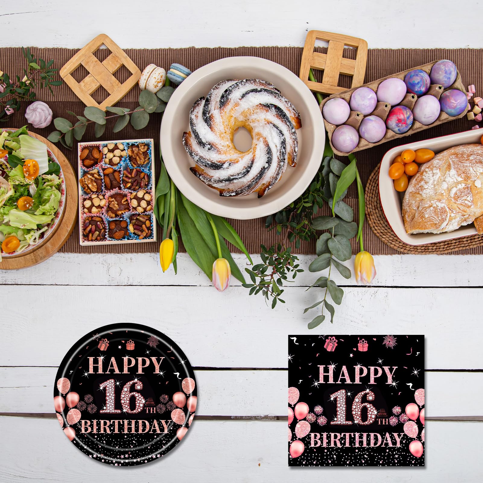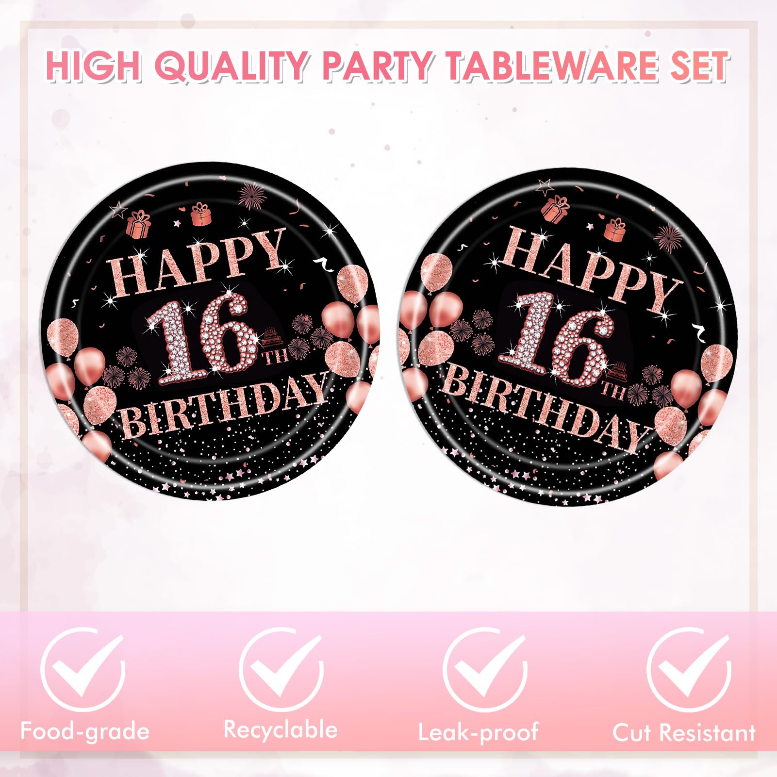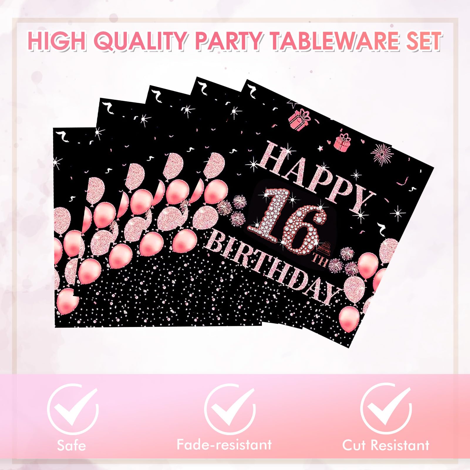 【Premium Material】All of our sweet 16 plates and napkins Made from high quality paper clear printing, light and durable, not easy to fade,non-toxic and no odd smell, and are all printed with food-grade water-based ink which is suitable for food contact. Napkins are 3-layered thick to ensure durability.