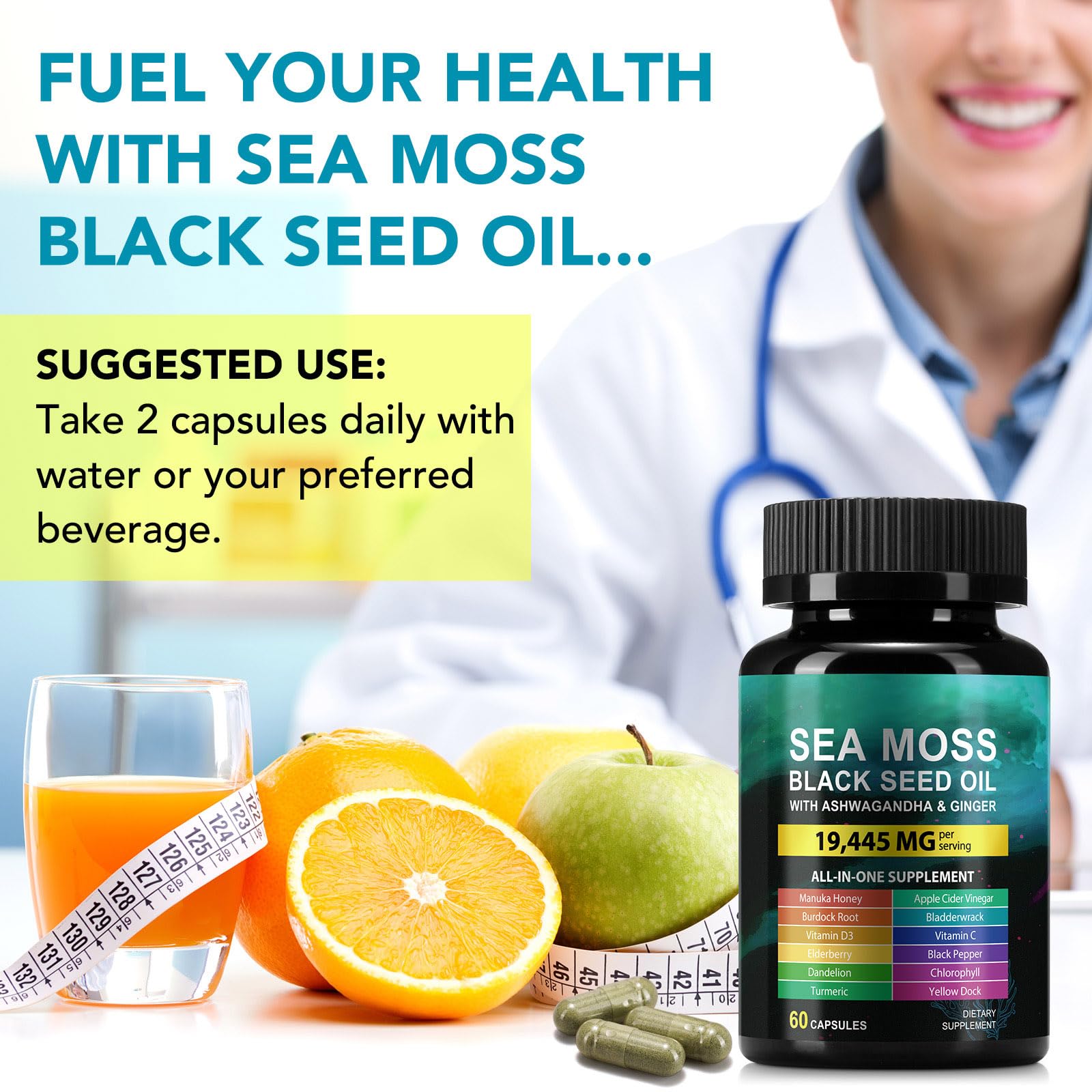 SEA MOSS BLACK SEED OIL WITH ASHWAGANDHA & GINGER DIETARY SUPPLEMENT Sea Moss Black Seed Oil Capsule, a comprehensive all-in-one supplement that offers a blend of Sea Moss Black Seed Oil Ashwagandha Ginger, Burdock Root, Black Pepper, Turmeric, and more. Each capsule delivers 19,445 mg of these powerful ingredients, providing a range of benefits such as boosted immunity, enhanced digestion, increased energy, balanced stress levels, and improved skin and hair health. Revitalize your health and well-being with every capsule. THE POWER OF SEA MOSS BLACK SEED OIL: Enhanced Nutrient Absorption Hair and Skin Support Immune System Boost Sustained Energy Pure and Potent Ingredients Nourish Your Body from the Inside Out and Embrace Daily Wellness! SUGGESTED USE: Take 2 capsules daily with water or your preferred beverage. OTHER INGREDIENTS: Vegetable Cellulose (from capsule), Rice Flour, Magnesium Stearate, and Silicon Dioxide.
