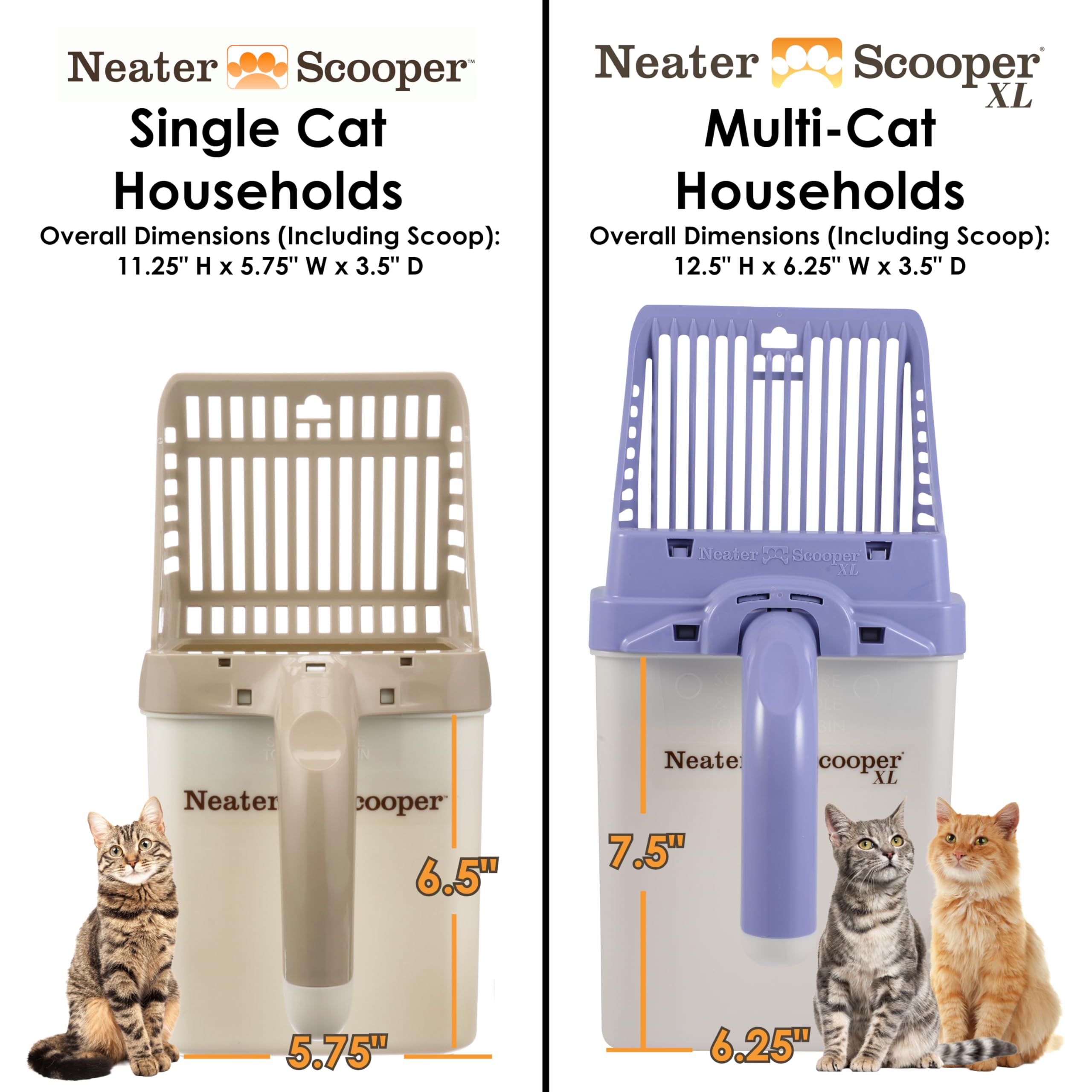 RECOMMENDED FOR MULTI-CAT HOUSEHOLDS: Neater Scooper XL holds 35% more waste than the standard Neater Scooper, making it ideal for multi-cat households or large cat breeds. If you only have one cat, or use a small litter box and scoop daily, then you might want to consider the standard Neater Scooper (click the “Standard” size button).