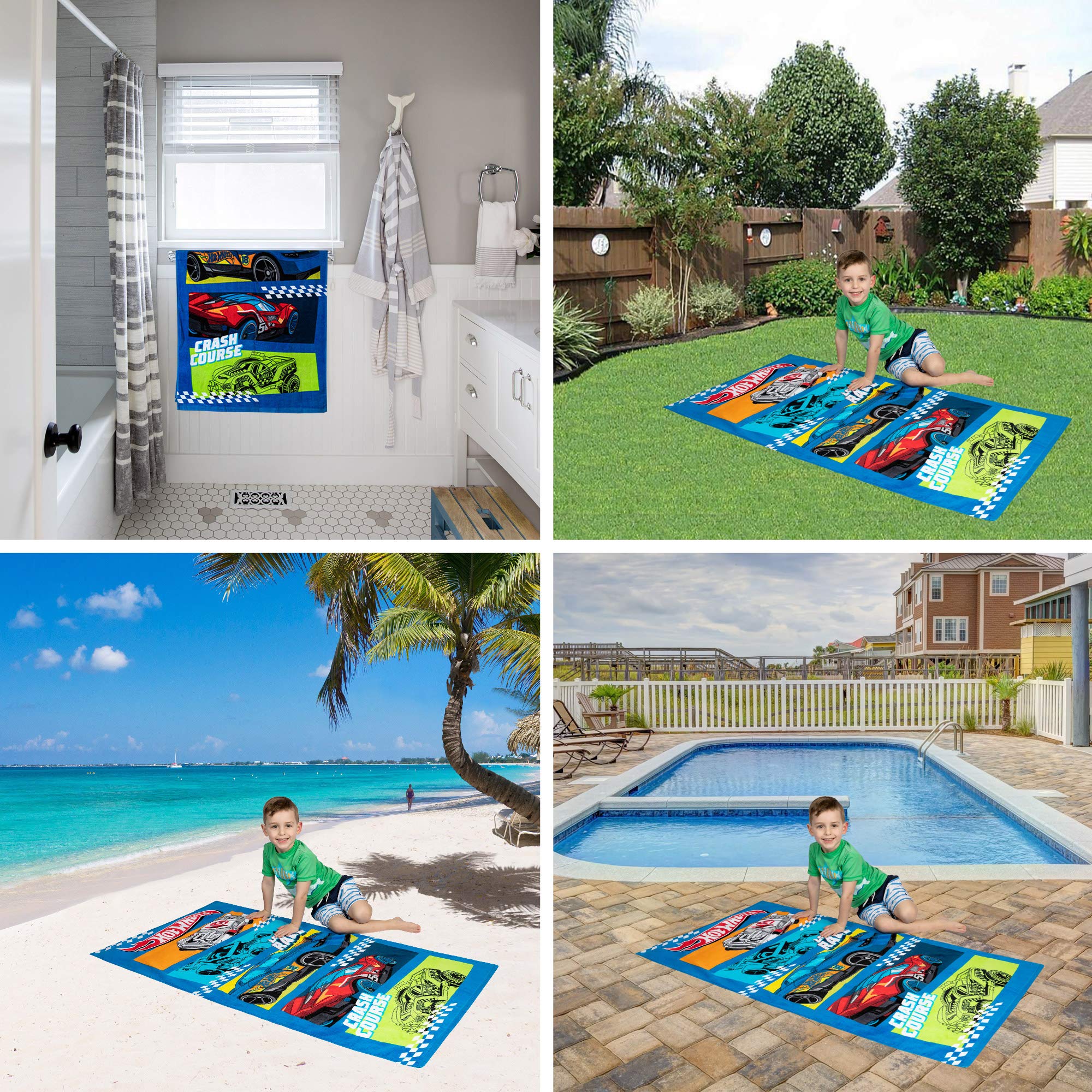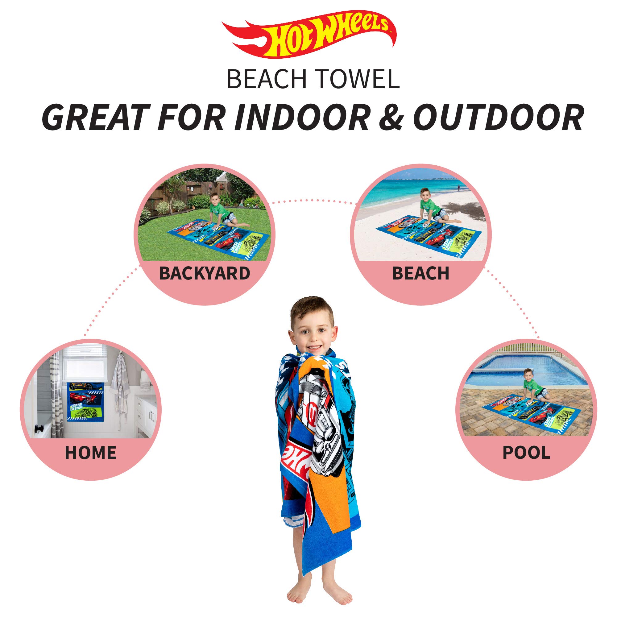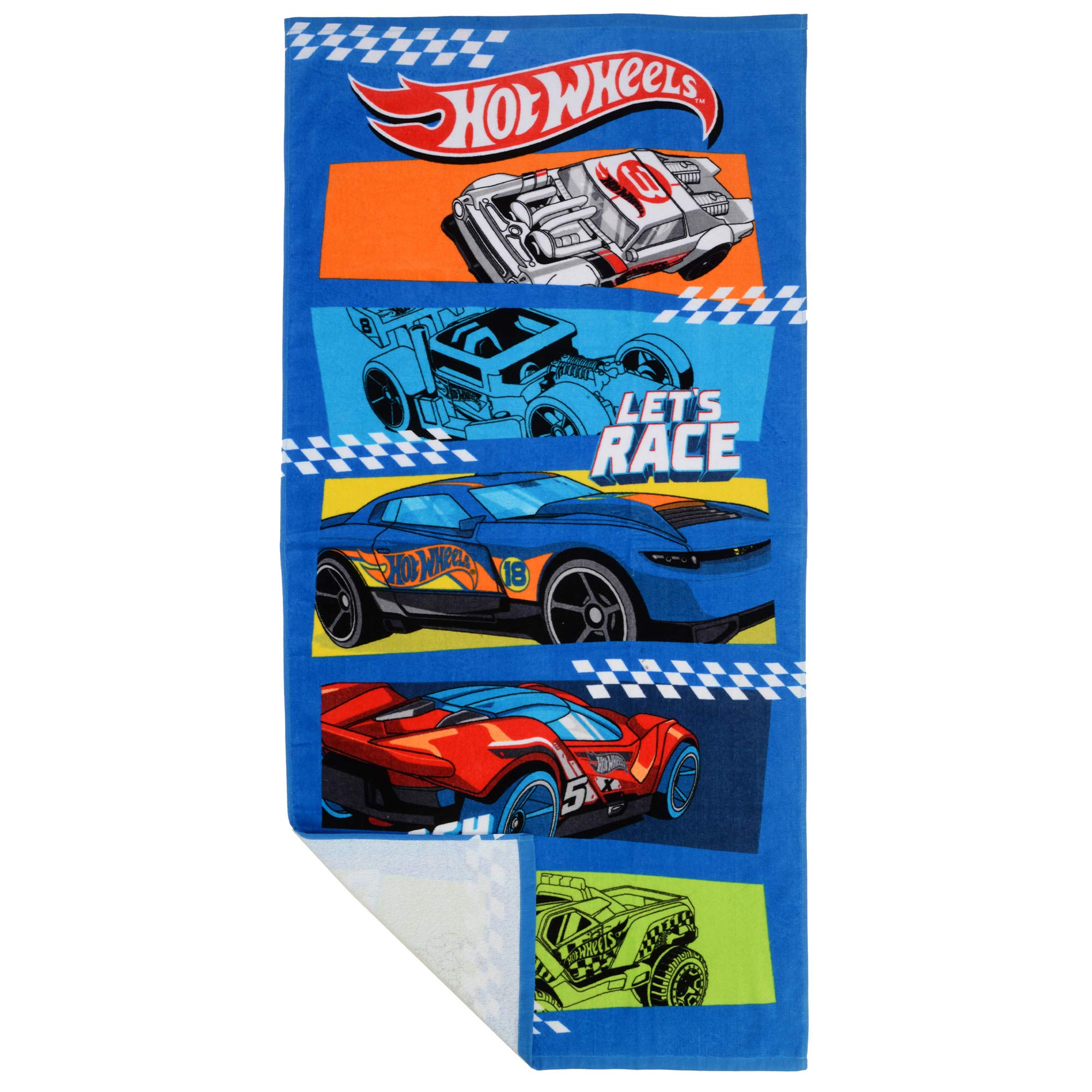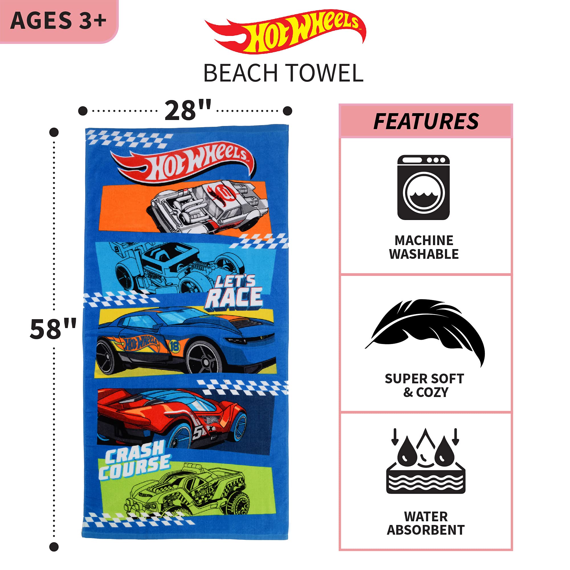 HOT WHEELS DESIGN: Mattel’s iconic Hot Wheels cars give kids a crash course in comfort with this cool and cozy beach towel. Bold text and eye-catching images of Hot Wheels vehicles race to the finish line on this colorful design.