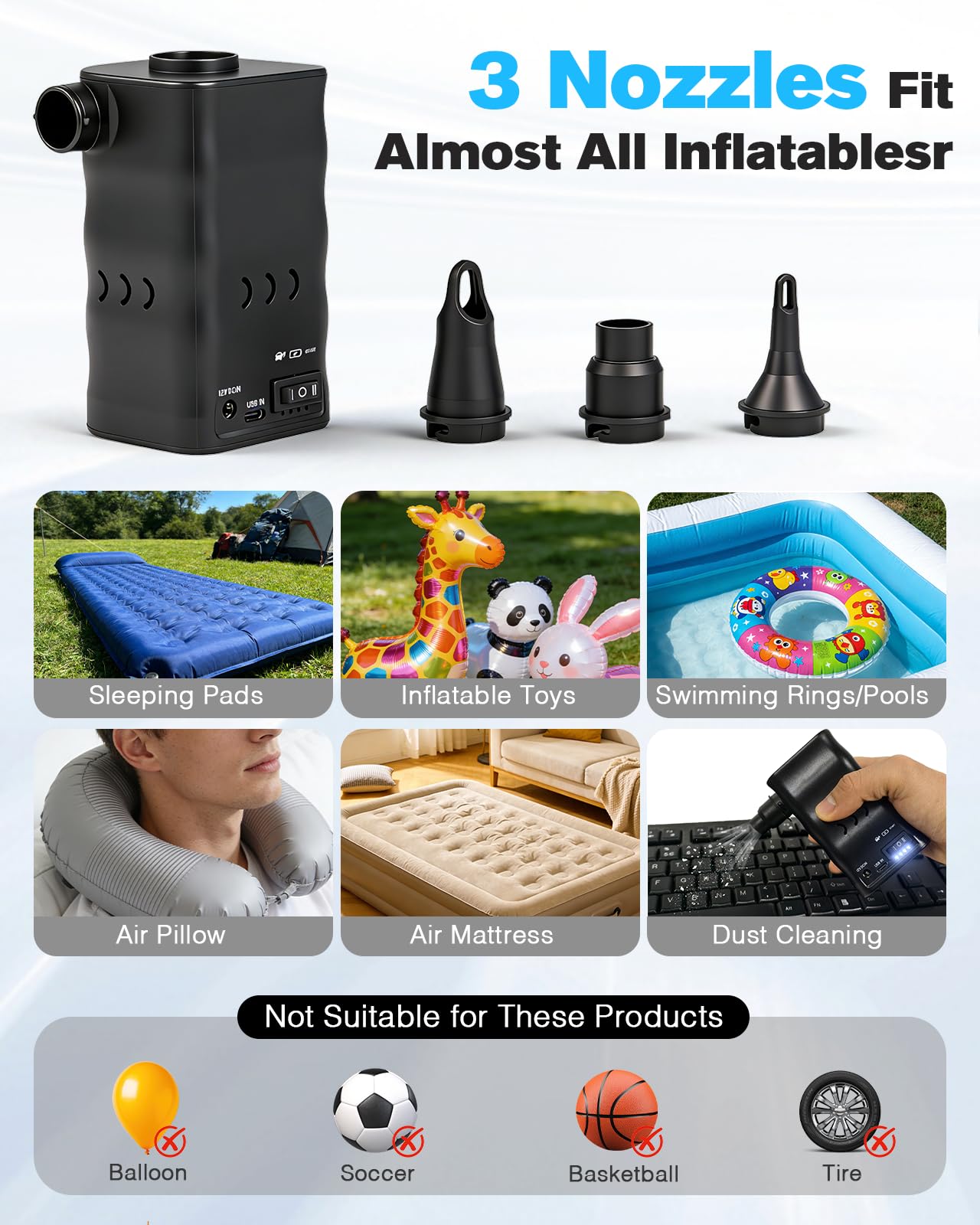 Wide Application: Equipped with three nozzles for most air cushions, inflatable beds, pool buoys, swim rings, inflatable boats, children's pools, inflatable play centers and other inflatable toys