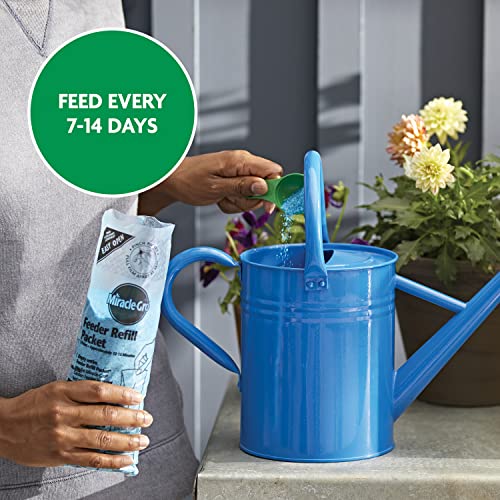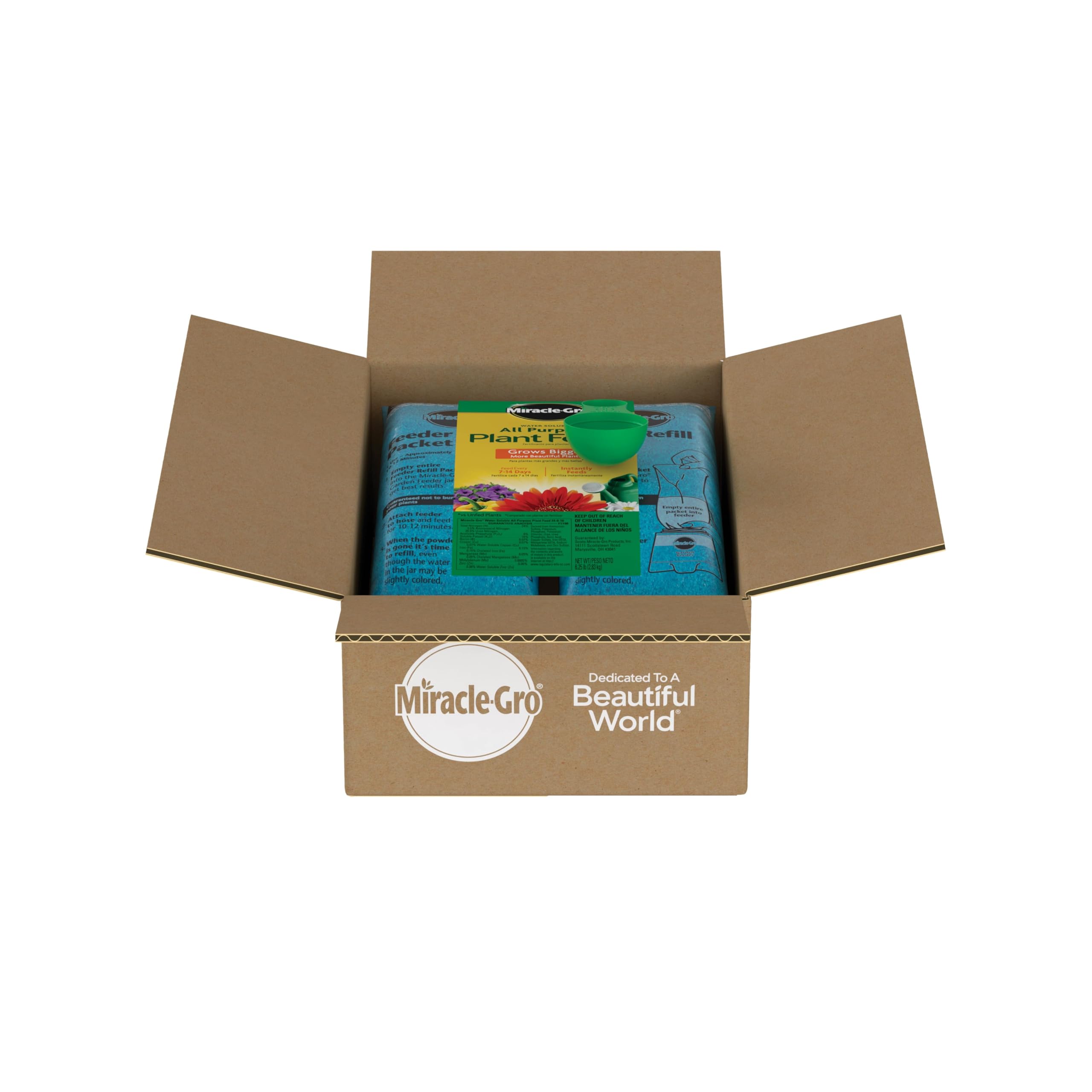 Grow bigger and more beautiful plants with Miracle-Gro® Water Soluble All Purpose Plant Food (vs unfed plants). This gardening product feeds plants instantly. In addition, it's safe for all plants and won't burn plants when used as directed. Use with all types of indoor or outdoor plants, including flowers, vegetables, houseplants, roses, trees, and shrubs. This plant food may be used with container plants or in-ground gardens. To apply to indoor plants, use the small end of the included scoop (1/2 tsp) and mix plant food with 1 gallon of water in a watering can. Reapply every 2 weeks. For outdoor plants, use the large end of the included scoop (1 1/2 tbsp) and mix with 1 1/2 gallons of water in a watering can. Reapply every 7 to 14 days. When using in large garden areas, fill a Miracle-Gro® Garden Feeder (sold separately) and follow feeder directions. For best results, just soak the soil at the base of each plant to fertilize the roots. One 6.25 lb. container of Miracle-Gro® Water Soluble All Purpose Plant Food feeds approximately 2,500 sq. ft. of garden area.