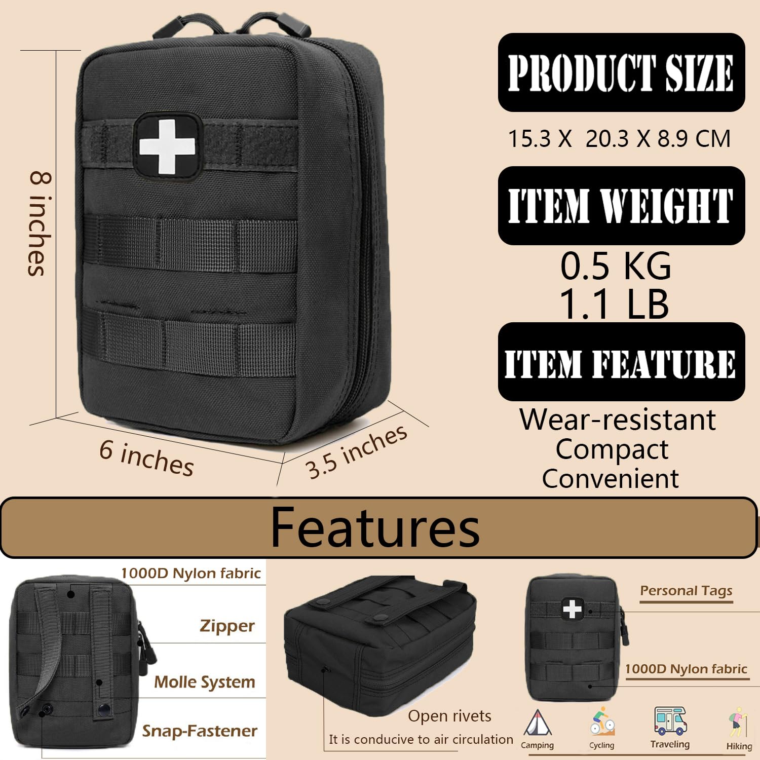 ✅: It can be useful at the shooting range or put together as part of a tactical load out. This standard pouch is used by military personnel, EMT, police, firemen, and by responsible civilians as an easily accessible and necessary component for first aid needs. But it's also a featured accessory for hikers, campers, and other outdoor enthusiasts to carry first aid supplies to treat wounds, and any other injuries fast and at a moment's notice.