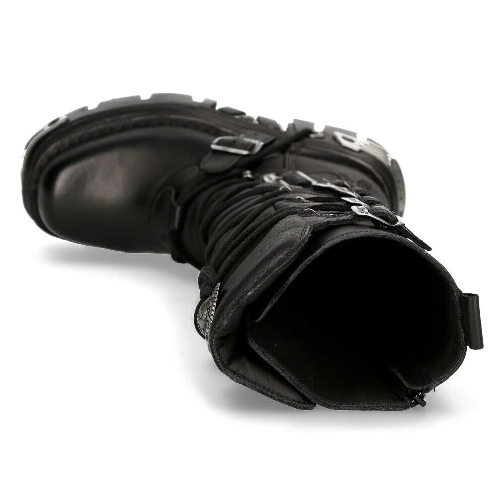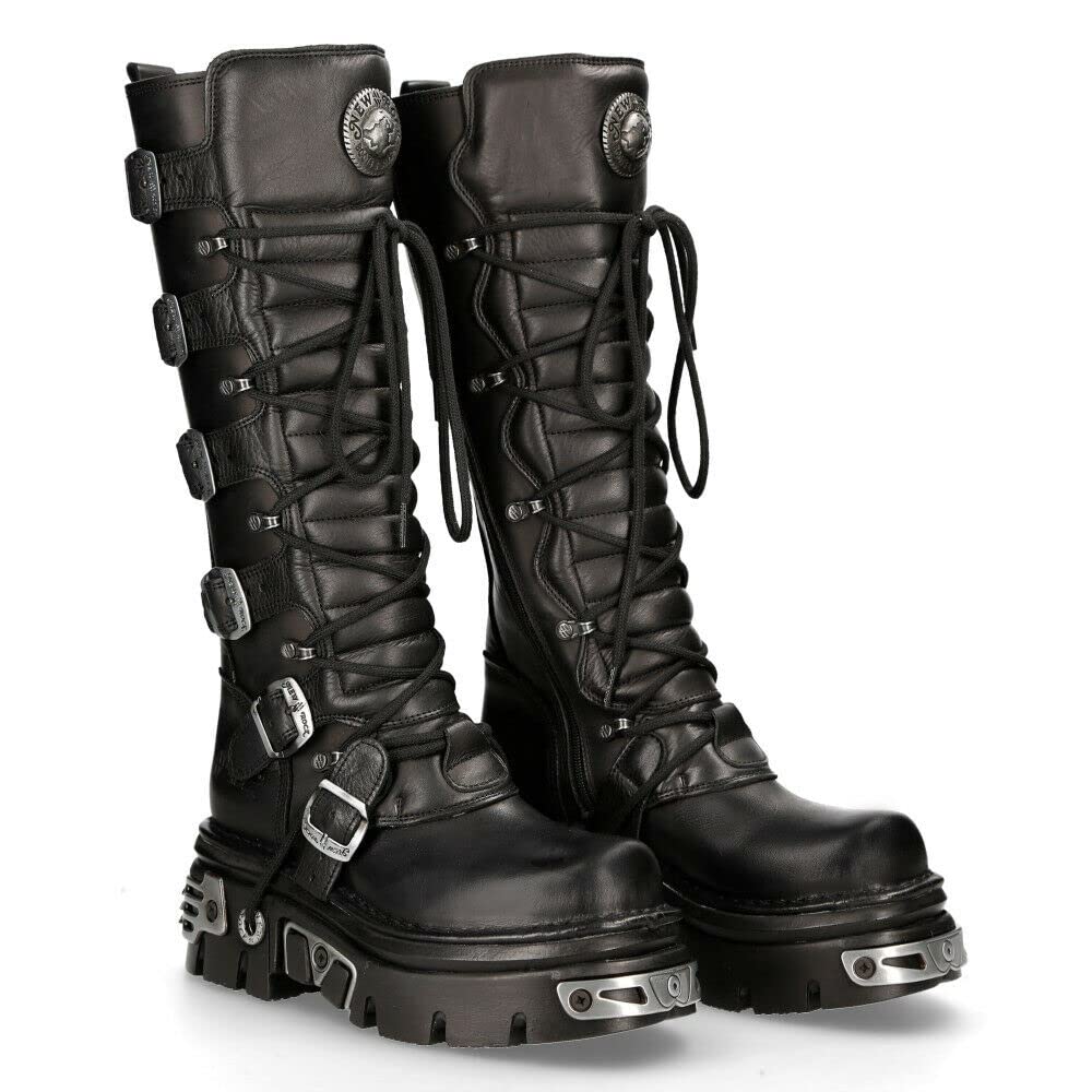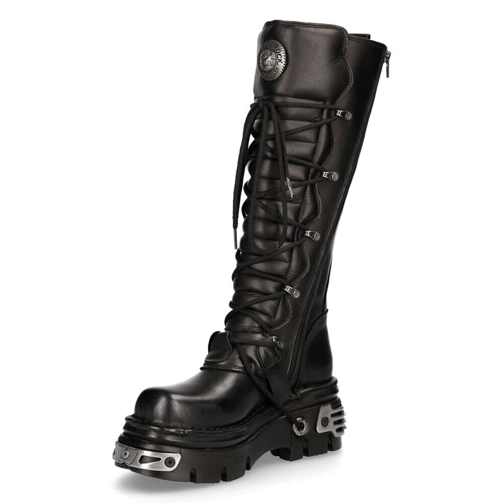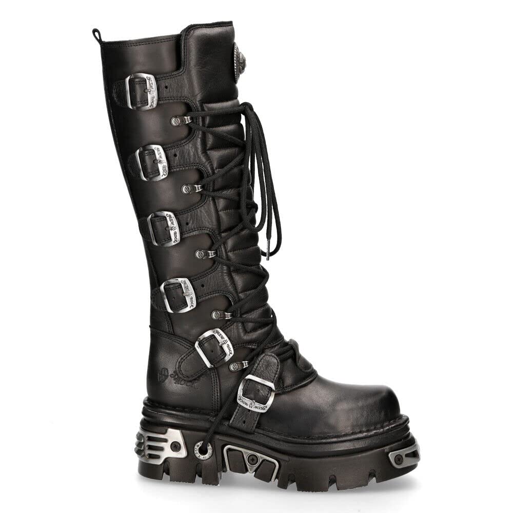Description Introducing the Knee High Boot M.727-S1 New Rock collection. Crafted from high quality leather material the high boots boasts a classic Gothic style blended with new punk and rock design cues. This boot is a popular staple for the New rock brand that features a lace up fastening. up to the knee overlapped by a buckle fastening to provide a secure fit. For added style the boots feature metal accents across the tongue and sole to complete a heavy metal punk look.