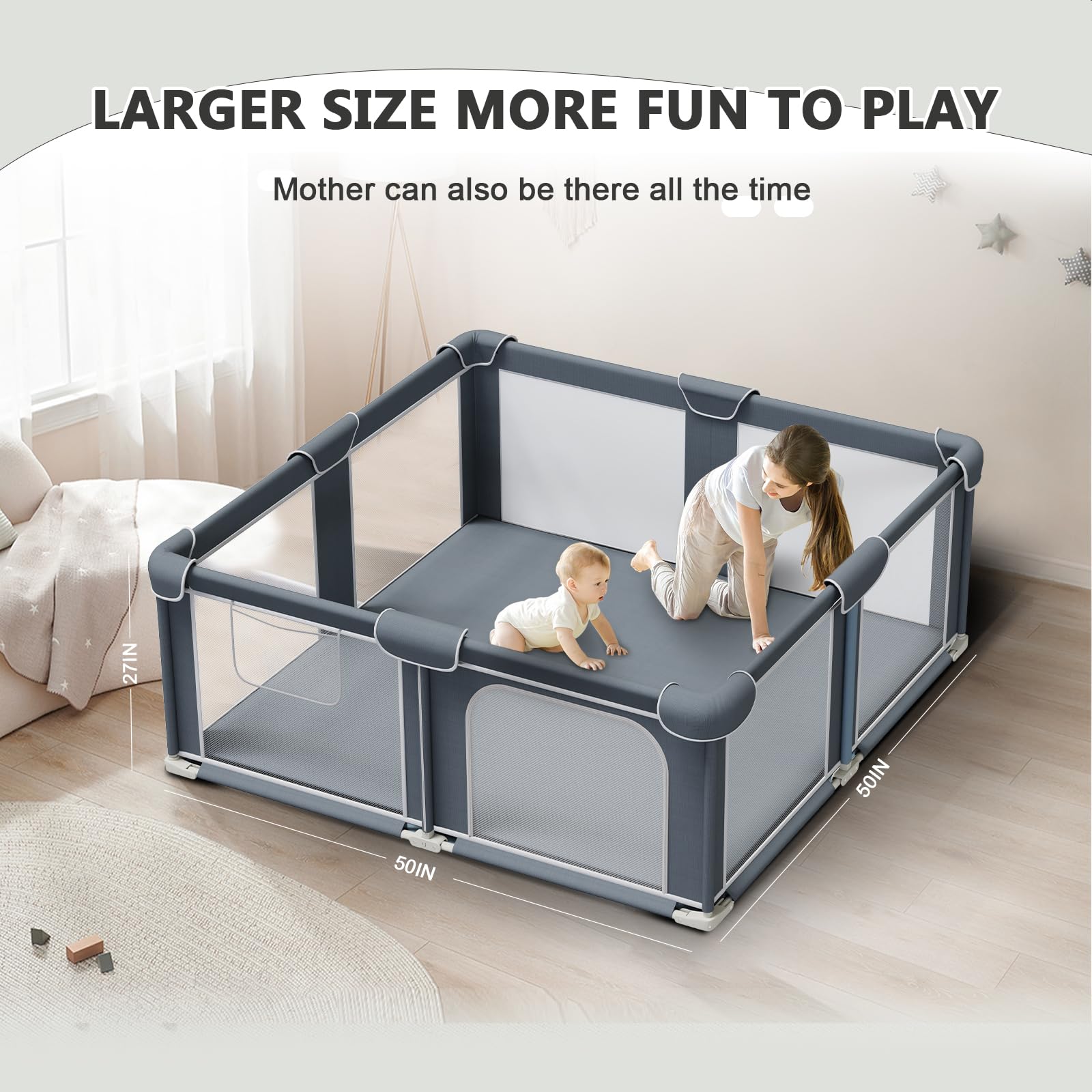 Spacious 50"x50" Play Zone: Give your baby room to roam, crawl, and discover! Large Baby Playpen playpen provides ample space for free movement and exploration. Its optimal height safely supports toddlers as they learn to pull up, stand, and take their first steps.