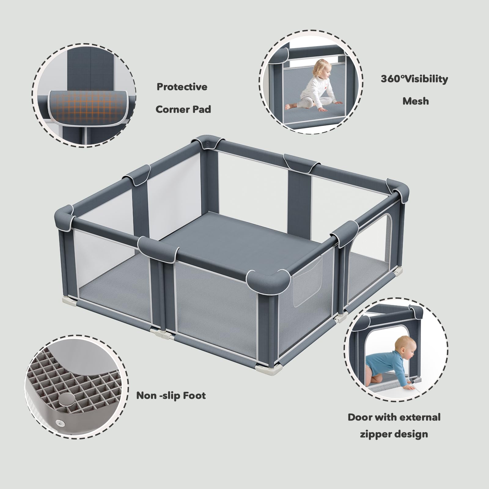 360° Breathable Visibility & Peace of Mind: Our playpen for babies and toddlers create a secure haven while staying connected. Four full-height, ultra-breathable mesh walls ensure excellent airflow and provide you with a clear, panoramic view of your child from any angle. Watch them play safely and comfortably.