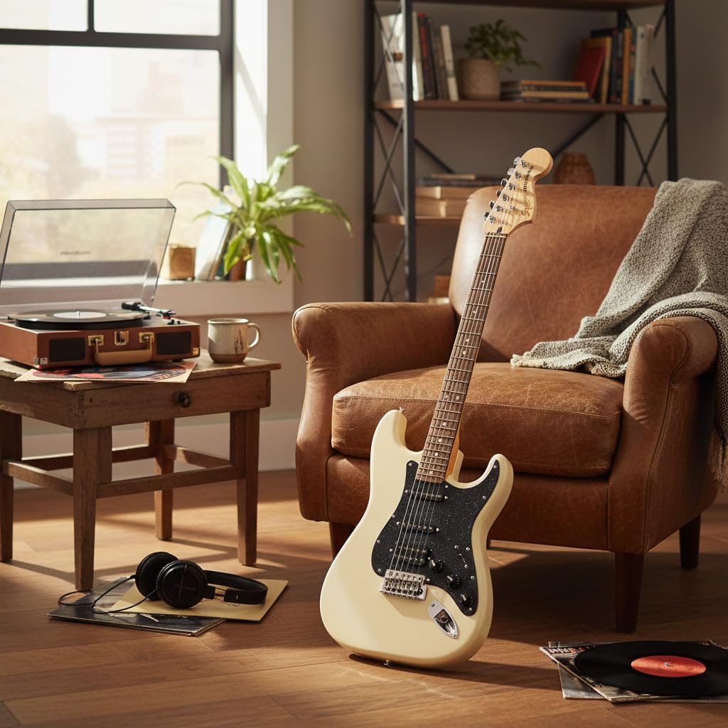 ERGONOMIC DESIGN: This Strat is designed with a thin and lightweight poplar body, complemented by a sleek black pickguard for a modern aesthetic