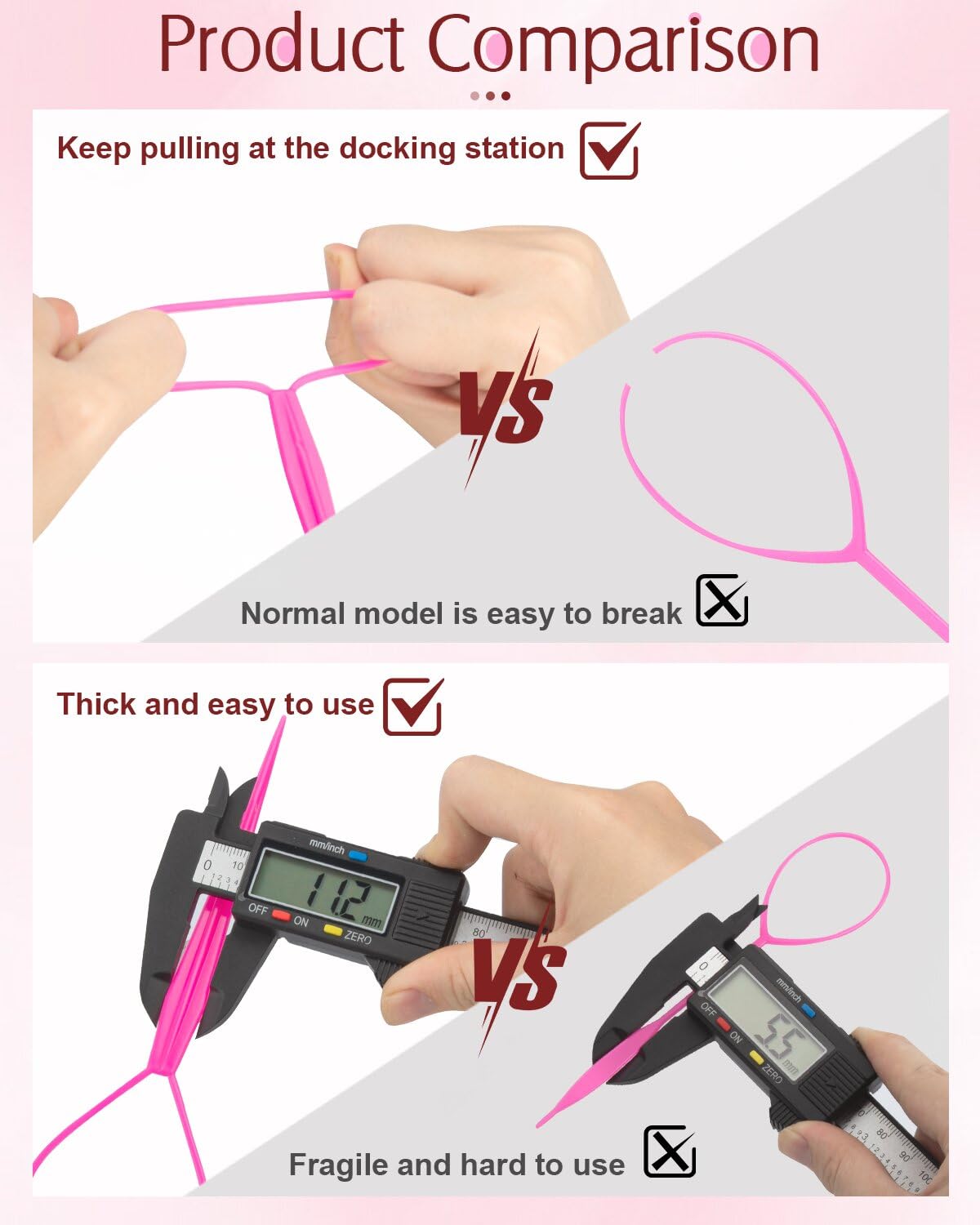 1:[Perfect Hair Styling combs set-Value for money ]: These pink hair loop styling tool set includes 4pcs Topsy Tail Hair Tools pony tail hair tool, french braid tool loop,1pcs slick back hair brush, bristle teasing hair brush,1pack double-sided edge brush, 2pcs carbon fiber heat resistant rat tail combs. This pink combs set working with hair that is perfect for edge flyaway hair, baby hair, soft and fine hair