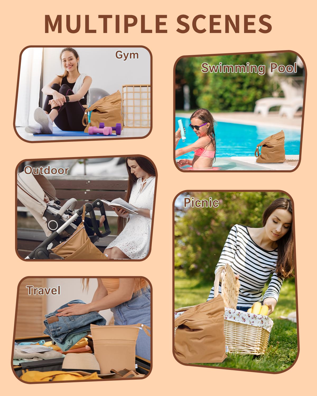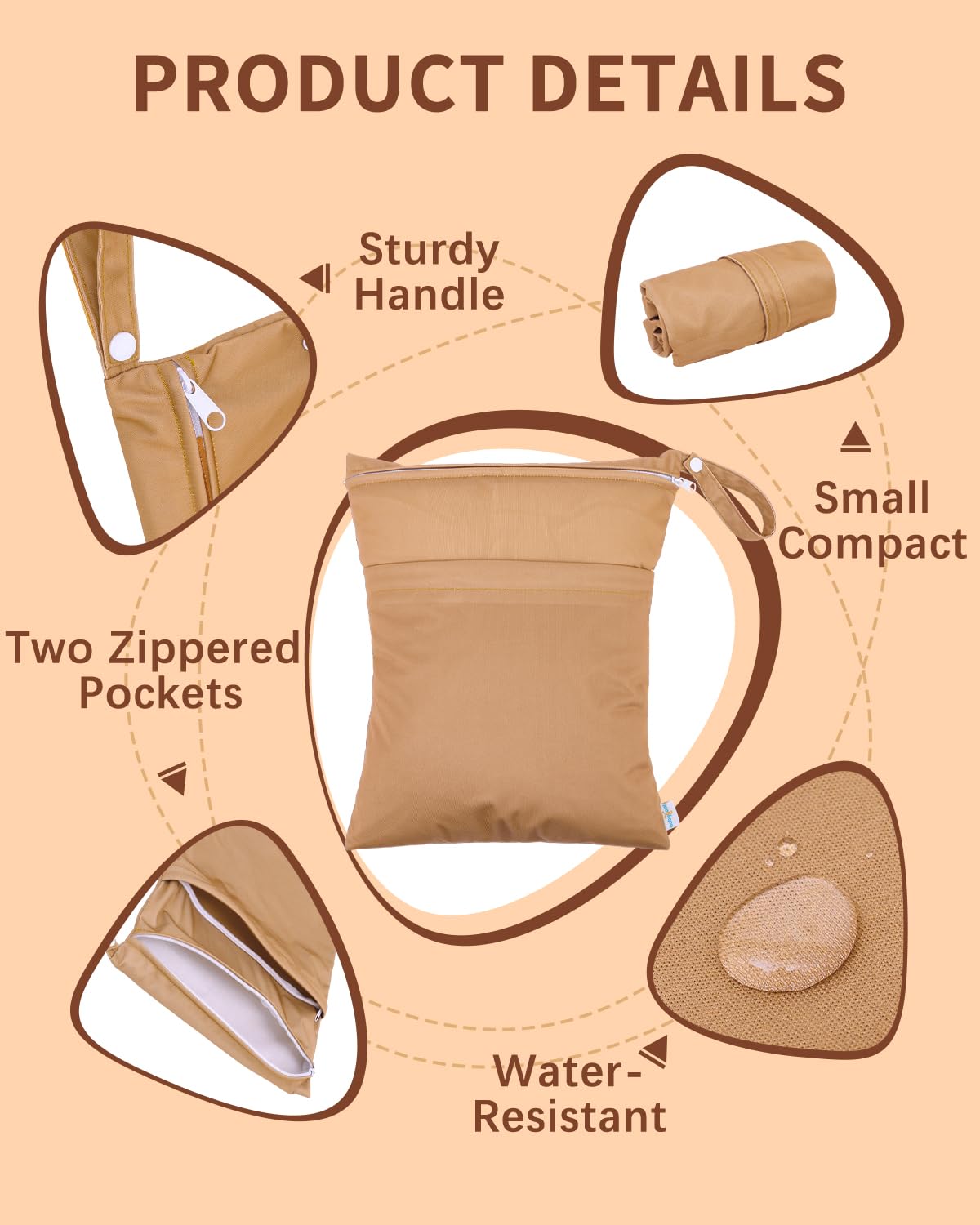 Double-Pocket Design with Snap Handle: Each wet bag contains two pockets, which comes with two zip closures to ensure that nothing will drop out of the bag and better to keep the clean and dirty items separately. With the snap handle design, you can unbutton the haddle and easily hang the bag on the stroller or door knobs, towel rod ect. anywhere you want.