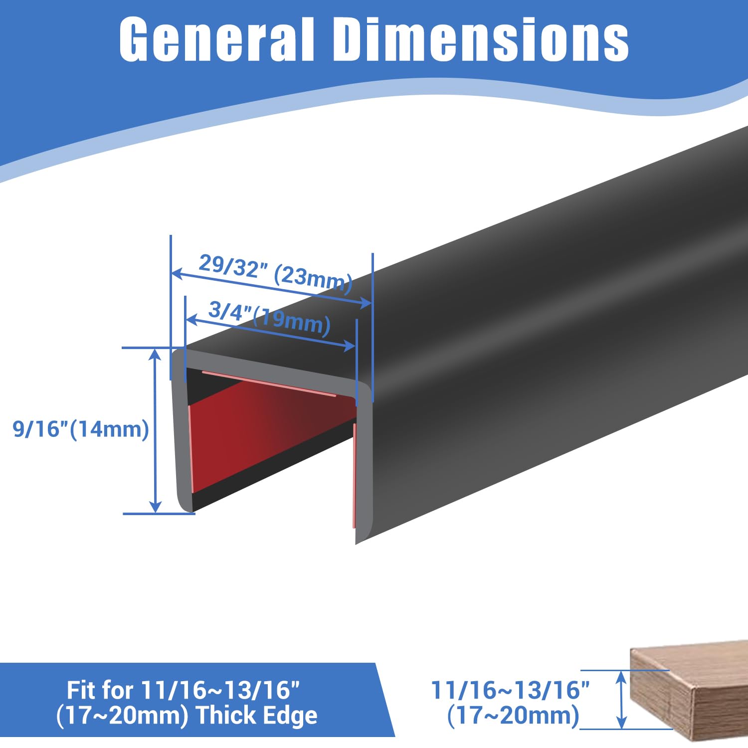 Application: The edge trims can used to cover the edges of all the sheet parts to prevent people been hurt by the shape edges, it can fit edge from 11/16" to 13/16"(18mm-20mm). Can be widely used to cover the edge for cabinets, drawers, shelves, countertops, desks and tables.