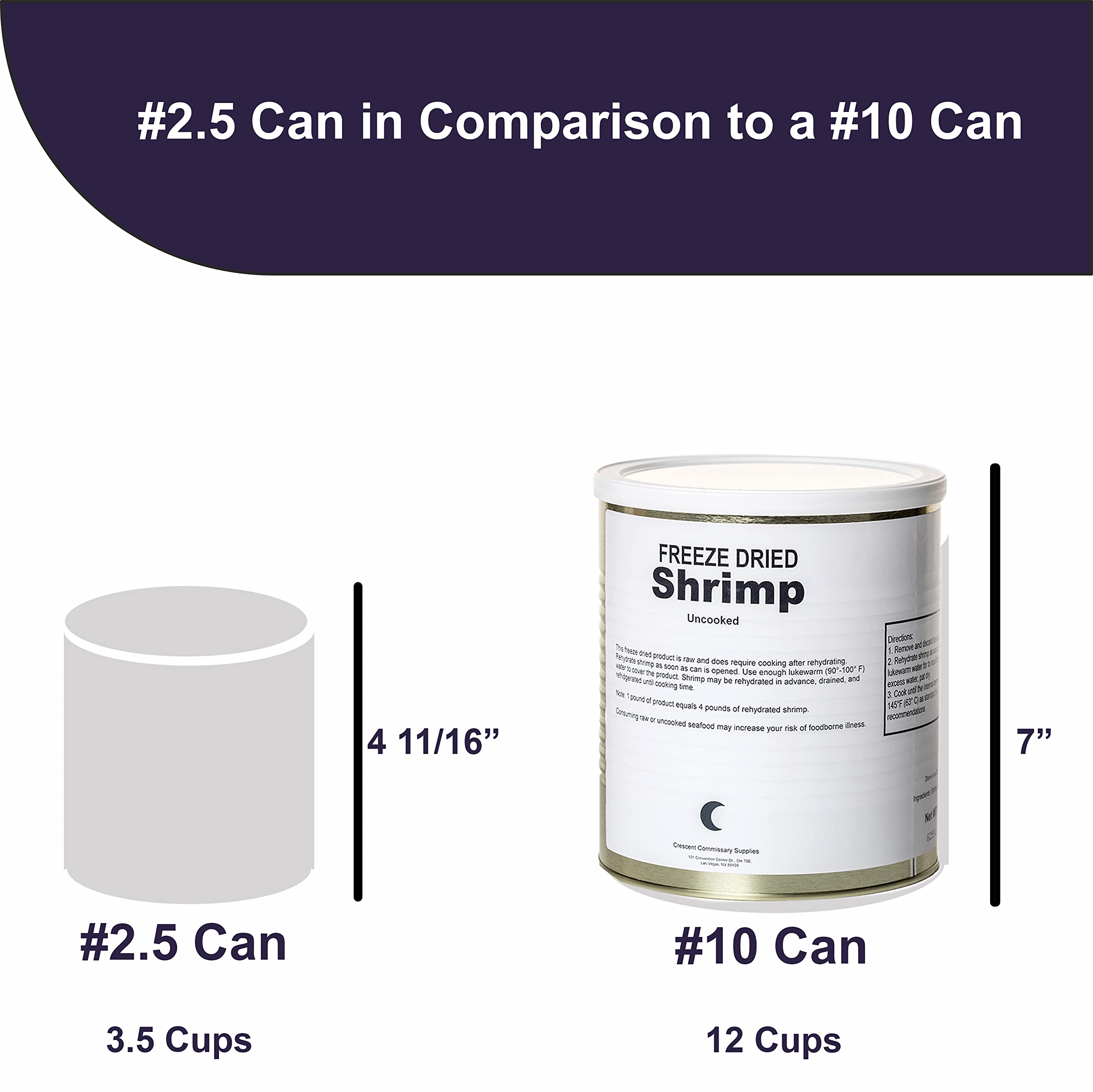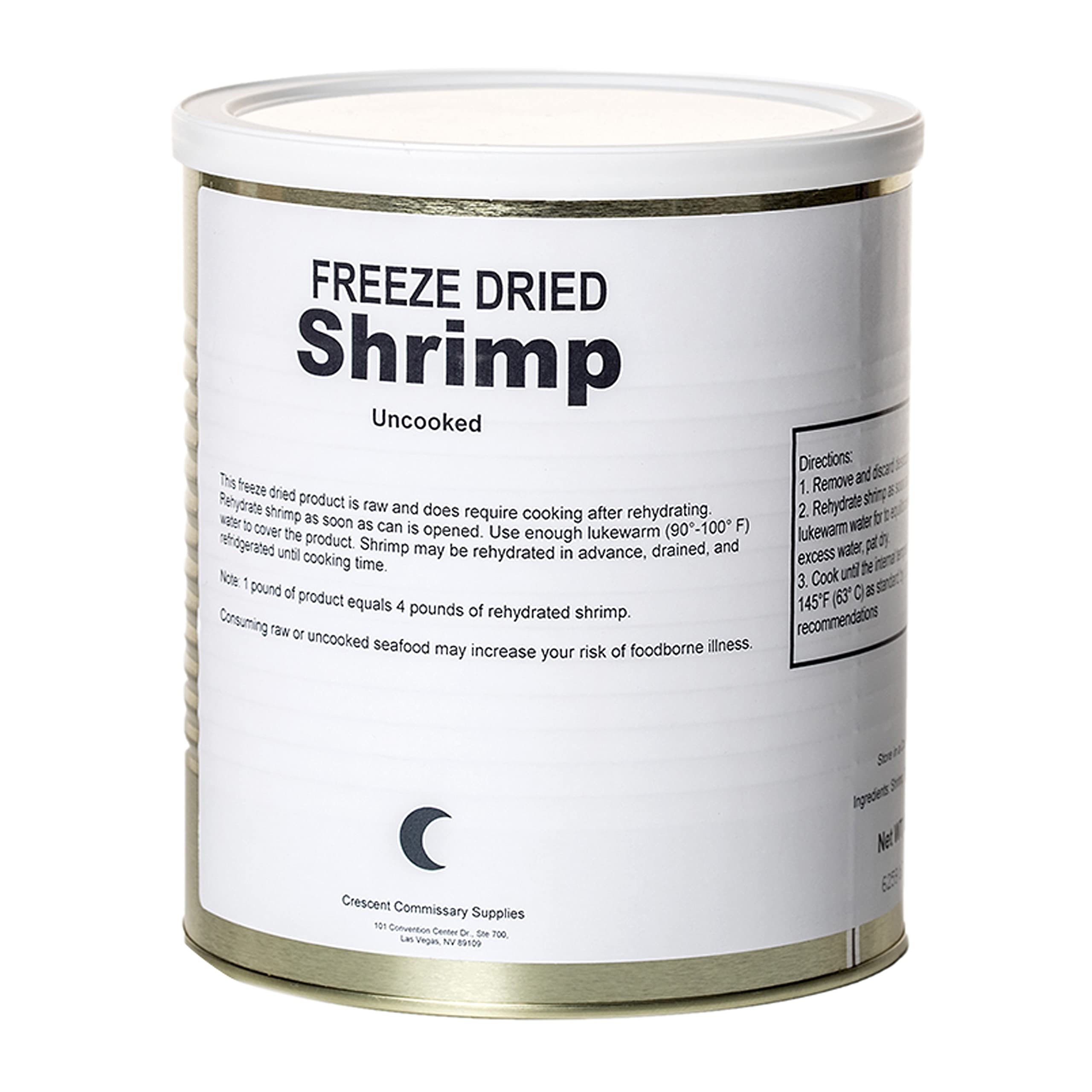 Freeze Dried Canned Uncooked Shrimp | Jarred and Packed Long Term Food Storage Emergency Food Supply | Hiking, Backpacking & Camping | Easy Prep Survival Food 10 Size Cans (aka Gallon Can)- This Freeze Dried Shrimp is current production and not over-runs. They were manufactured by a large military defense contractor. They are amazing: tender, juicy, with a crunchy pop, and as fresh as the day they were flash frozen and freeze dried! Get these delicious Freeze Dried Shrimp exclusively at MREdepot. All cans were sealed in an oxygen/moisture free environment. Each can weighs about 8 oz (90-100 shrimp per can) Flash Facts: #10 Size Cans (aka Gallon Can) 90-100 Shrimp per can First-Run Quality 25+ year shelf life No Refrigeration Required April 2023 Production
