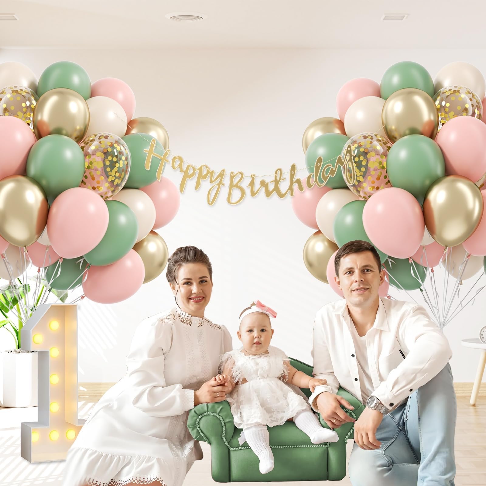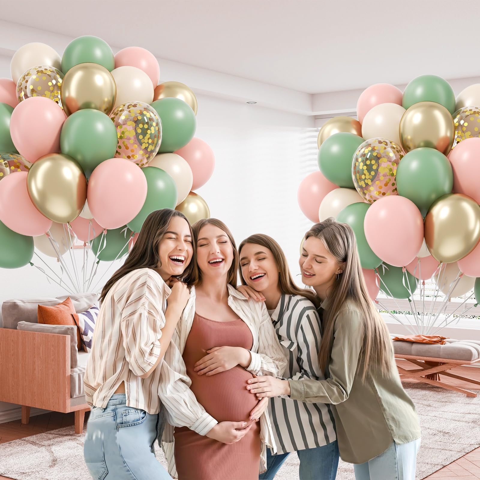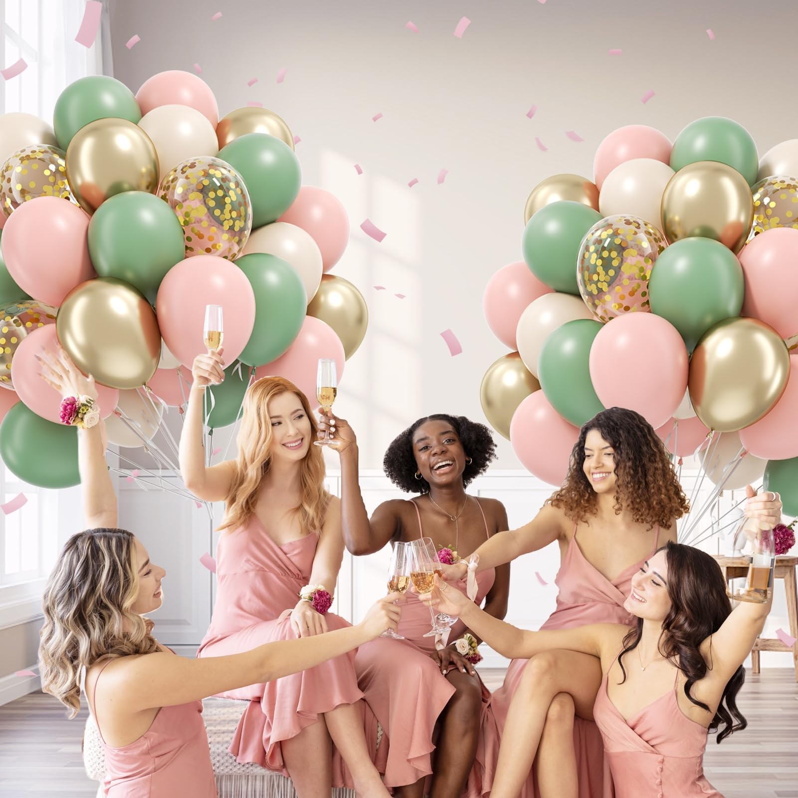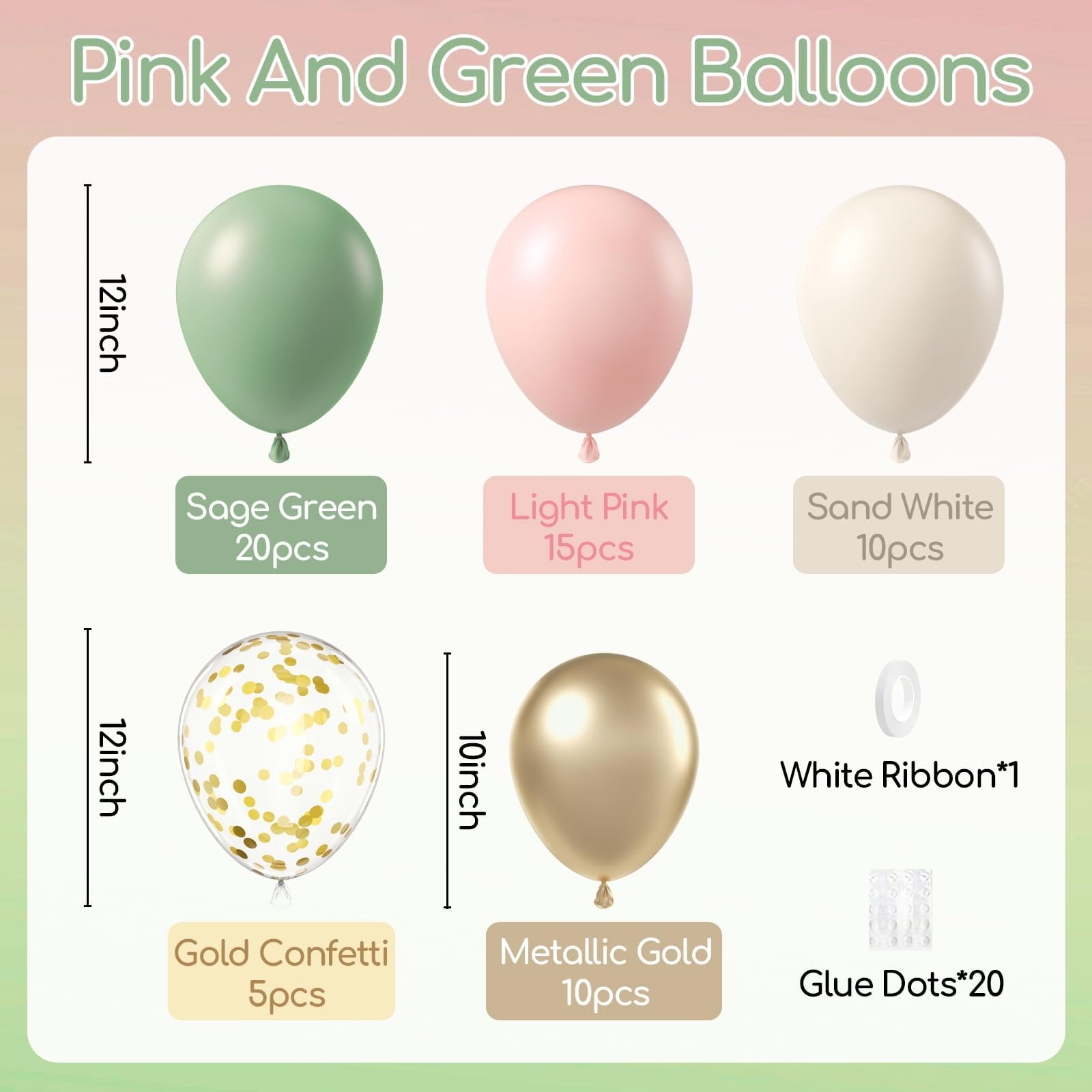 Package Include:The pink and green balloons include 12inch sage green balloonsx20, 12inch light pink balloonsx15, 12inch sand white balloonsx10, 10inch metallic gold balloonsx10, 12inch gold confetti balloonsx5, white ribbonx1, glue dotsx20