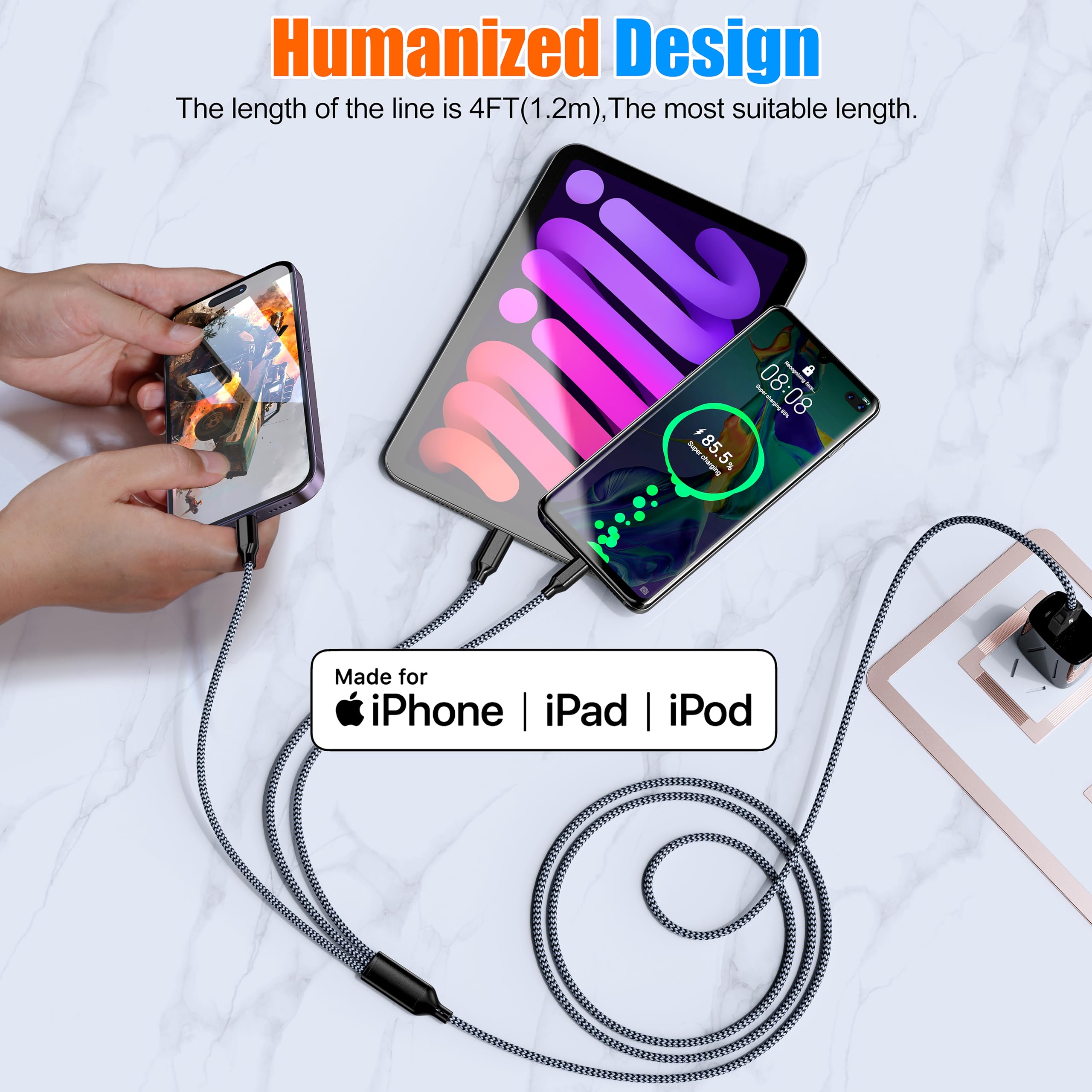 3 in 1 charging cable combines Lightning, Type-C, and Micro-USB connectors in one durable multi charging cable. Certified by MFi for safety, it delivers fast charging to iPhones, Androids, tablets, and more—perfect as multi chargers for all devices. The reinforced nylon braid prevents fraying, making it your ultimate multi phone chargers for all devices companion