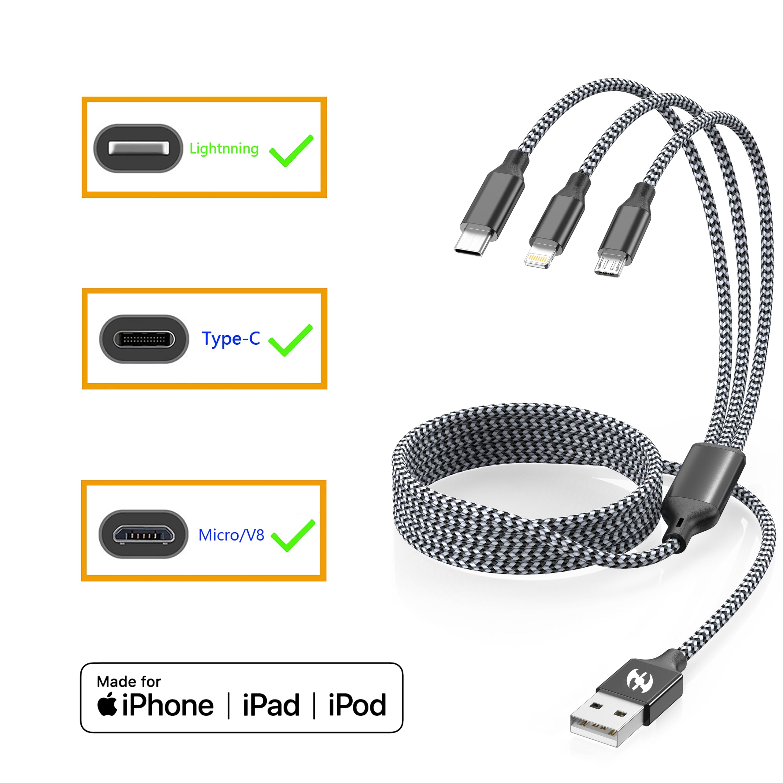 All-in-One Charging Revolution End cable chaos with our multi charging cable – 2ft multiple charger cable sets in one. Each 3 in 1 charger cable combines Lightning/Type-C/Micro-USB into a single triple charger cable. MFi-certified for safe fast charging, this rapid nylon braided cord outperforms standard phone chargers. Charge 3 devices simultaneously with this essential charging cable for multiple devices. Battle-Ready Durability Military-grade nylon braided cord withstands 15,000+ bends. Reinforced aluminum ends survive drops and tangles, unlike fragile charging cables. The multi head charging cable design features oval engineering to prevent knots. Perfect as phone chargers bulk solution for offices/events. Universal Power Hub One 3 way USB charging cable replaces nine single cords. This phone charger multiple devices hero works with iPhones, Androids, tablets, and more. Gold-plated connectors in this USB charging cable 3 in 1 ensure max 2.4A output per port. Never search for phone charger multiple ends again! Smart Features ✅ 3 charging cords in one: Lightning + Type-C + Micro-USB ✅Tangle-free oval design for multi cable charging cord ✅Fast charging multi charger cable (2.4A/core) ✅ Charger cord multiple ends fits all 5V adapters Why This 3-in-1 Wins ✅ Time Saver: Charge phones/tablets at once via three way charger ✅ Space Genius: Replace a drawer of charging cables with one tri charger cable ✅ Cost Smart: Durable multiple charging cable at 1/3 Apple cord cost ✅ Bulk Ready: Ideal phone chargers bulk for hotels/events Upgrade Now – Your charger cord with multiple ends solution awaits!