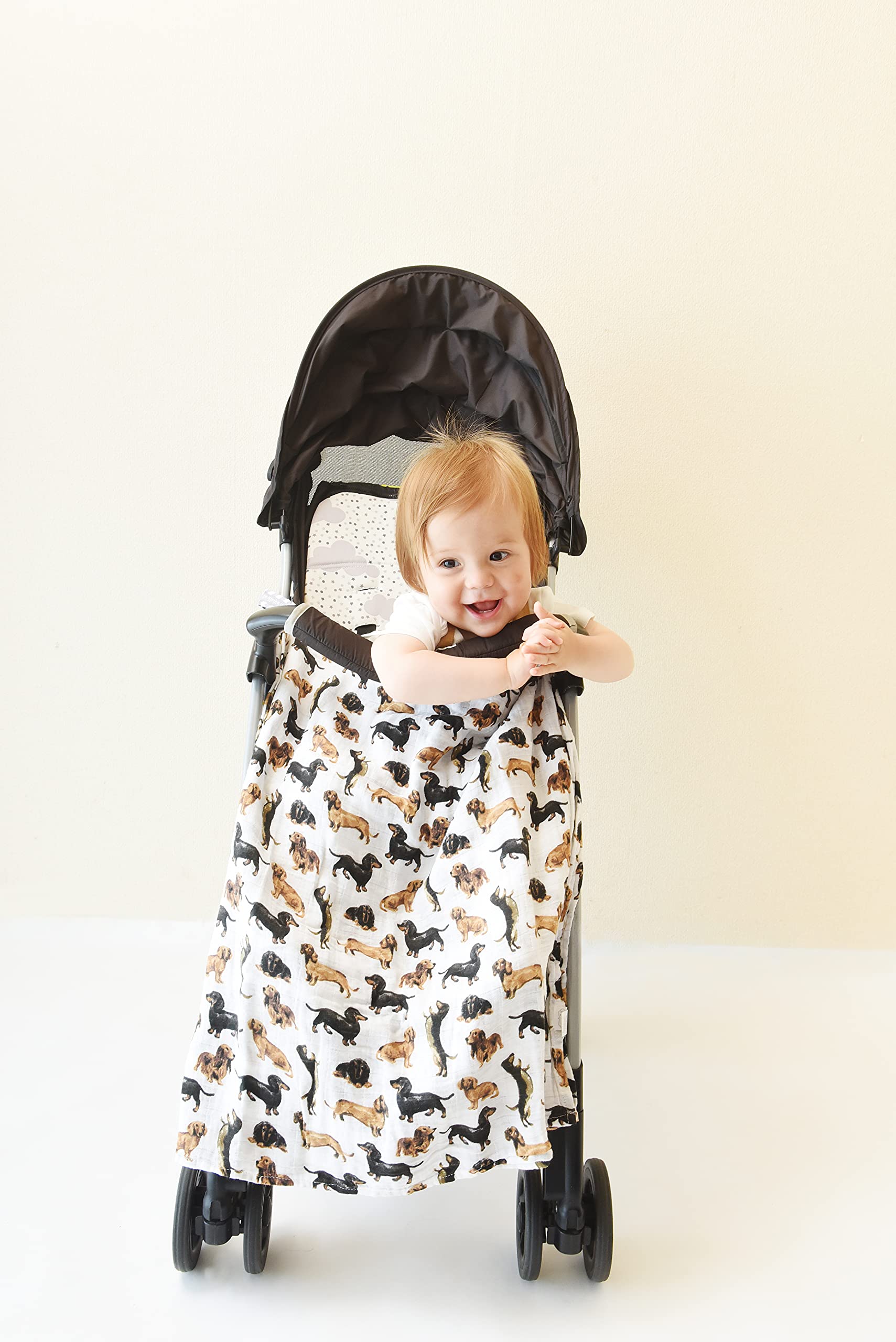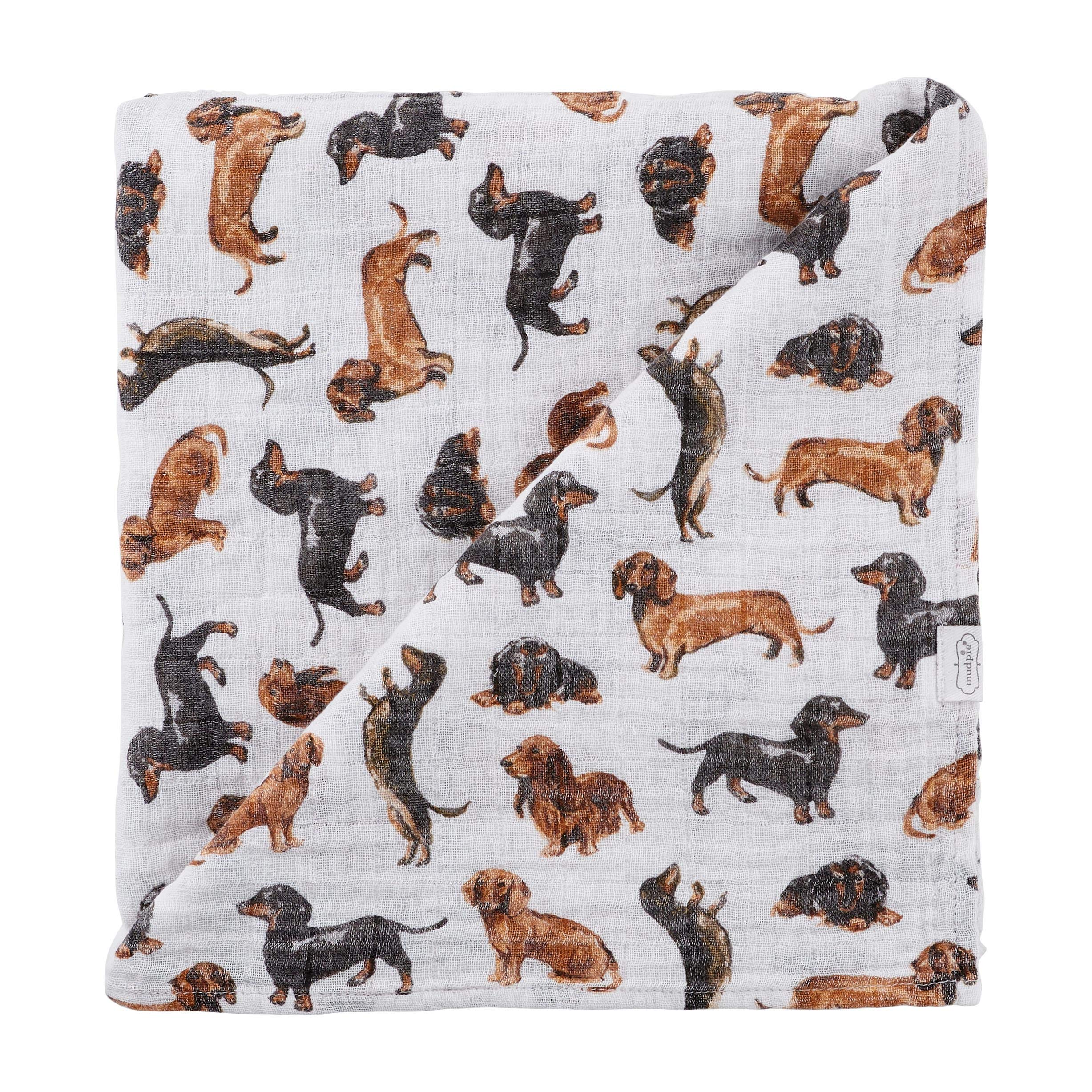 Generously sized square muslin swaddle blanket features original Mud Pie print and arrives in kraft gift box with hat ribbon handle. Blanket softens with every wash.