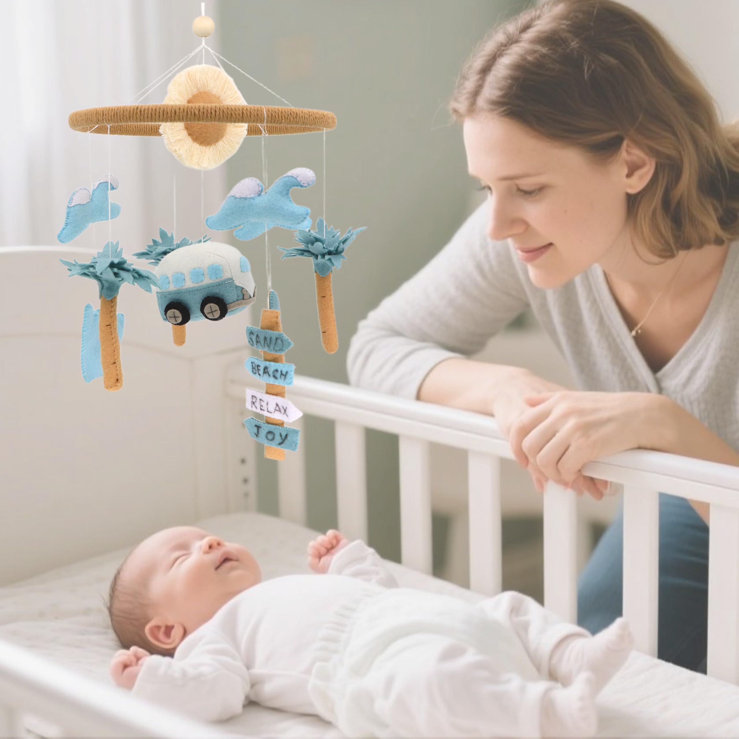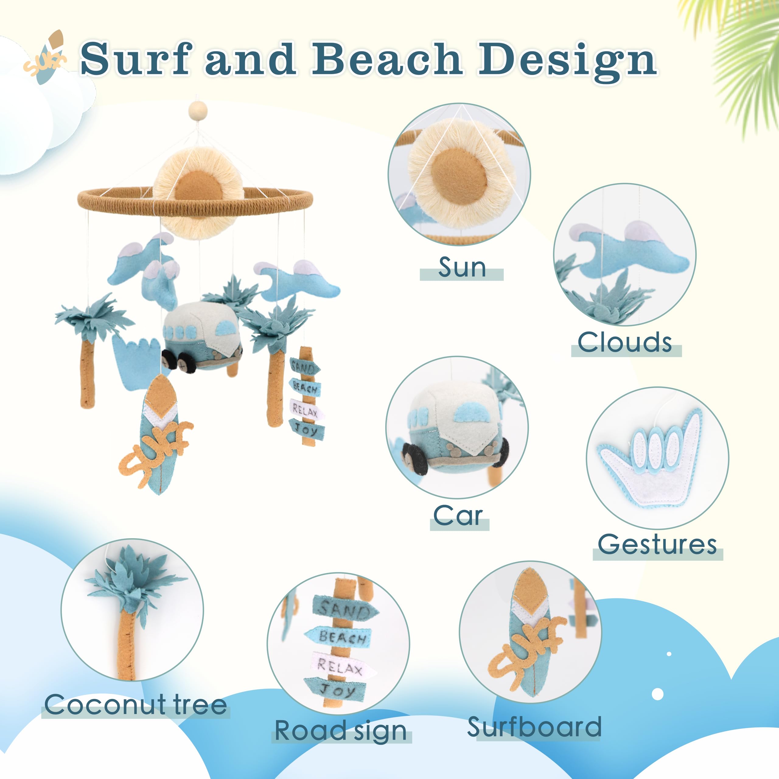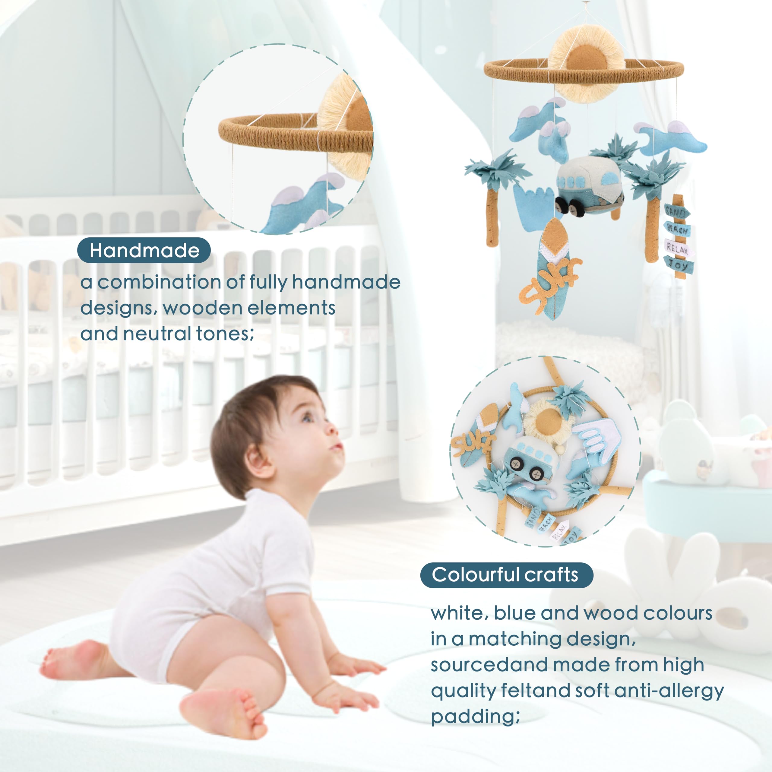 🌞Beach Vibes for Tiny Dreamers: Turn your nursery into a mini surf shack! Our surf mobile for crib features adorable Surf baby crib mobile elements—surfboards, suns, palm trees and bus—all crafted from soft felt and natural wood. The calming blue and white palette creates a soothing beach cruiser, perfect for lulling your little one to sleep while sparking their imagination. (Pro tip: Works great as a distraction during diaper changes too!)