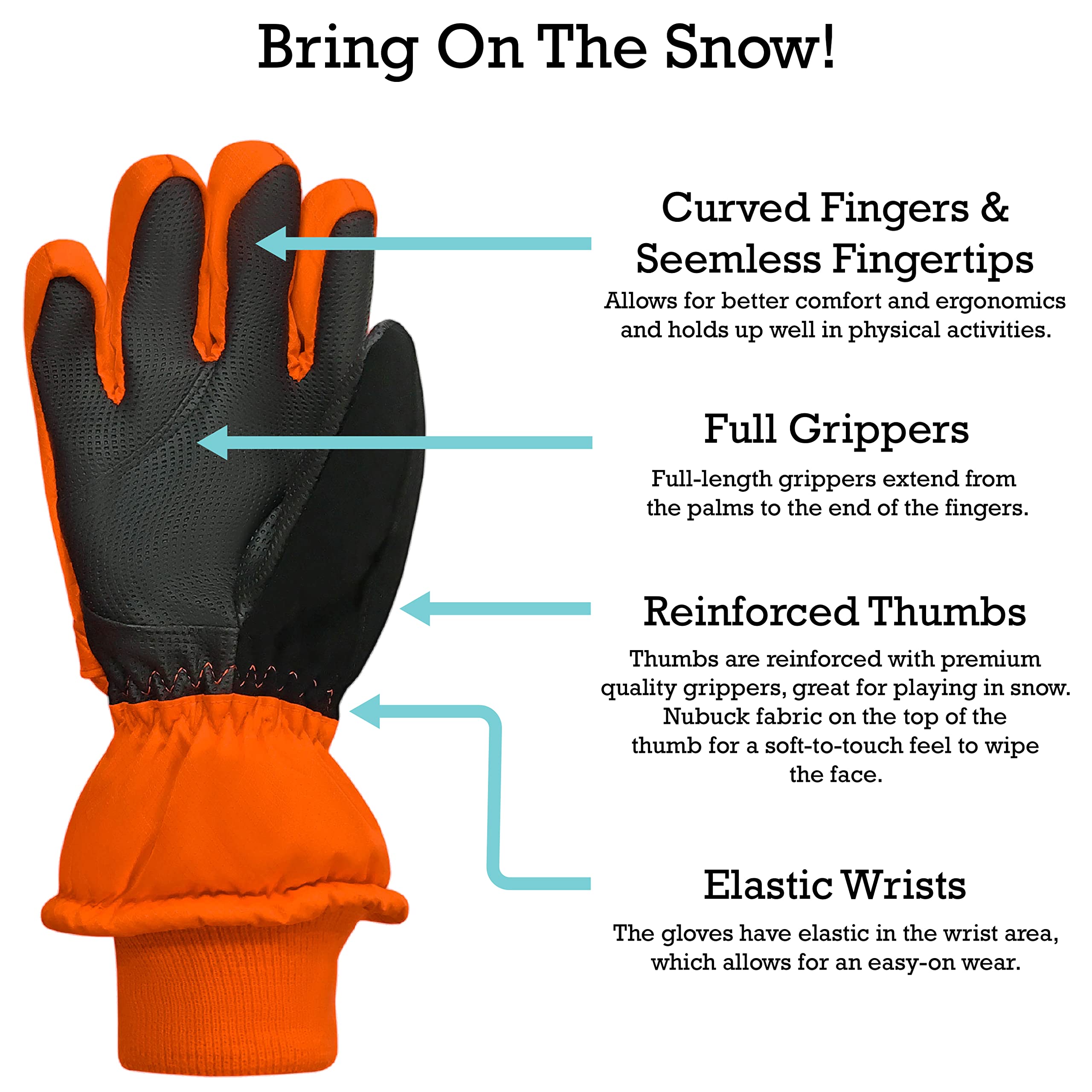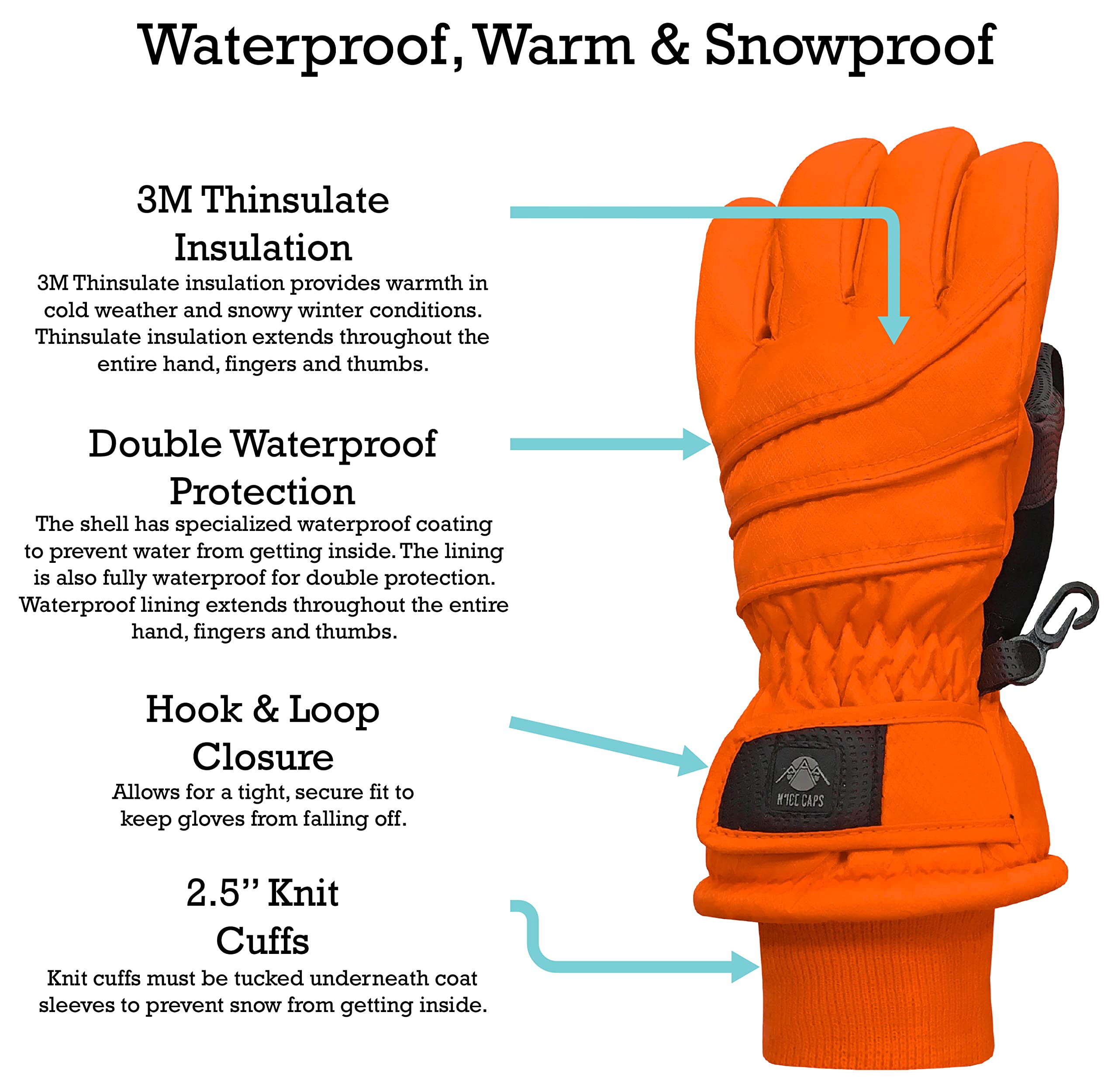 WATERPROOF, WARM AND SNOW-PROOF: The children's snow gloves are insulated with 3M Thinsulate for warmth in cold weather. The youth gloves are fully waterproof and keep hands dry in wet, snowy and icy conditions