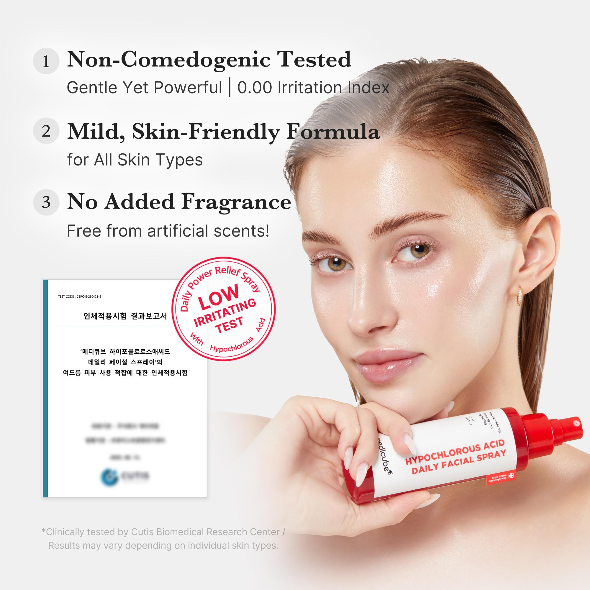 [Powered by Hypochlorous Acid] Naturally produced by the body’s immune system, HOCl helps soothe irritation, purify the skin, and support its natural defense barrier. *The above refers only to the characteristics of the raw materials.