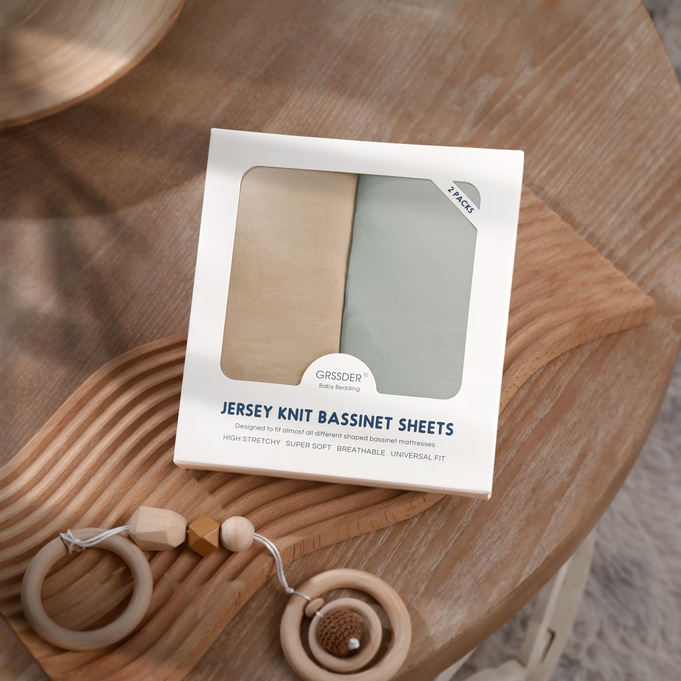 Bring home your little angel to a bassinet that's as sweet as they are with this 2 pack of bassinet sheet from GRSSDER. Neutral solid colors add the perfect touch of cuteness, and leave you open to a world of decorating possibilities for baby's room! Why choose GRSSDER bassinet sheet ? Soft and Breathy: Super soft jersey knit Our bassinet sheet sets are composed of stretchy, soft and breathable fabric, made from high quality jersey knit. Baby love our bassinet sheets, as they are safe, comfortable and super soft on baby's skin. Adaptable Elasticity: Fits multiple bassinet mattresses. GRSSDER bassinet sheets securely fit for any bassinet mattress ( including: oval, hourglass, cradle, and rectangular shapes). Not only does this allow our sheets to fit a wider selection of bassinet pads, but ensures the sheet will never come undone if your baby rolls around while atop the mattresses. pads, flat changing table pads, bassinet mattresses, and cradle mattresses. A Fit of Comfort: Snug & Sound. Thanks to the 360-degree elastic band, we created a sheet that will remain fit and snug all night long. Enabling you to rest assured that your baby is safe, snug and sound. Our feature ensures that there is no bunching, ill-fitting, or too- loose fit on our fitted bassinet sheets.