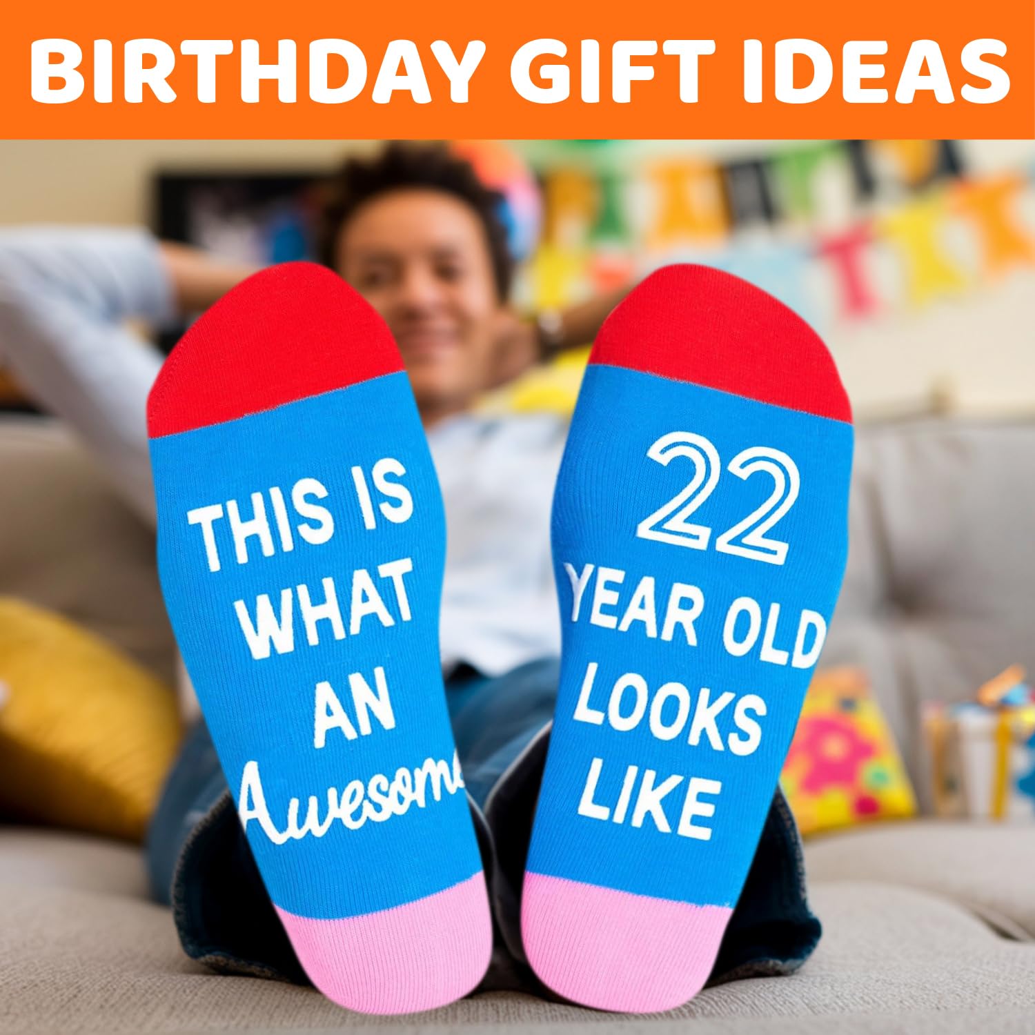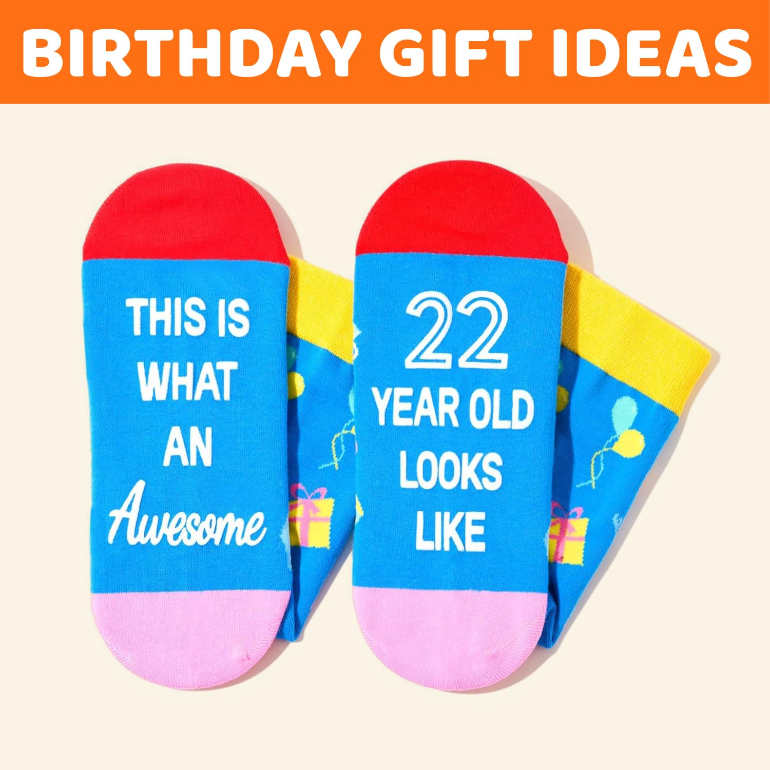 GIFTS FOR 22 YEAR OLDS: These socks feature birthday gifts, balloons, cakes, and other elements on the top, while the bottom features a hilarious secret message written in non-slip ink: "THIS IS WHAT AN Awesome 22 YEAR OLD LOOKS LIKE." They are suitable for any holiday gifts, such as Birthday gifts, Christmas gifts, or White Elephant gifts.