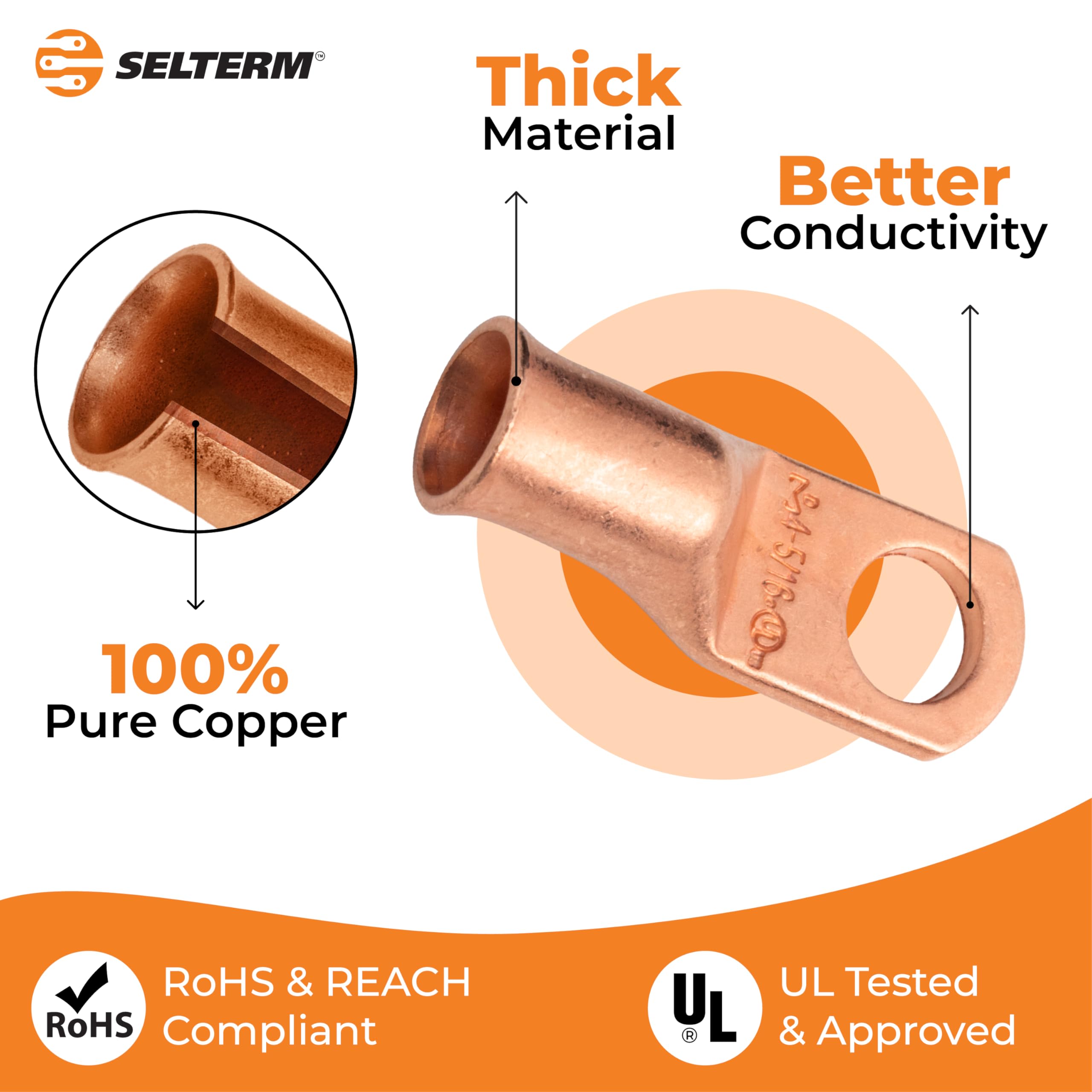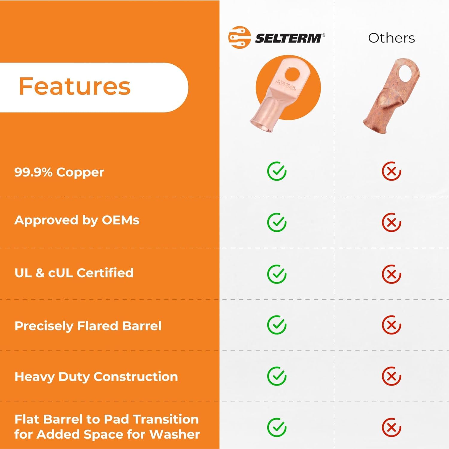PERFECT FIT: Selterm provides freedom to choose from a wide range of wire sizes, stud sizes, and pack quantities from 2 - 25 pcs. best suitable for all requirements and applications as battery connectors. Superior material quality of copper terminals lugs can be crimped or soldered. Use with a compatible copper cable; Audio wire may not be a direct fit. Recommend to check product dimensions to ensure a proper fit of the connectors.