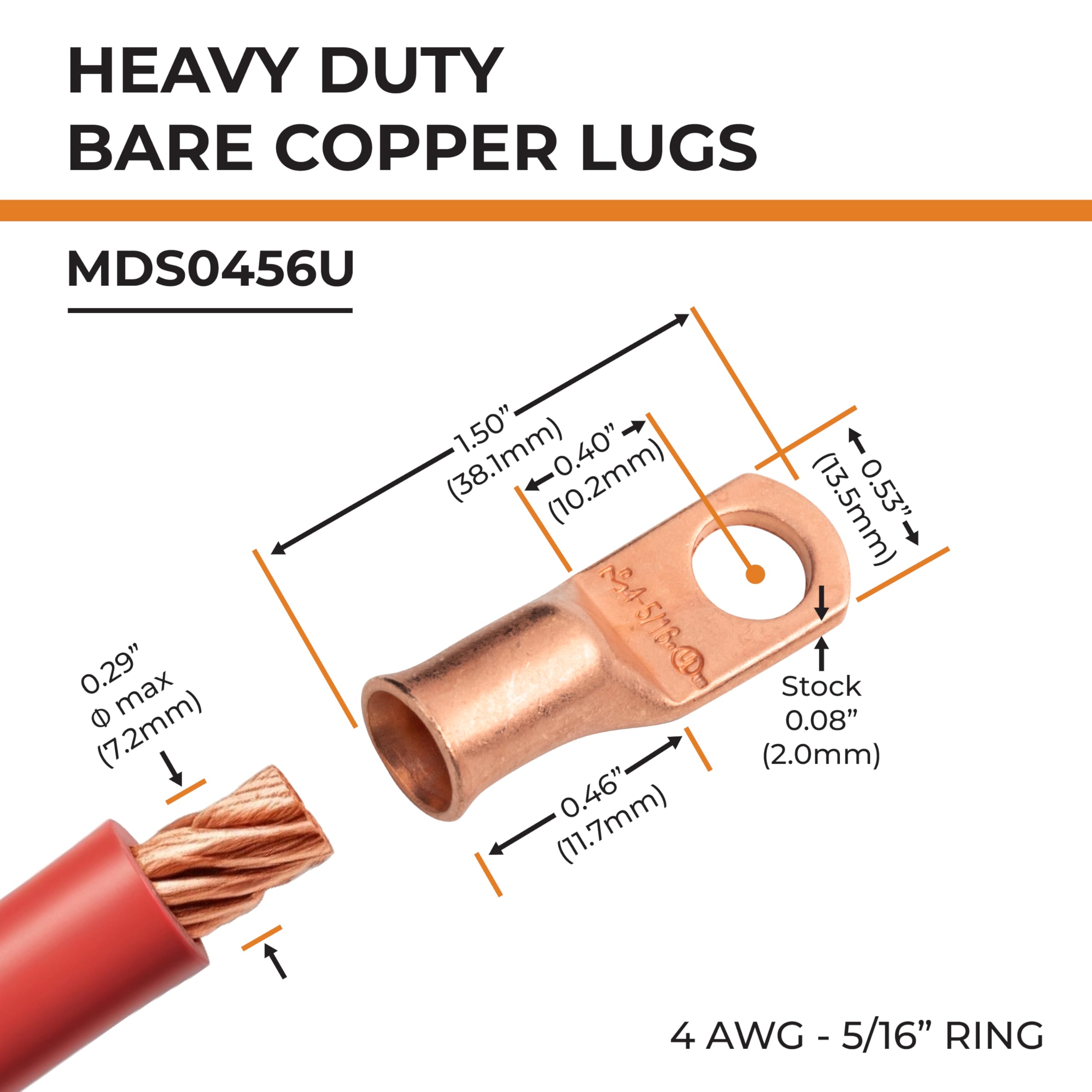PACKAGE CONTENTS: 25 PCS. of Heavy Duty Bare Copper 4 Gauge (AWG) 5/16" ring battery cable lugs / terminal connectors. 100% annealed copper, providing a high degree of conductivity for maximum current flow when used as battery terminals.