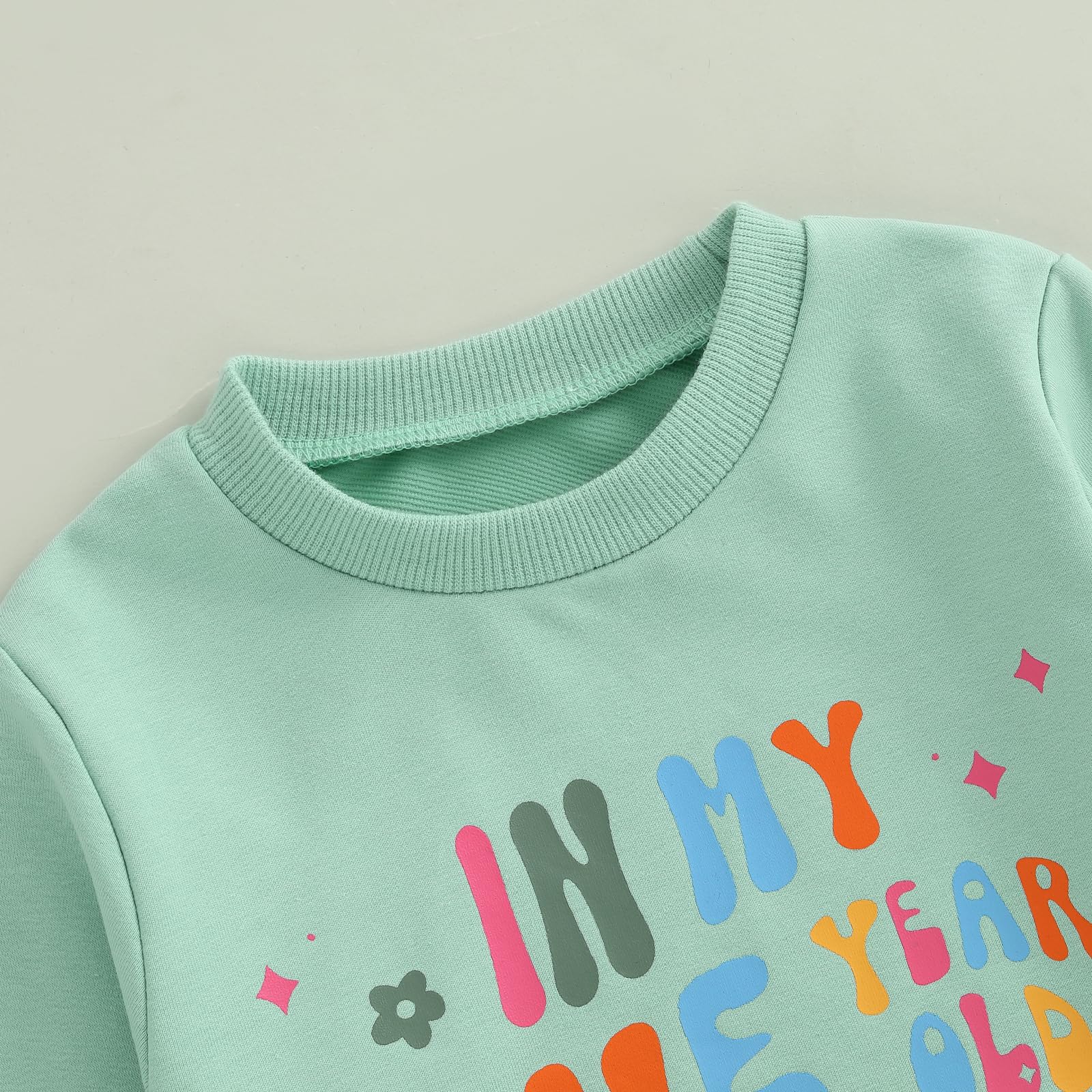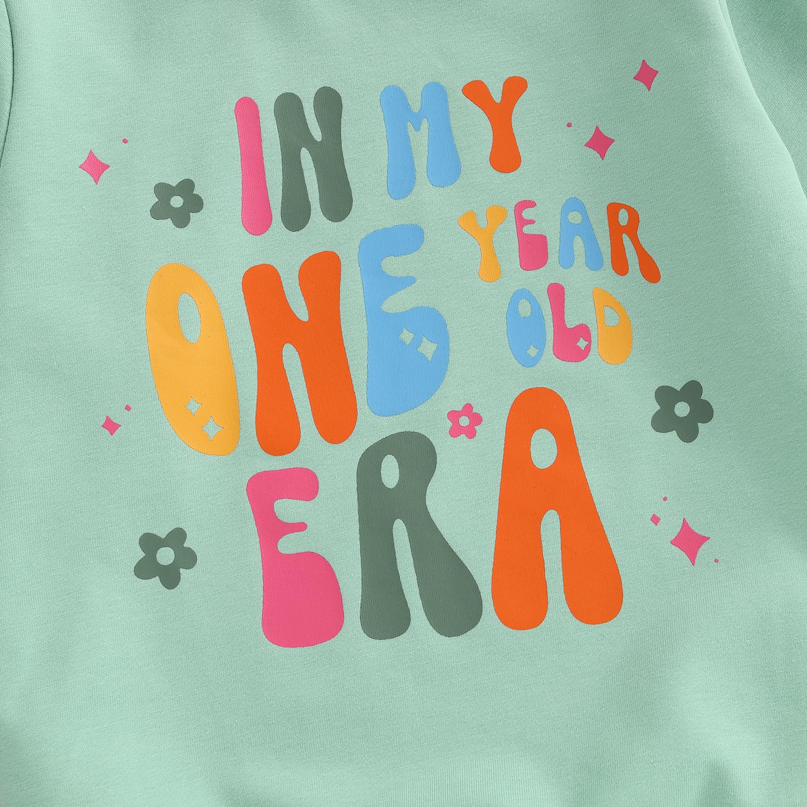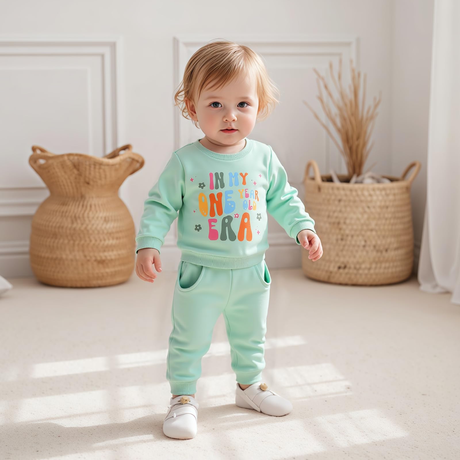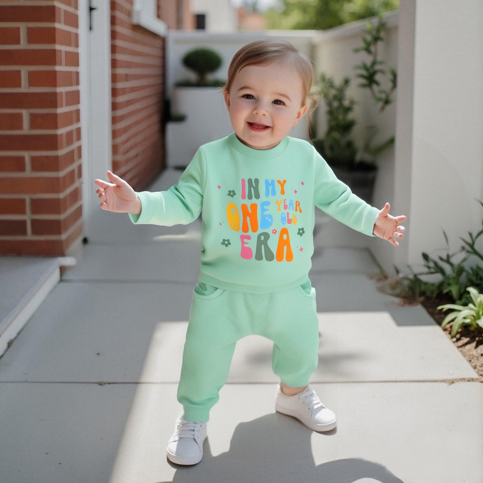 Design: Baby girl first birthday outfit, long sleeve, crewneck, in my one year old era print, 1st birthday sweatshirt, matching with elastic waist solid pants, very cute and trendy sweatsuit for spring,fall and winter, 1st birthday gifts girl, girls first birthday outfit