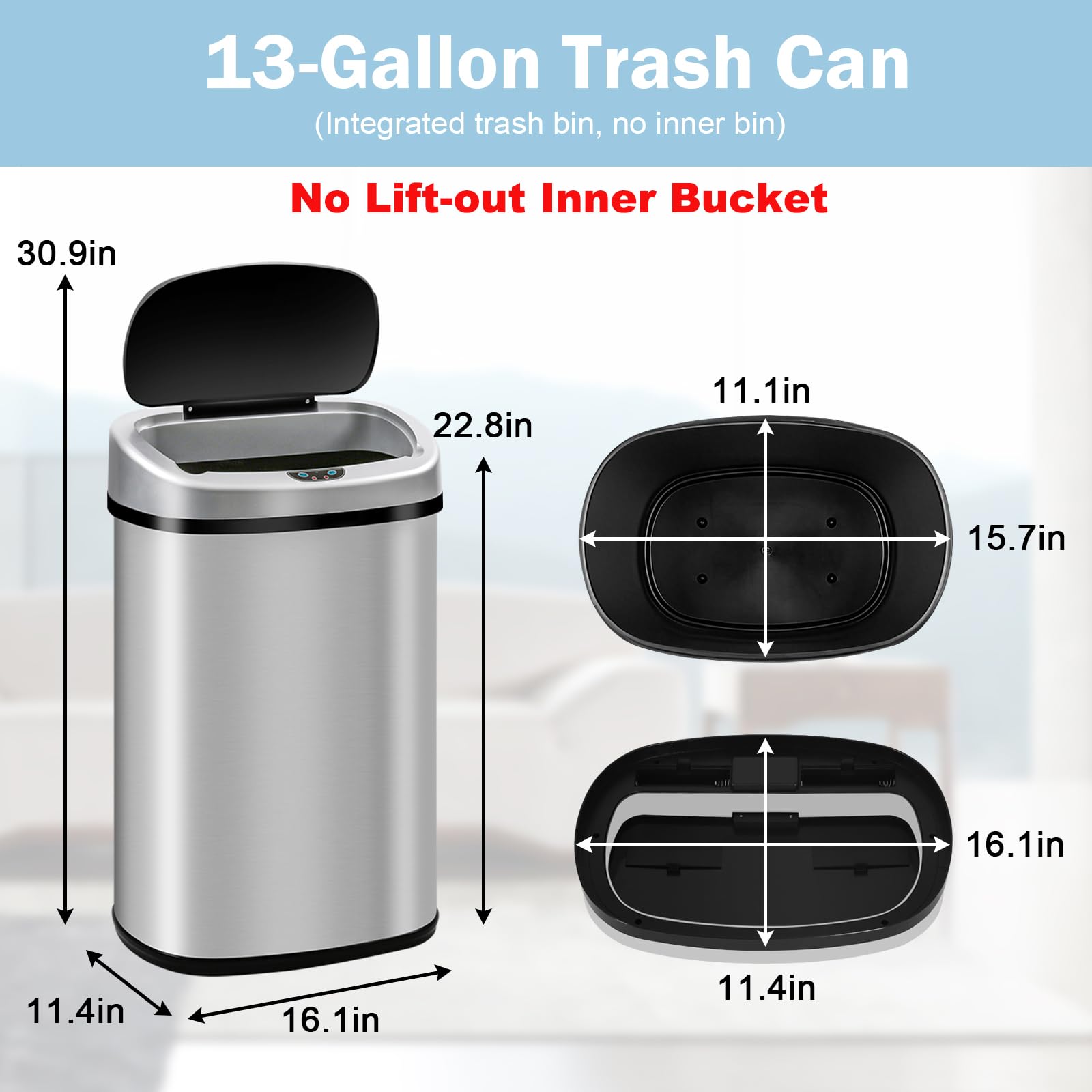 ABOUT OUR TRASH CAN SIZE: -- To make the trash can lighter and more compact, we didn't design the inner barrel. The 13 gallon trash can without an inner bucket will be shorter and small than the mainstream 13 gallon trash can with an inner bucket on the market. If you like our automatic trash can style, please reconsider whether you can accept its short size before you buy it