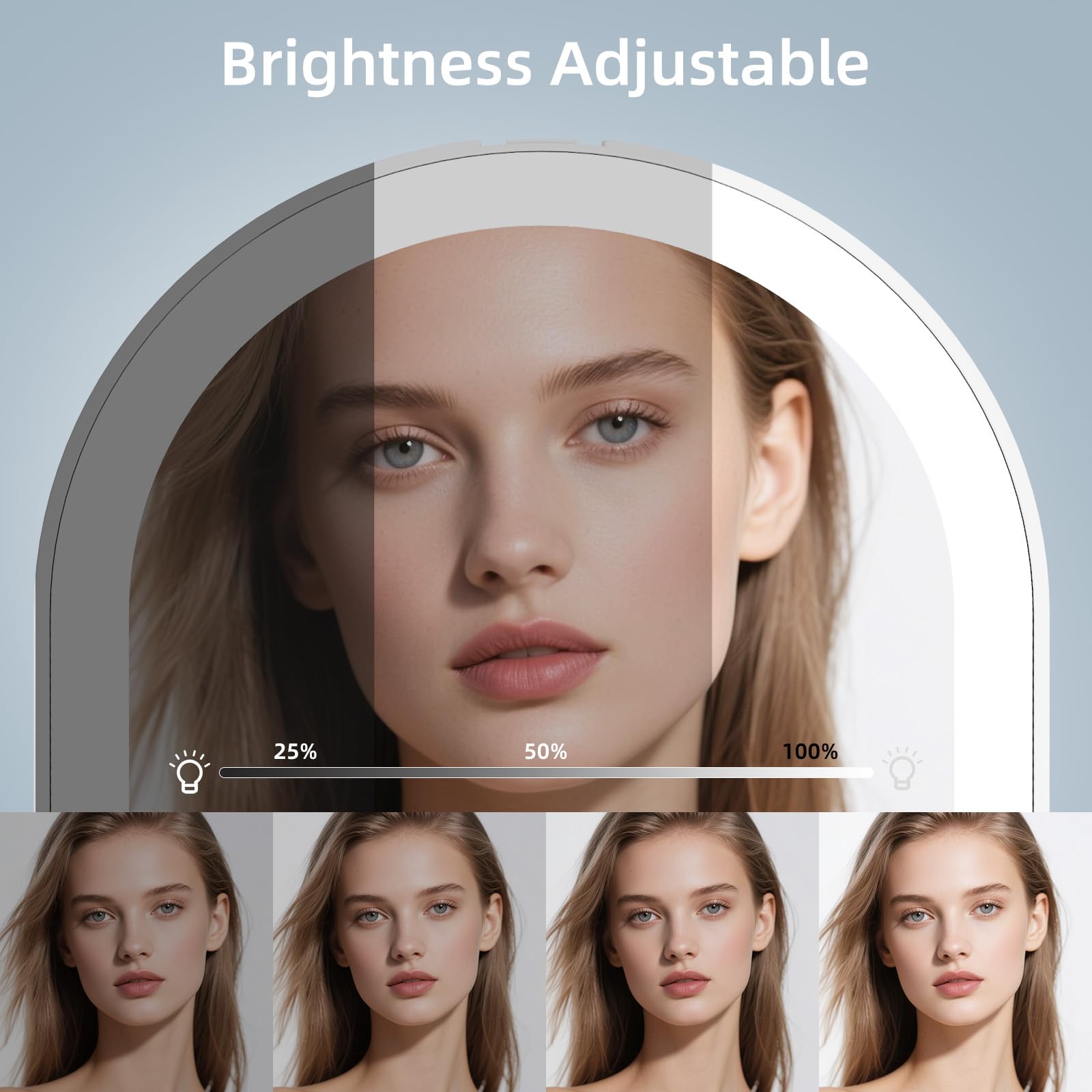 Travel Size Makeup Mirror:This portable rechargeable mirror in arch design with lights is 5.1*8IN 400g,just a ultra-thin Ipad Mini Size.Easily fits in travel bag, and is an ideal portable makeup Mirror for travel.Just take it easy on the go
