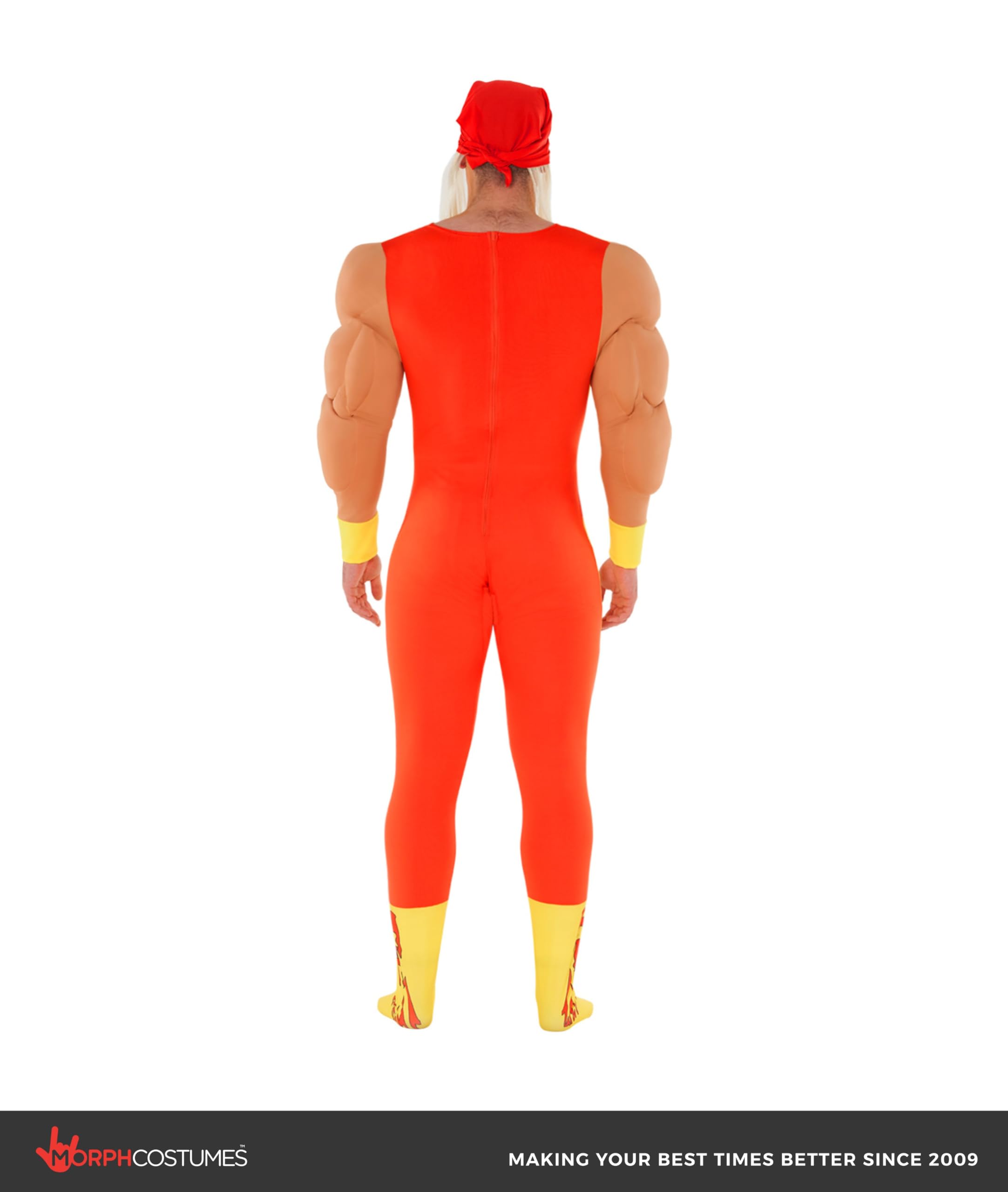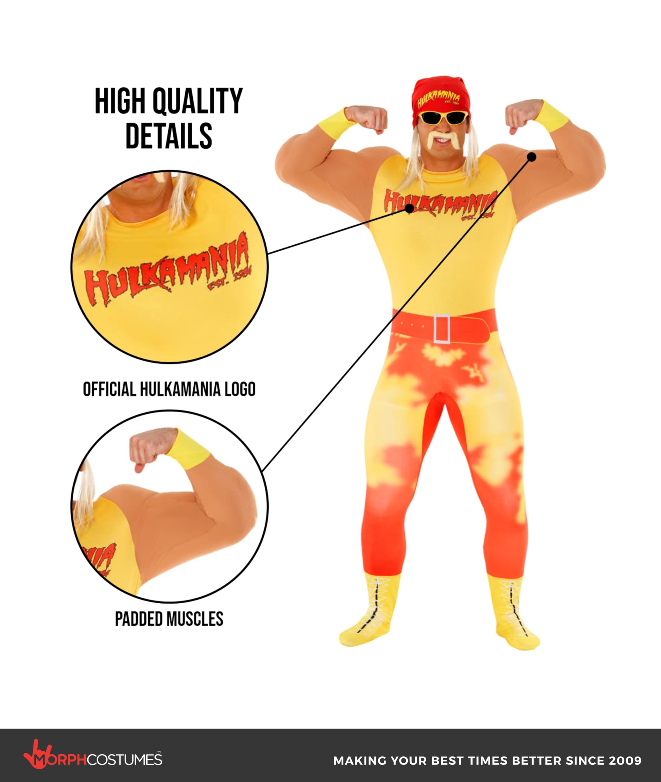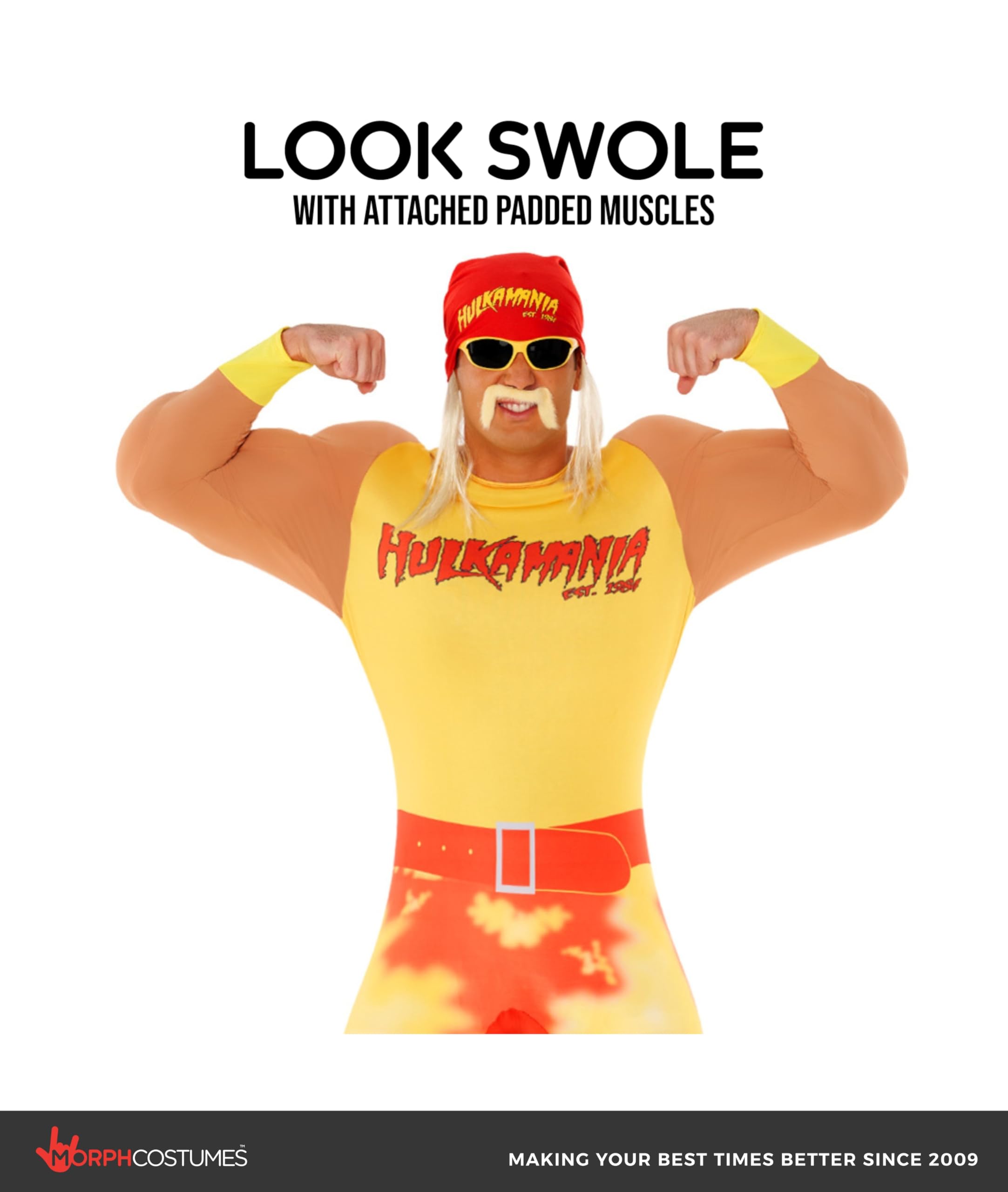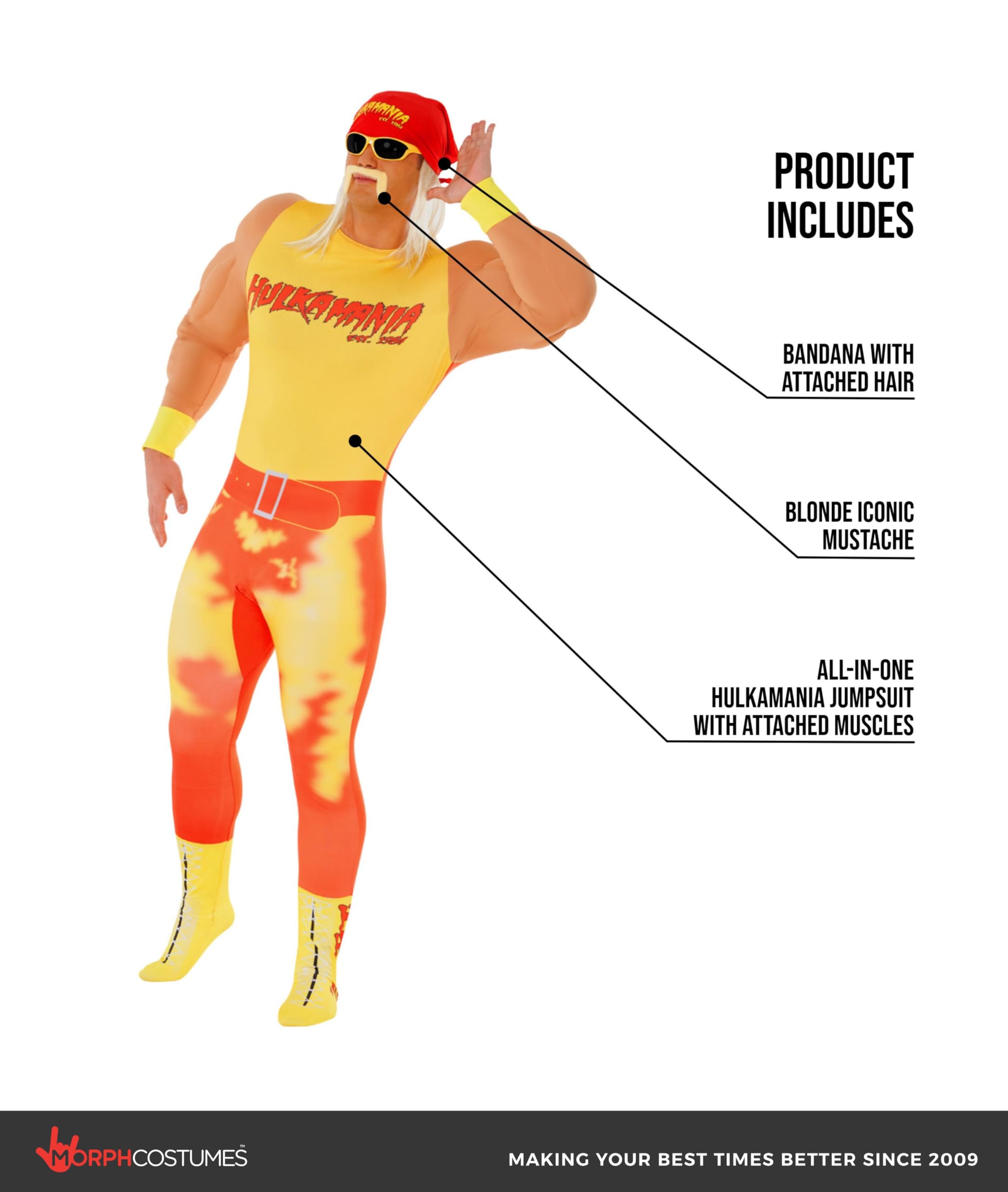 Authentic Hulkamania look: Includes a vibrant all-in-one jumpsuit with attached padded muscles, wrist cuffs, a classic “Hulkamania” bandana with blonde hair, and Hulk Hogan’s iconic blonde moustache. (Sunglasses not included.)