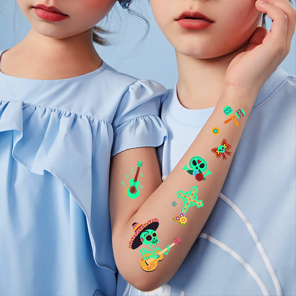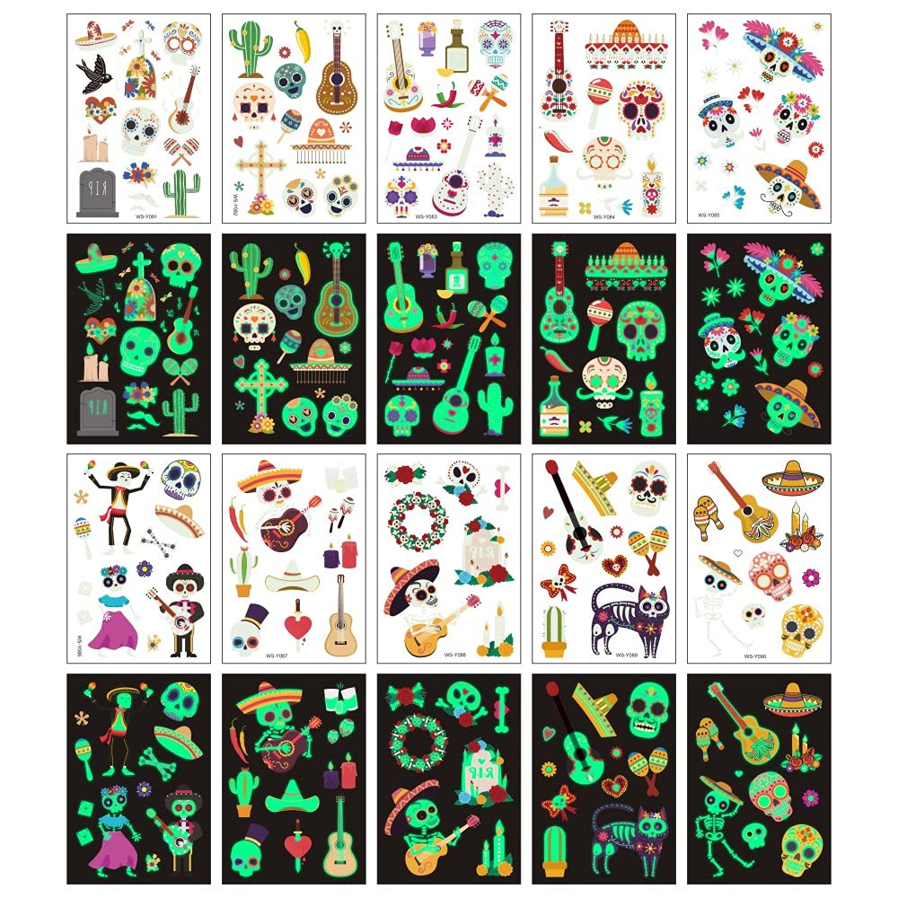 A suit includes 4.3*2.95 inches 10 sheets 100 pieces luminous day of the dead temporary tattoos for kids How to use your temporary tattoo? 1 Decide where you want to apply the tattoo.Make sure your skin clean and dry before application. 2 Cut the tattoo out as close to the edge as possible. 3 Remove the protective transparent sheet and place the design face down onto the desired area. 4 Wet the paper with the wet towel firmly or sponge and wait 30 seconds. 5 Carefully remove the tattoo paper to check if it has transferred,if not press little longer.Be sure not to twist or stretch the skin until the tattoo had time to set. How to remove: When removing the tattoo, you can use alcohol, baby oil or makeup remover, soak the temporary tattoo for a few minutes, and then gently wipe it until it is removed. Note: It is not suitable for sensitive skin or skin allergic to adhesives. If you feel unwell, please stop using temporary tattoos immediately. Prompt: We recommend that you clean the place where you want to stick the tattoo to make it more realistic. If you lightly apply baby powder on the tattoo area with a makeup brush, the temporary tattoo will last longer. Avoid rubbing or scrubbing the tattoo area when taking a bath, otherwise the tattoo will fall off quickly, shortening the use time.