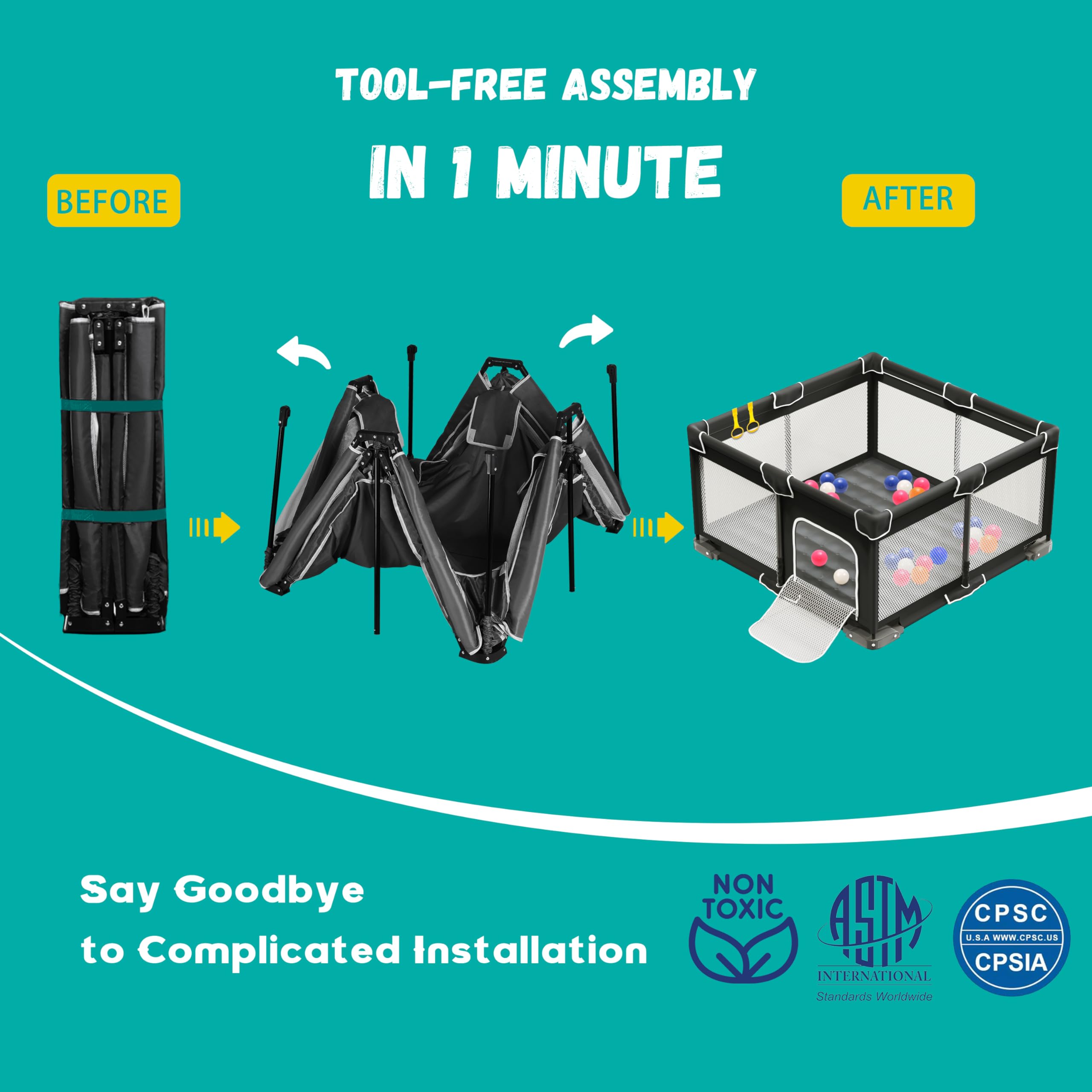 Easy to Assemble: Unlike other playpens, our baby playpen foldable has been upgraded for effortless assembly and disassembly, requiring no tools at all. You can complete the setup in just 1 to 3 minutes by yourself
