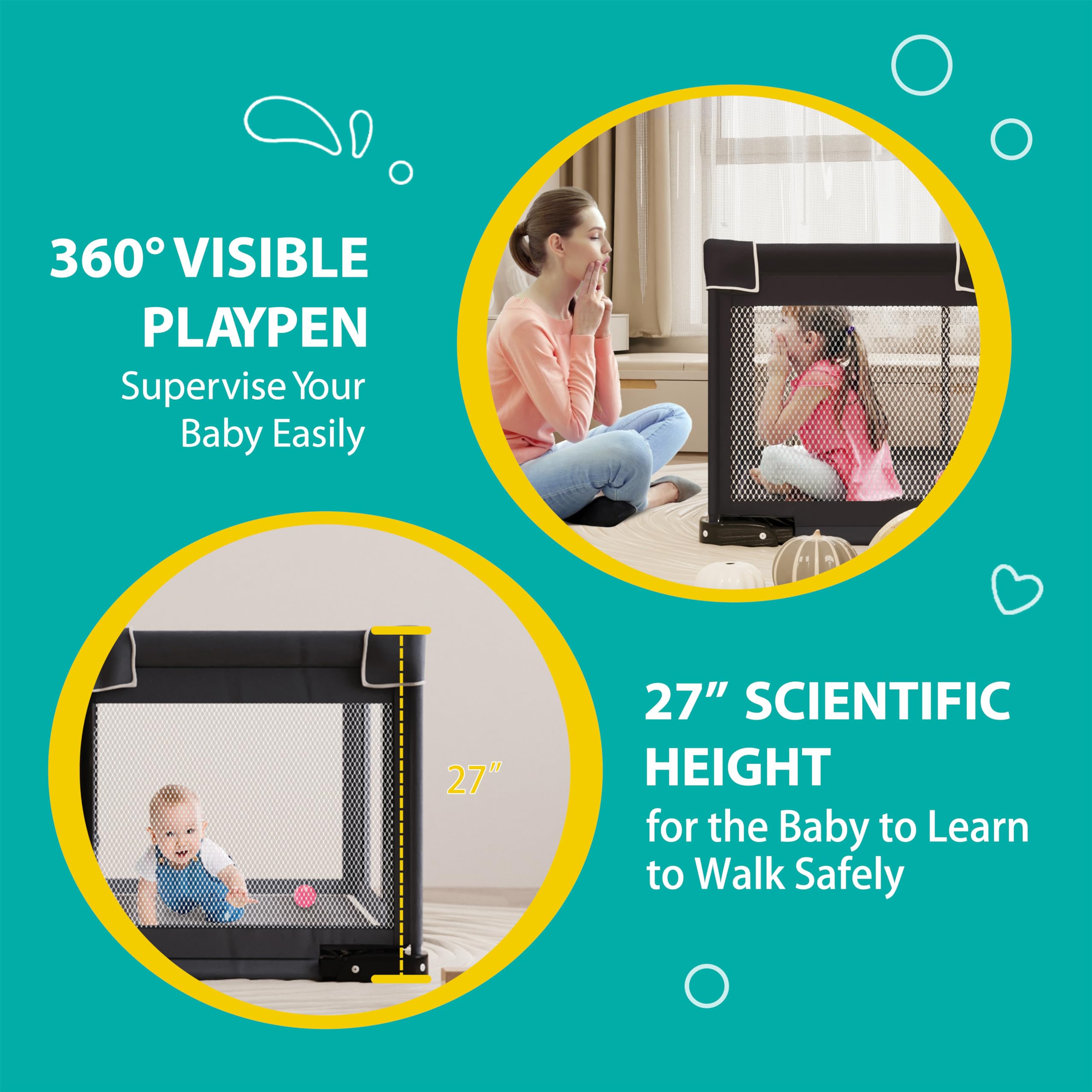 Free Parents' Hands: The ICAREWAY baby play pen foldable offers a generous space for your little ones to explore, play, and practice independent movement while ensuring their safety from potential hazards. With two pull-up rings and an ergonomically designed height(27"), this playpen aids your babies in learning to stand and walk, giving parents the freedom to tackle their own tasks or enjoy a well-deserved break