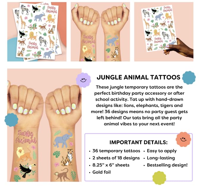 Jungle Tattoos For The Whole Party: two sheets with a total of 36 colored + metallic tattoos featuring handdrawn designs of monkeys, zebras + tigers with super cute additional toucans and lions that guests will love!