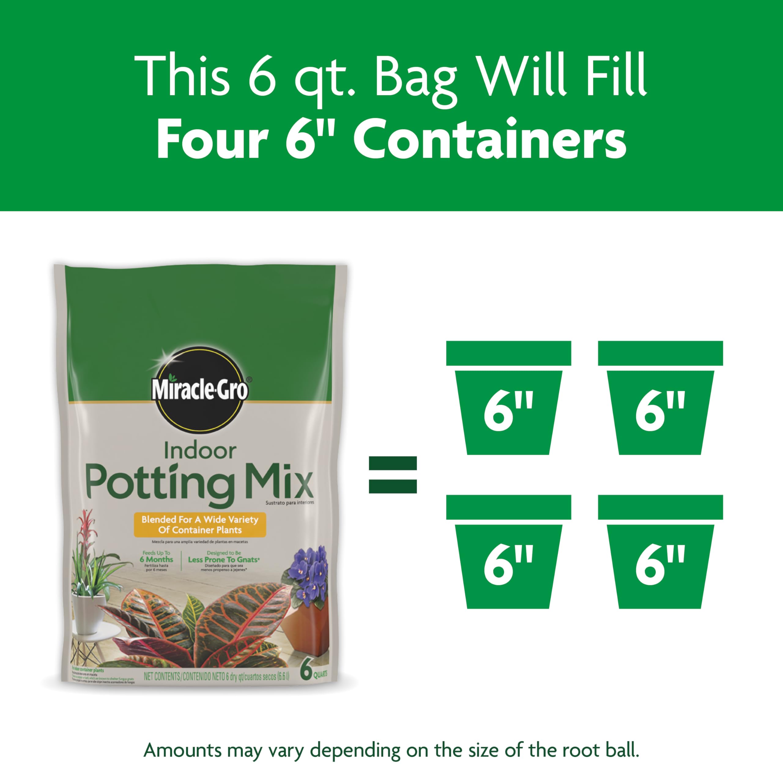 What's included: This bundle includes two 6 qt. bags of Miracle-Gro Indoor Potting Mix, each able to fill four 6-inch containers (exact amount may vary based on the root ball size)