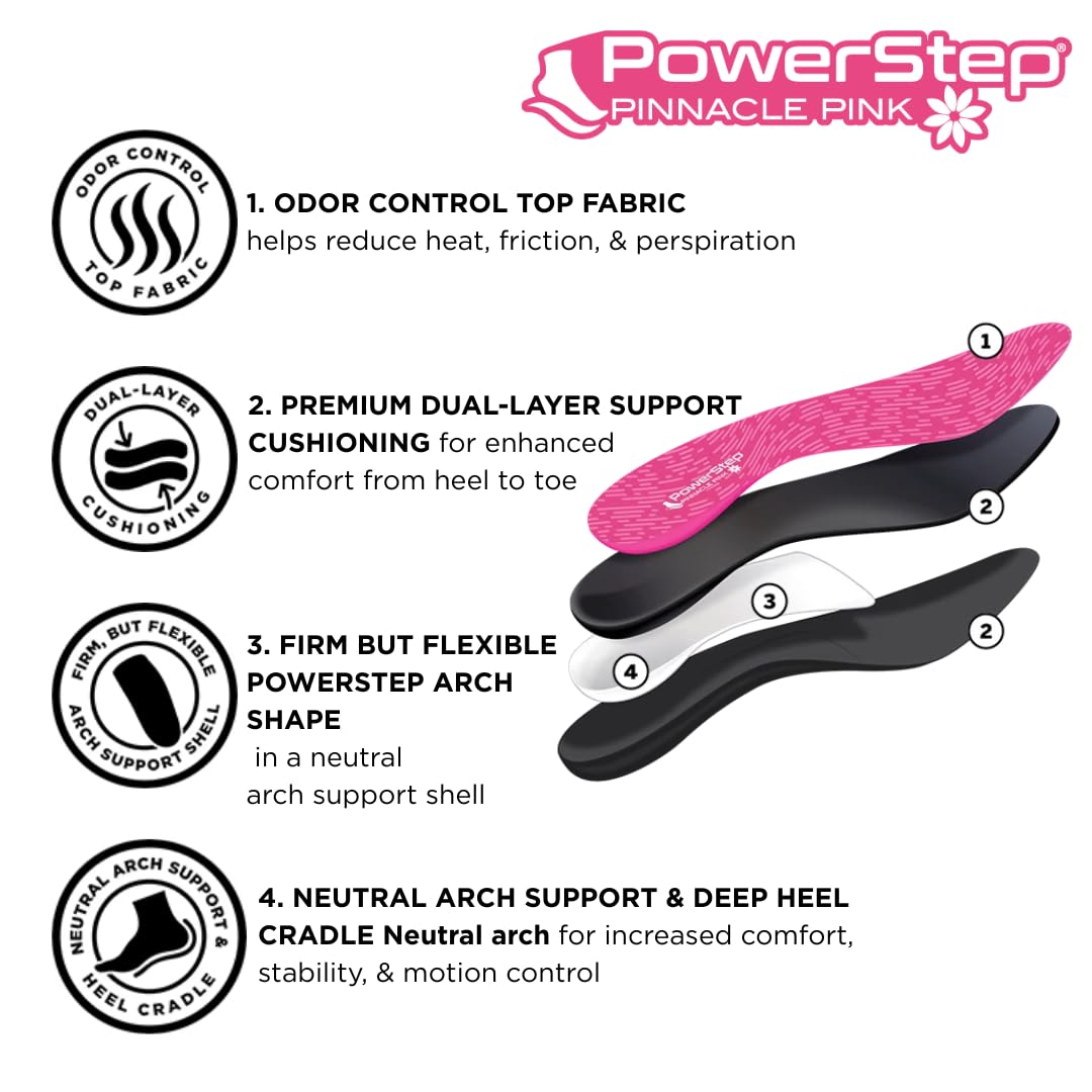 PowerStep Pinnacle Pink Insole features the Proven PowerStep Arch Shape which Cradles the Arch and Heel, Adding Stability and Motion Control. Built-in Neutral Arch Support and Dual-Layer Cushioning are the Perfect Balance of Comfort and Support