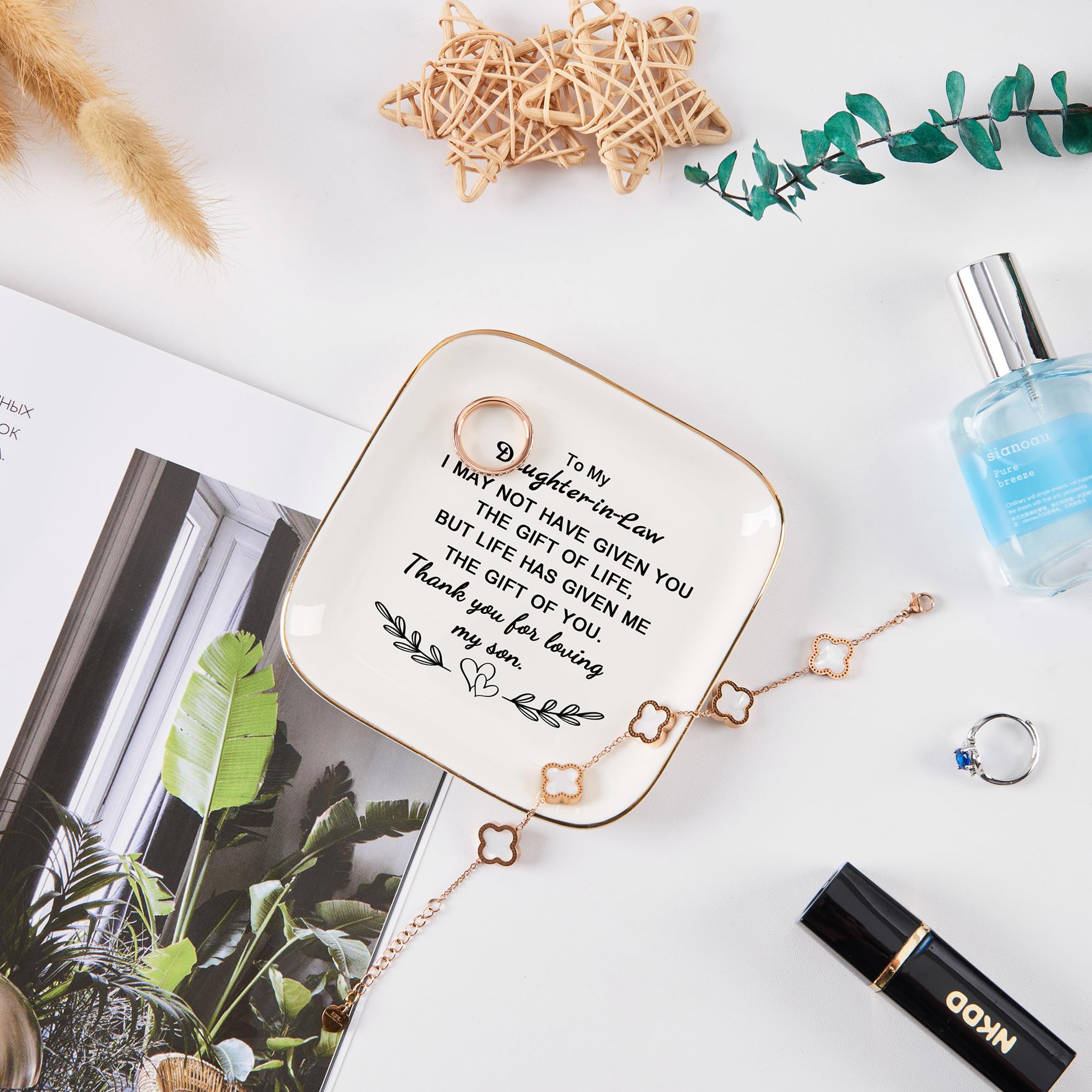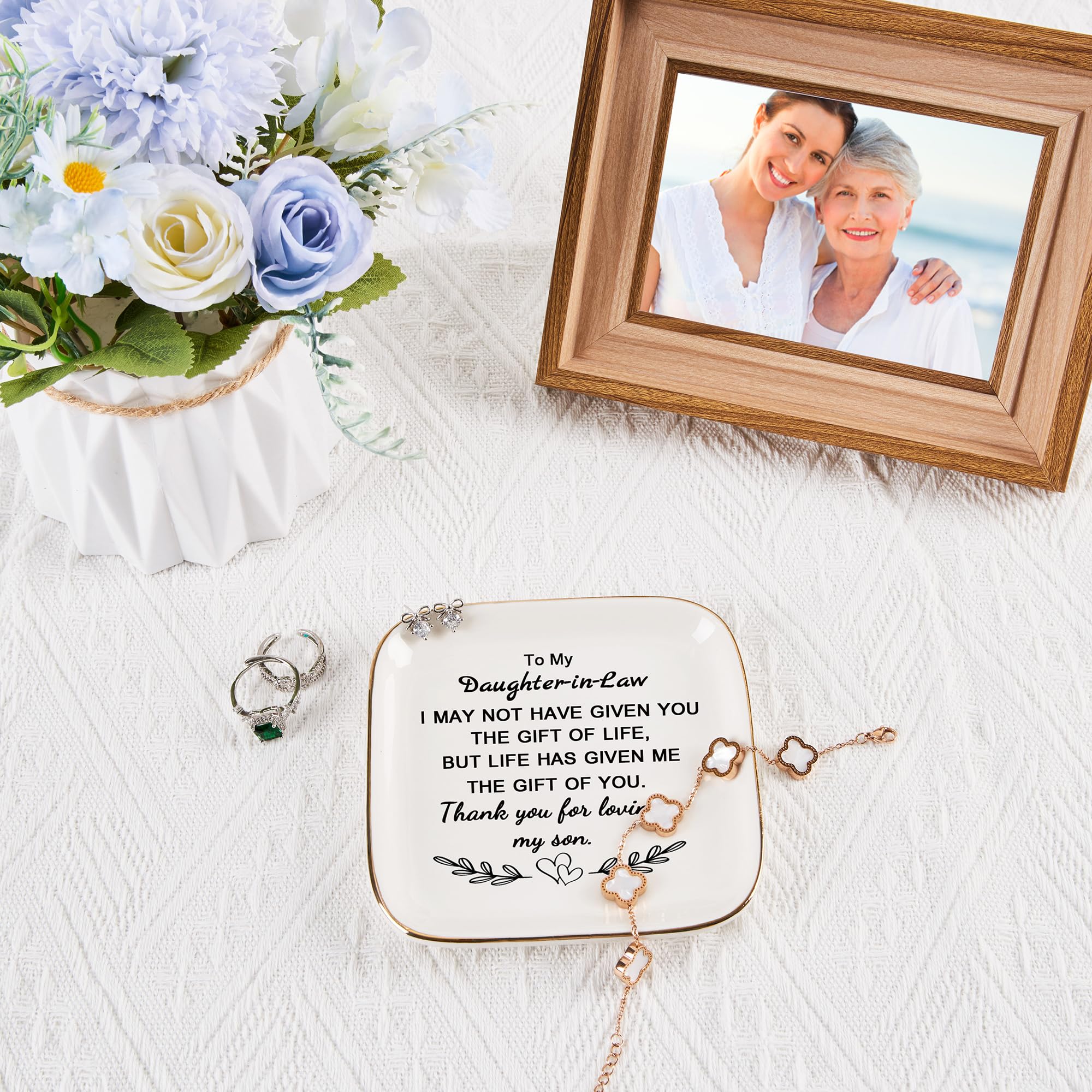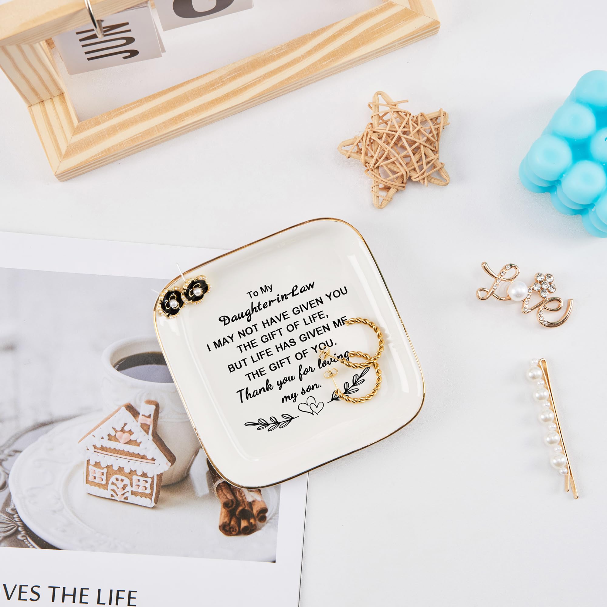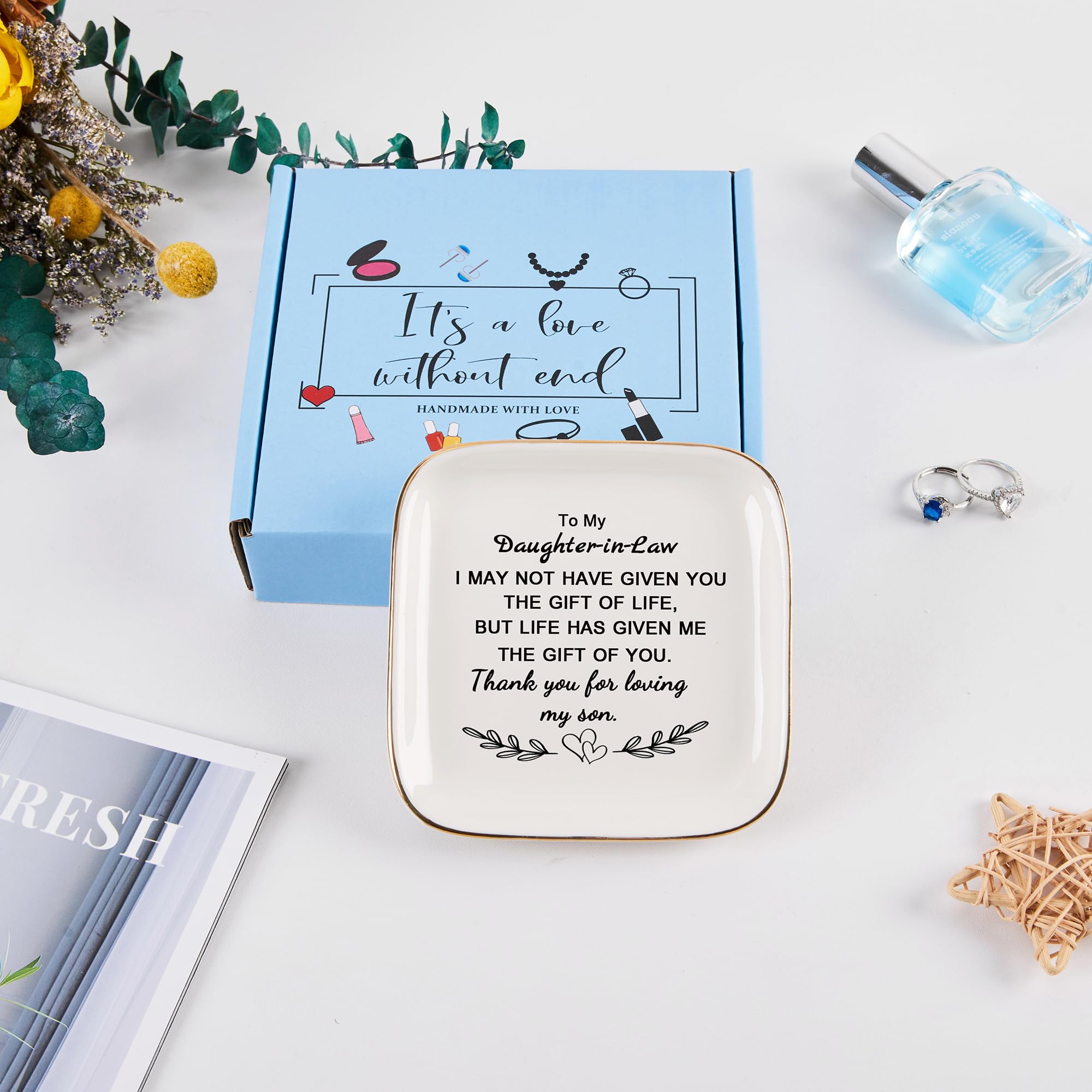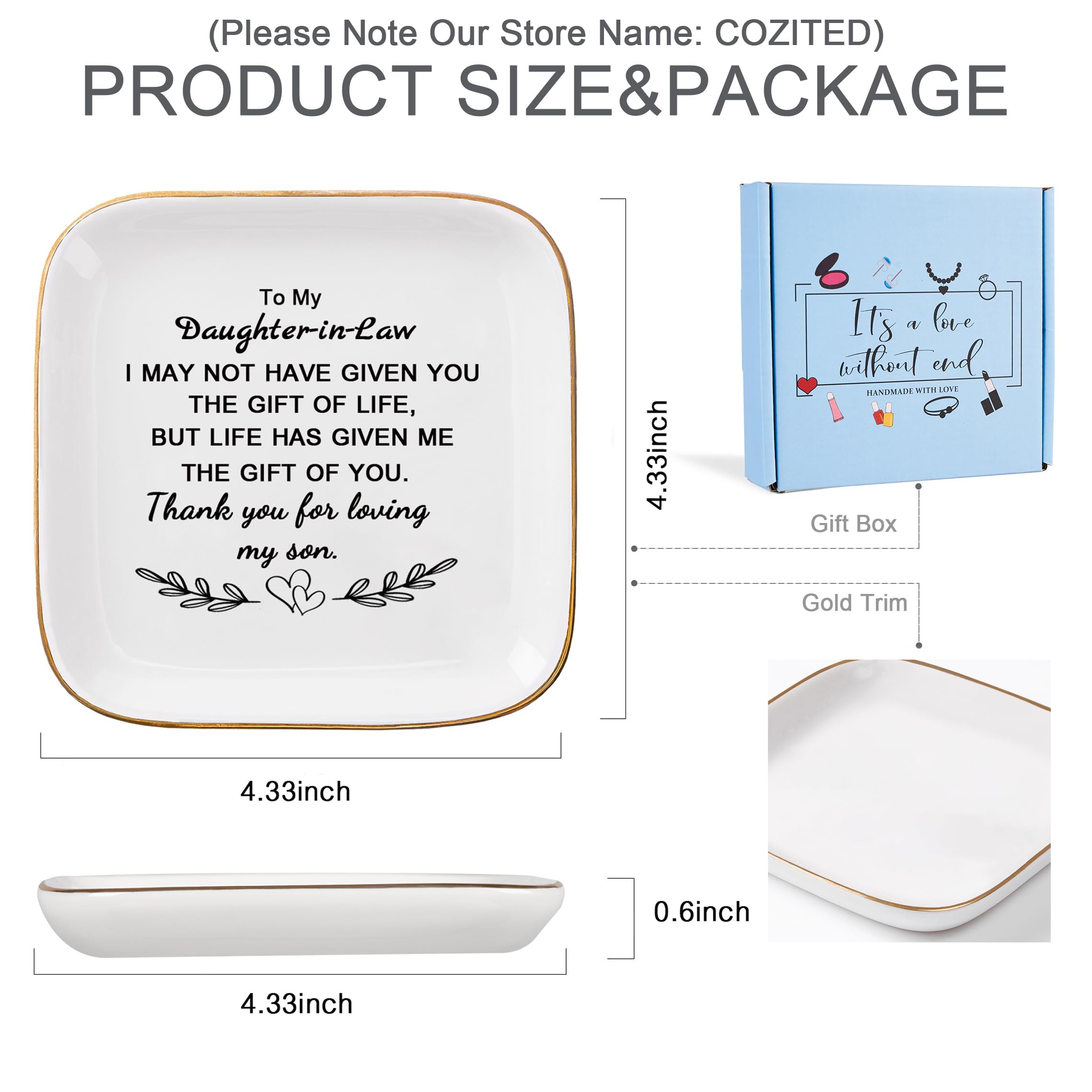 Size: Great size 4.33" L x 4.33" W x 0.6" H, a stylish and elegant jewelry dish that keeps your daughter in law's everyday jewelry organized and reminds her how much you love and care about her. COZITED Package: In A Blue Gift Box (Please Note That)